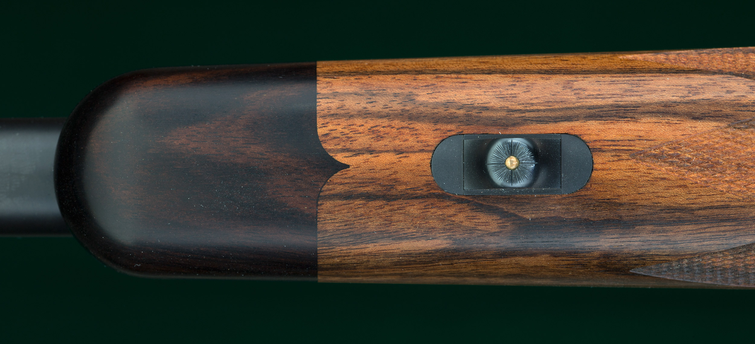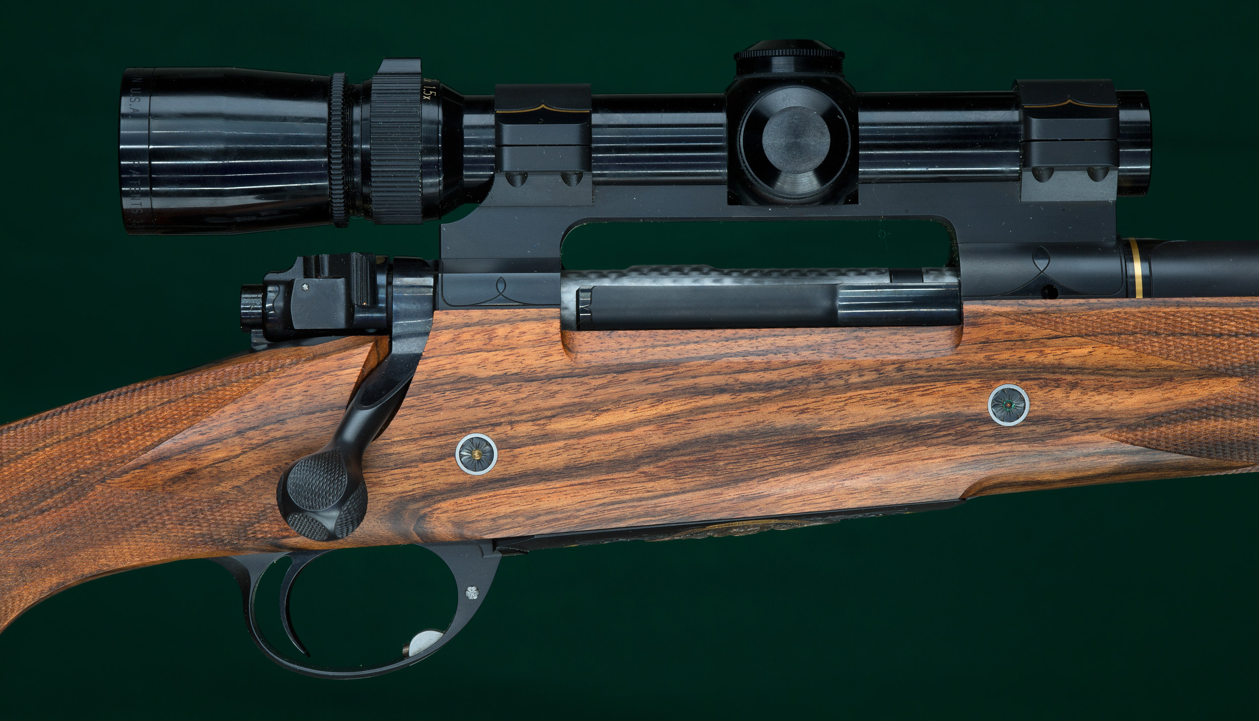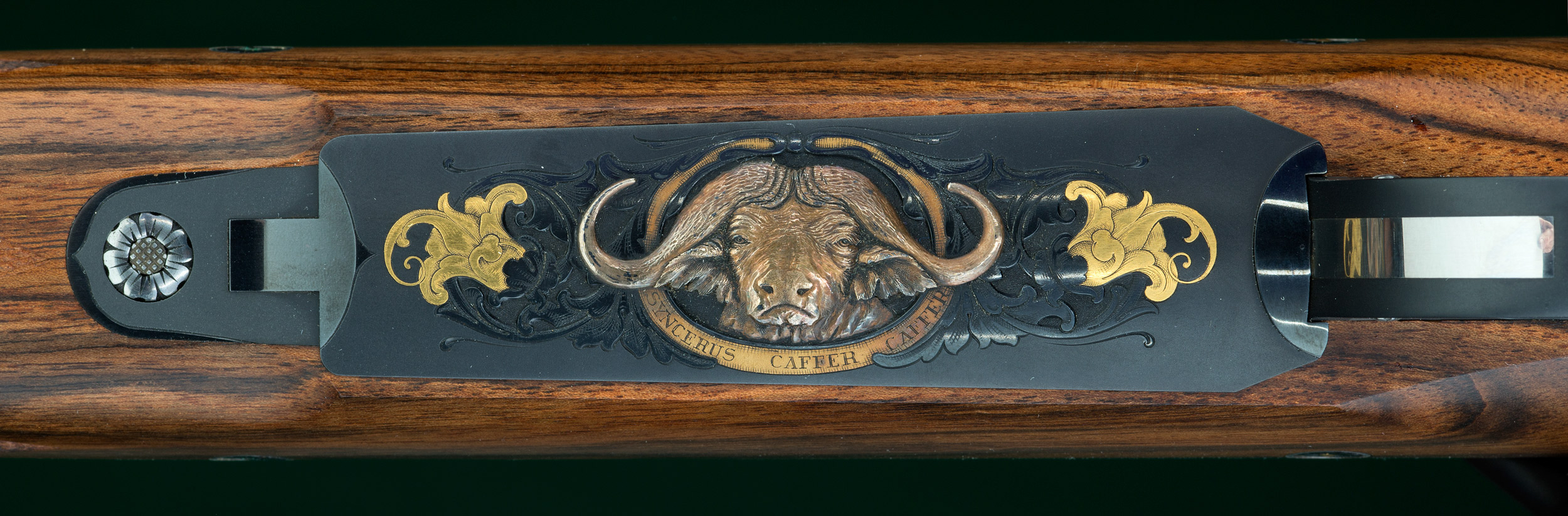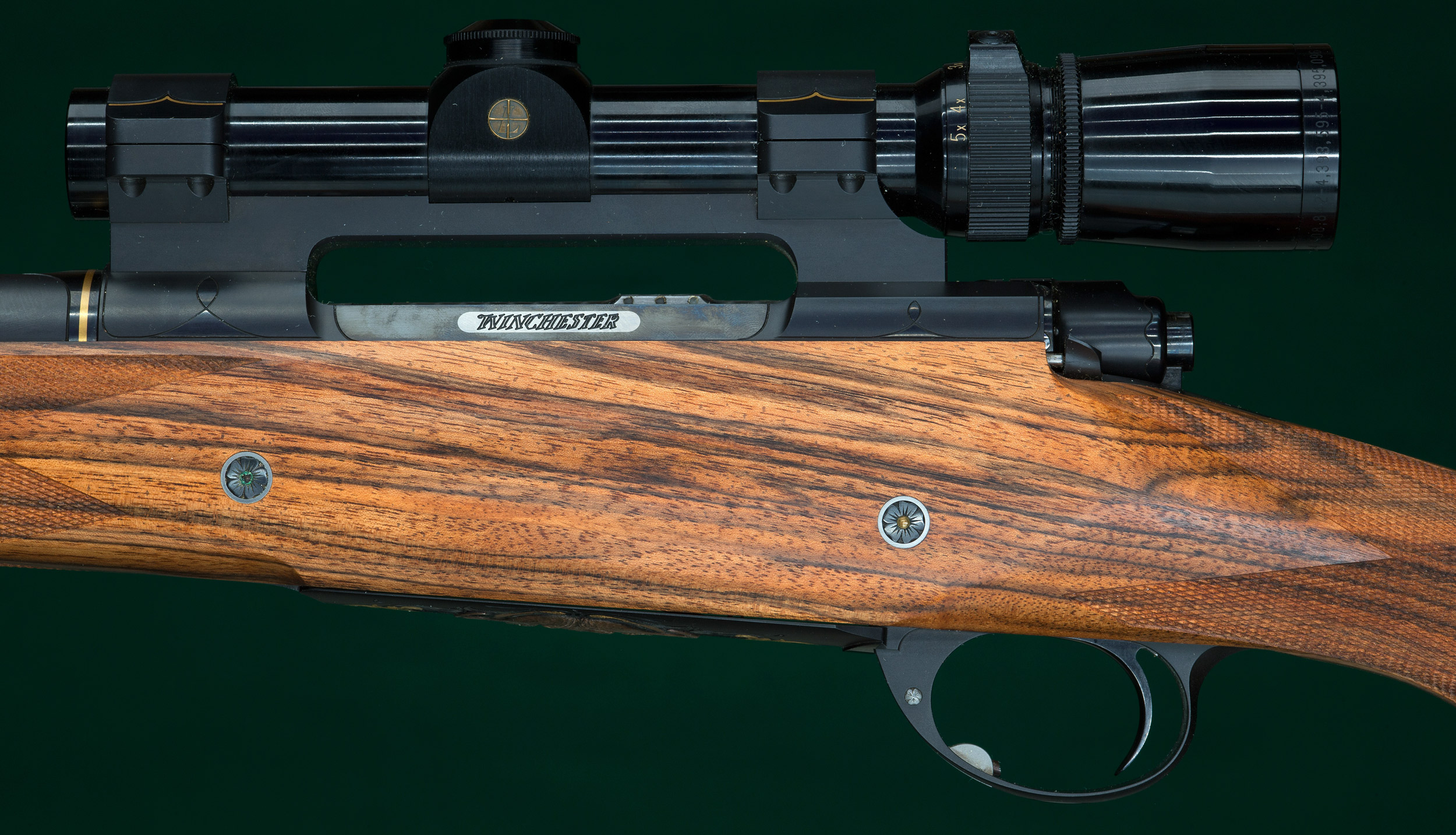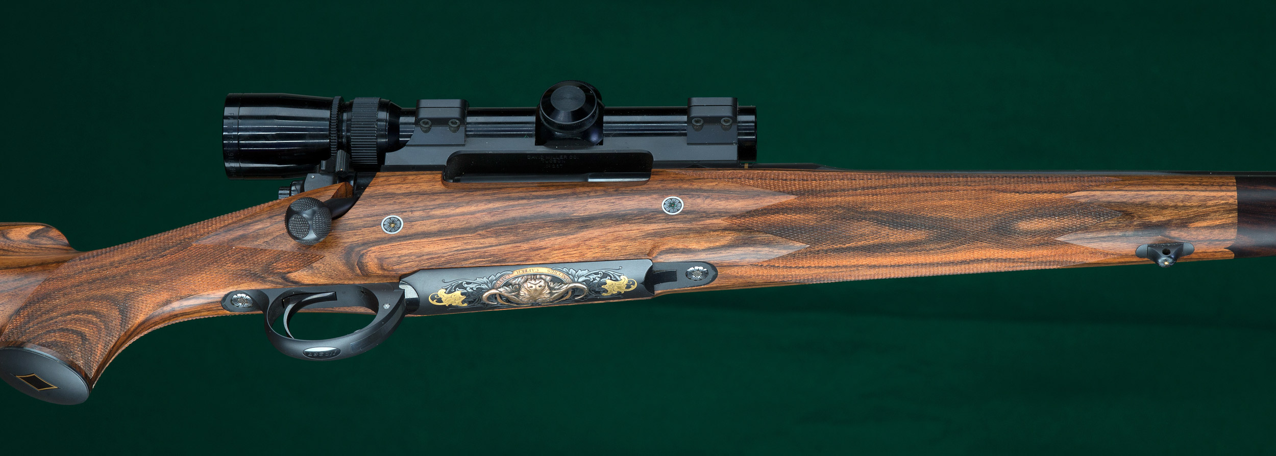 Winchester pre-'64 Model 70 action with gold-inlaid serial numbered jeweled bolt, jeweled follower engraved "4 CARTRIDGES", 3-position safety with FIRE inlaid in gold, gold rosette inlaid in firing-pin bushing, 5-panel checkered bolt knob. Engraved and gold-inlaid bolt stop. Hinged straddle floorplate with detented release inside triggerguard. Miller-made Model 70-type sculptured high-polish-blue trigger lever with mechanism jeweled inside. Sculptured rear tang and with blind rear tang screw. Entirely flush floral-engraved action screws with spring-loaded hex cavity covers---even the one hidden under the floorplate. |