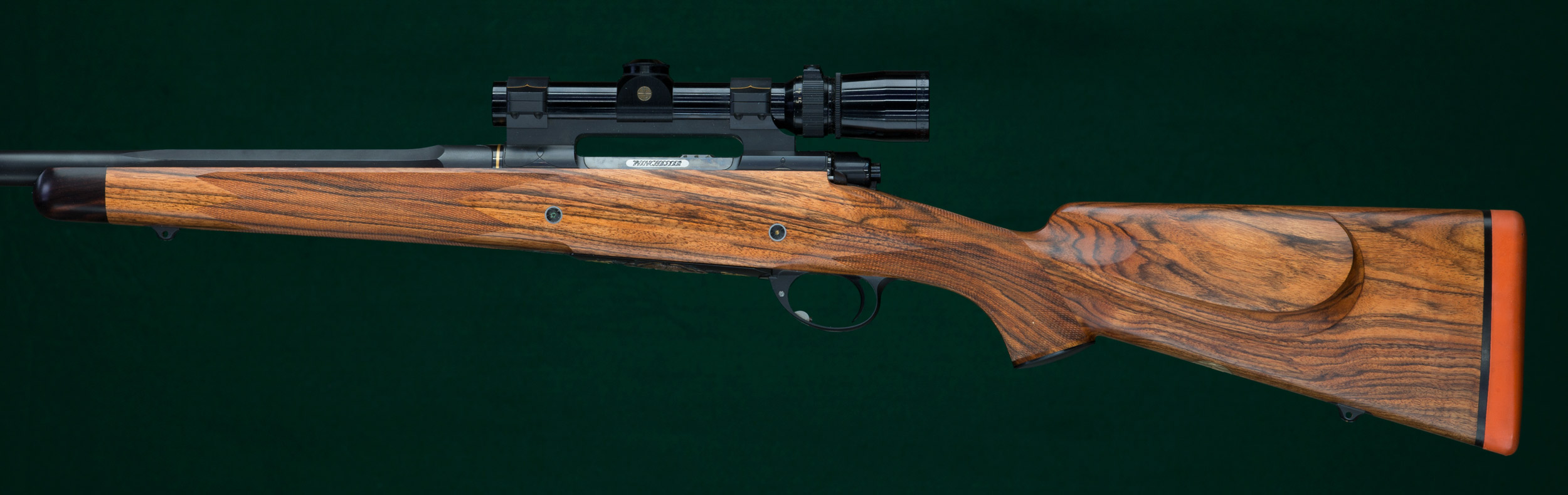 Leupold 1.5-5x scope on David Miller's solid indestructible mount. Winchester serial number 213065. David Miller's serial number 287. Pull: 14 1/8". Weight: 9lbs, 1 1/2oz. Built for author R. L. Wilson, finished in 1988. Very little used. |