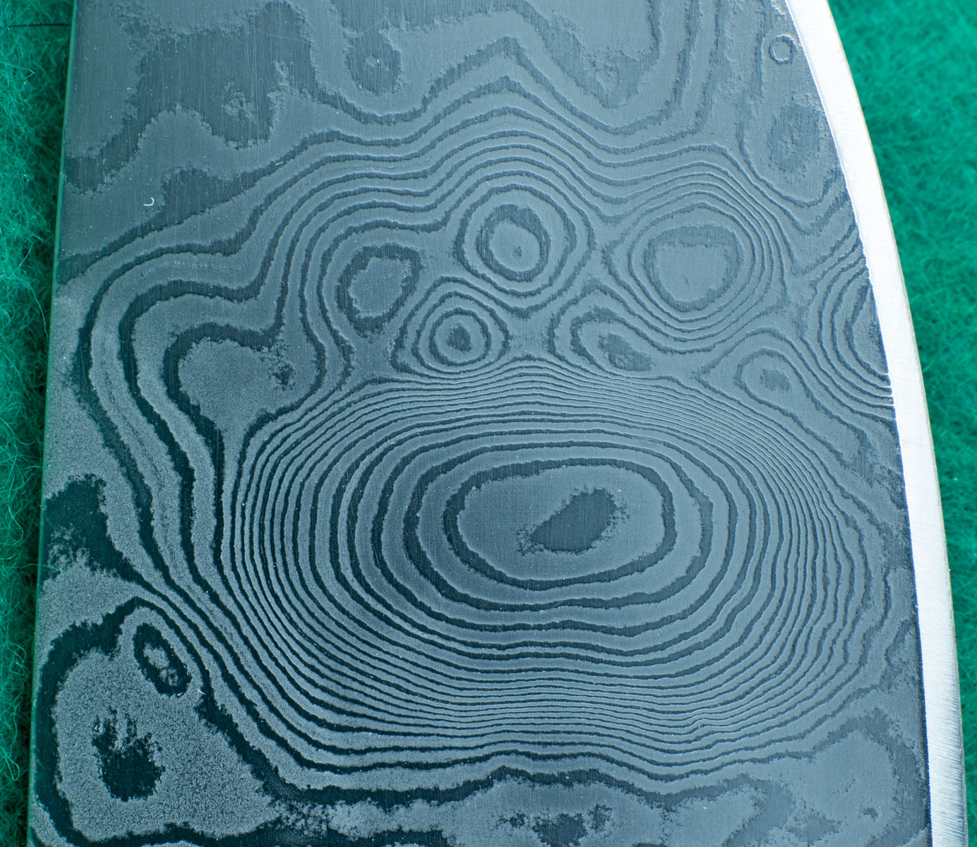 4 3/4" heavy blade of Couch, Bear Paw pattern damascus steel with full tapered tang. 9 1/2" |