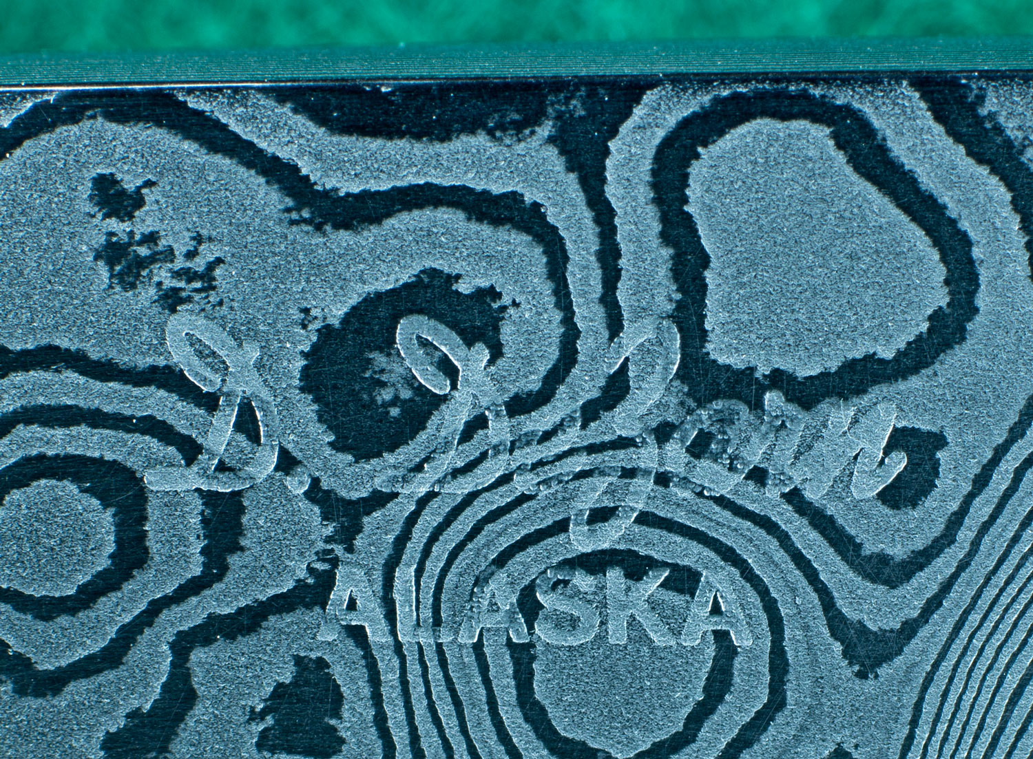 overall length. Steel bolster, scroll engraved by James White, Wasilla, AK. Smooth moose |