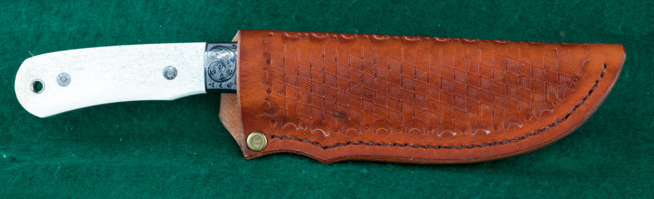 antler scales retained by two broad engraved pins. Steel ferrule lanyard loop. With tooled leather |