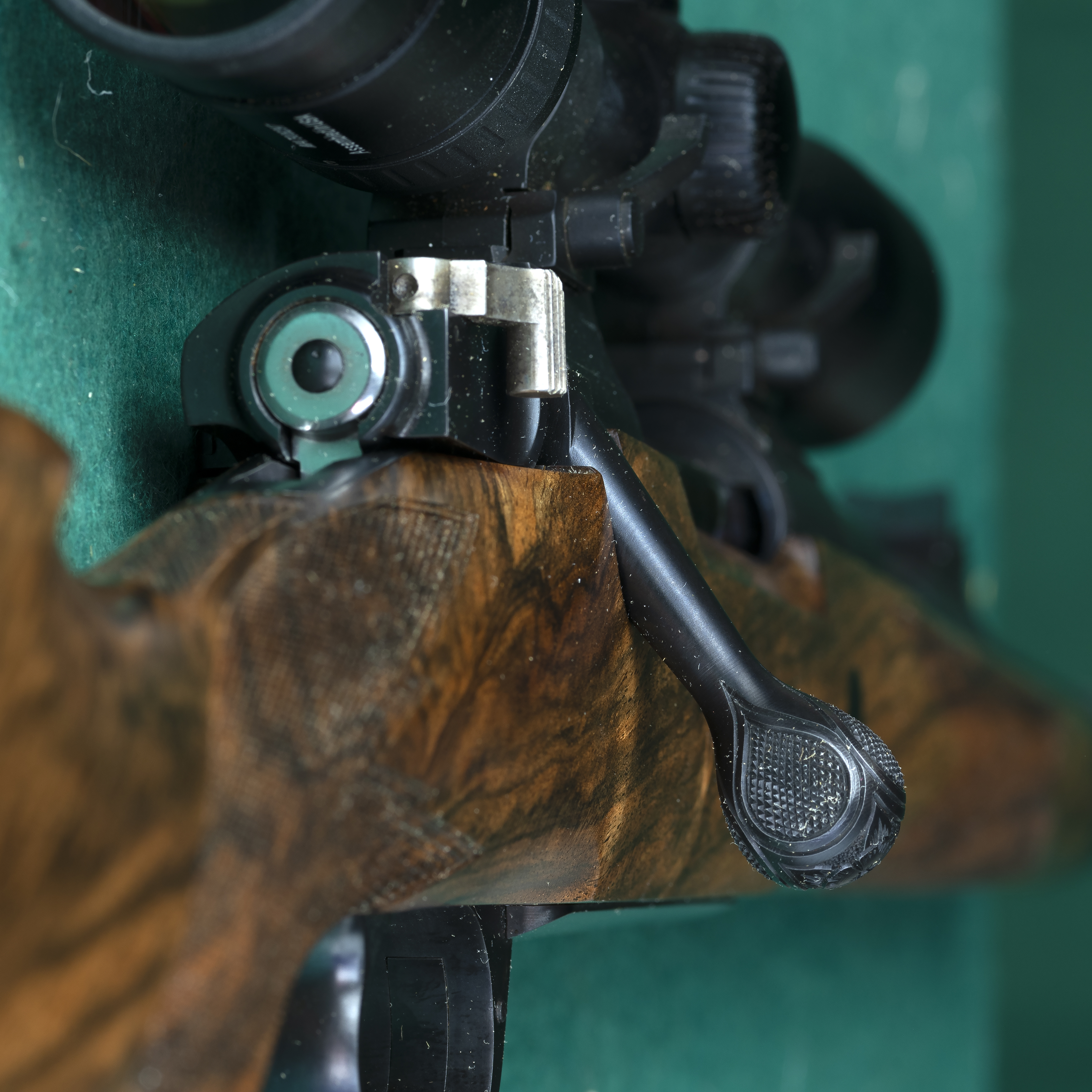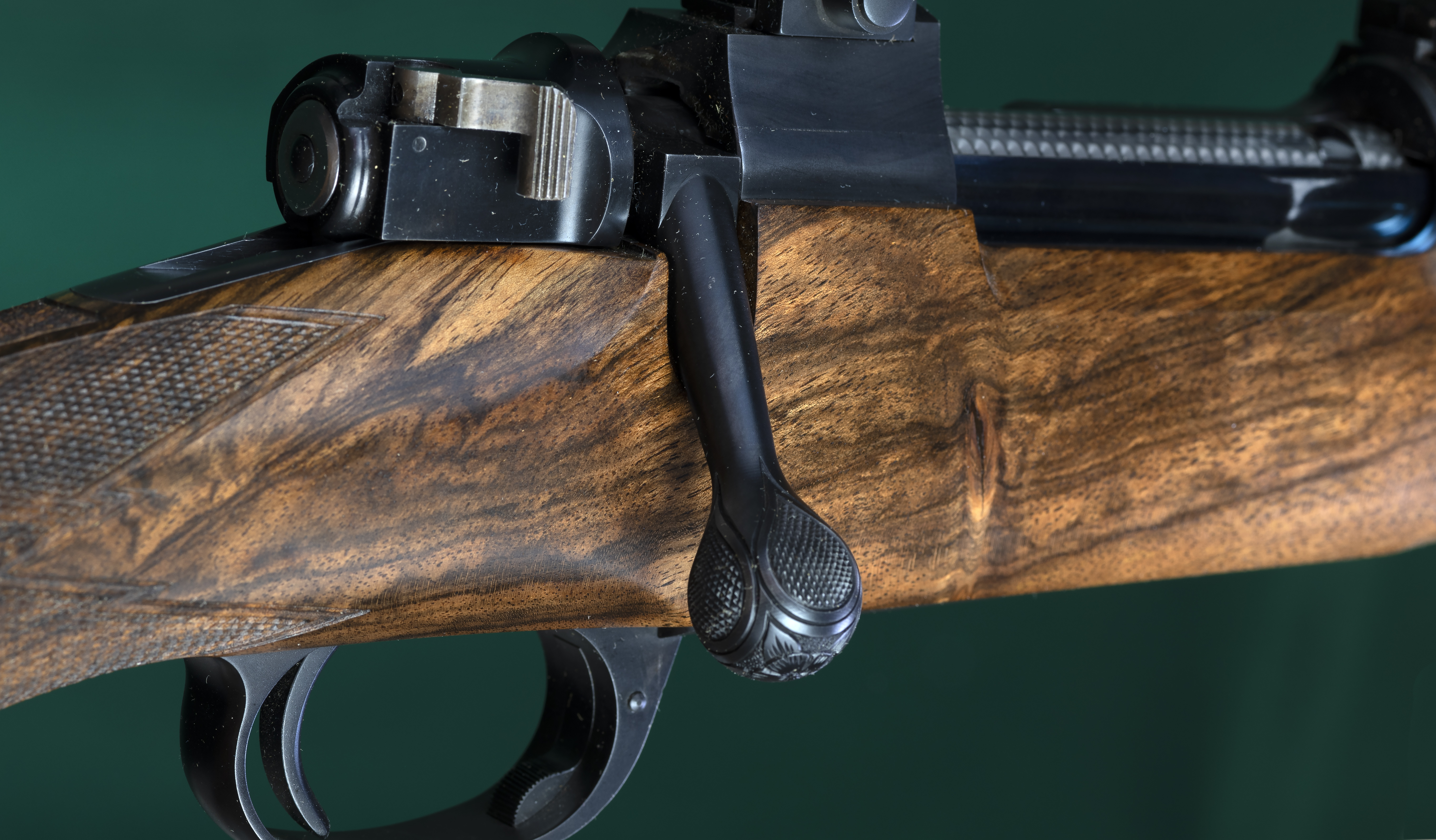 | | Mauser action with finely jeweled bolt and follower, 4-panel checkered bolt |