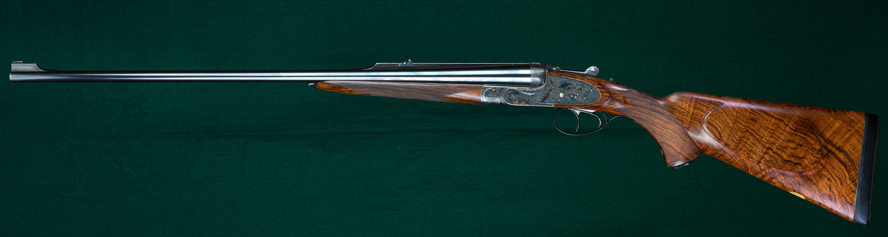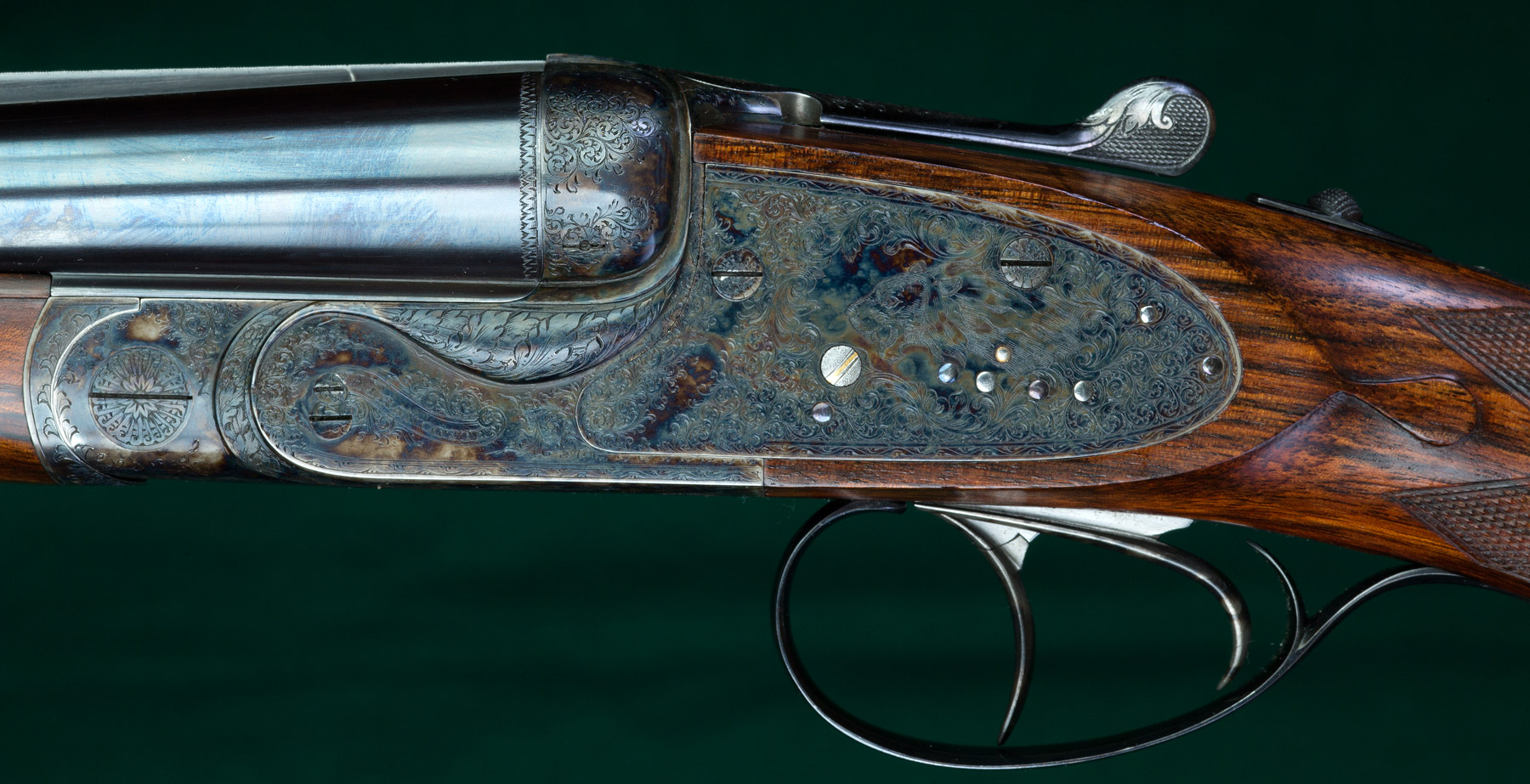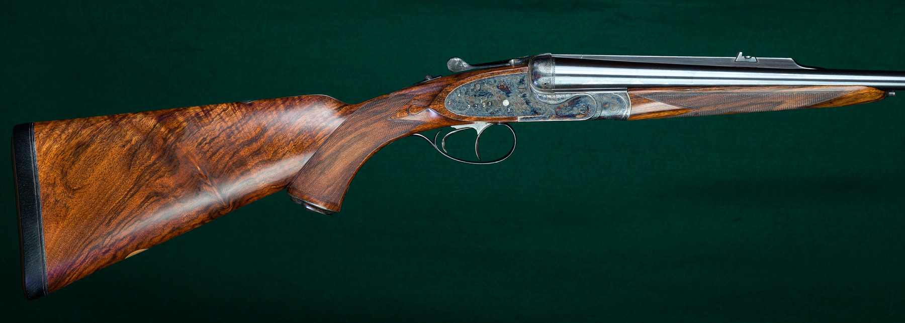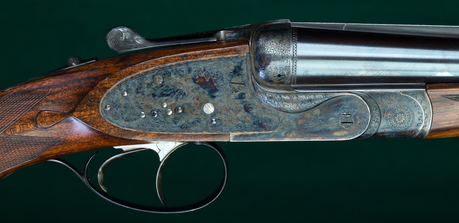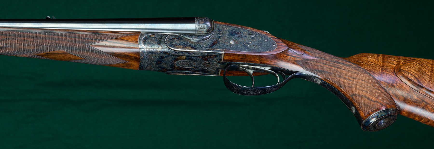 25" SxS chopper-lump barrels with hand-filed quarter rib, 1 standing and 1 folding express sight. 14 3/8"pull from casehardened articulated front trigger to leather covered pad. Highly figured walnut stock with beaded pancake cheekpiece, classic point-pattern checkering, teardrops, vacant gold oval, engraved steel trapdoor PG cap and splinter forend with Anson pushbutton release. Fine scroll and game-scene engraving by R Smeets on casehardened Holland & Holland-style reinforced action with gold-line cocking indicators, intercepting sears, concealed third fastener, bushed firing pins, bottom tang extending to grip cap and top tang extending over comb. Weight: 8lbs, 12oz. Built in 1957 of pre-war quality. New condition, retaining 99%+blue and 99% vivid casehardening colors. With Brady-type leather-trimmed canvas trunk case, snap caps and oil bottle.