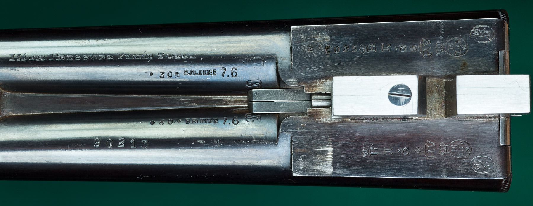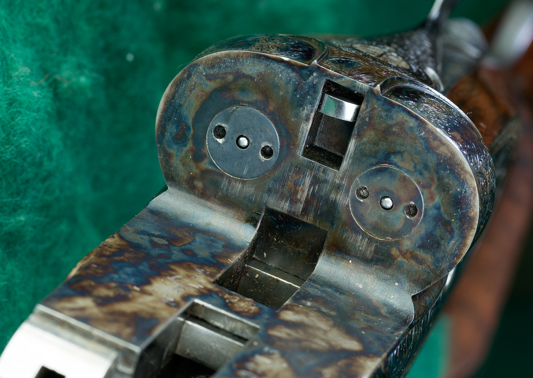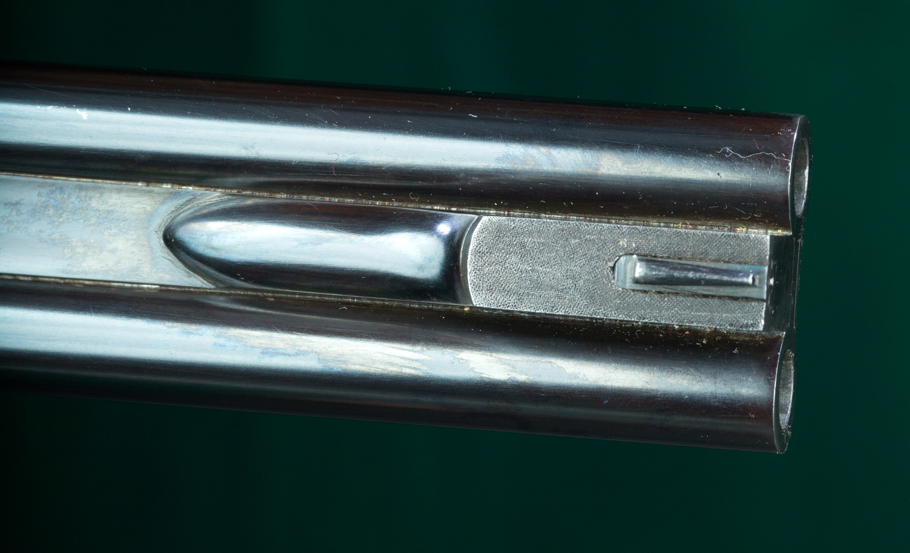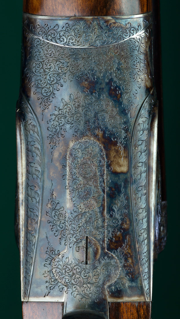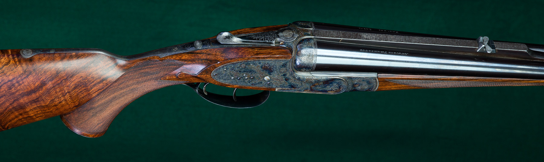 25" SxS chopper-lump barrels with hand-filed quarter rib, 1 standing and 1 folding express sight. 14 3/8"pull from casehardened articulated front trigger to leather covered pad. Highly figured walnut stock with beaded pancake cheekpiece, classic point-pattern checkering, teardrops, vacant gold oval, engraved steel trapdoor PG cap and splinter forend with Anson pushbutton release. Fine scroll and game-scene engraving by R Smeets on casehardened Holland & Holland-style reinforced action with gold-line cocking indicators, intercepting sears, concealed third fastener, bushed firing pins, bottom tang extending to grip cap and top tang extending over comb. Weight: 8lbs, 12oz. Built in 1957 of pre-war quality. New condition, retaining 99%+blue and 99% vivid casehardening colors. With Brady-type leather-trimmed canvas trunk case, snap caps and oil bottle.