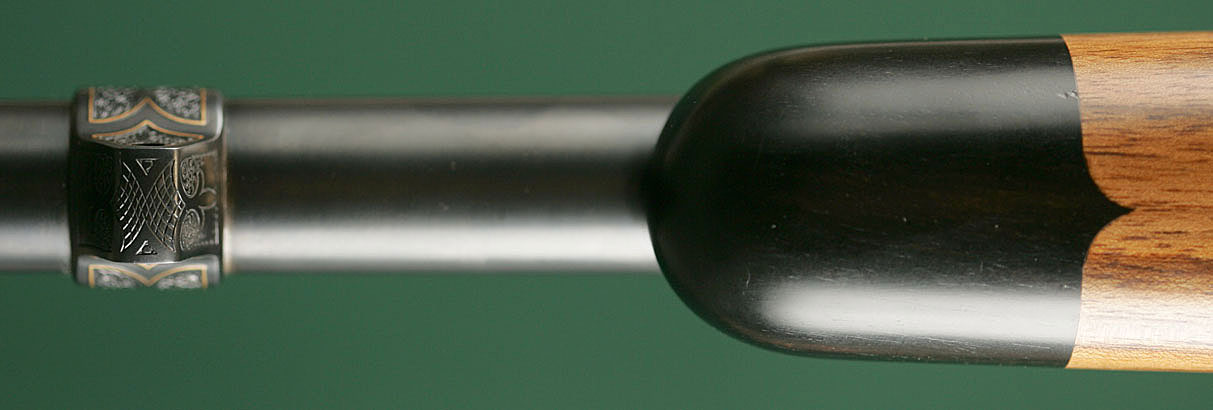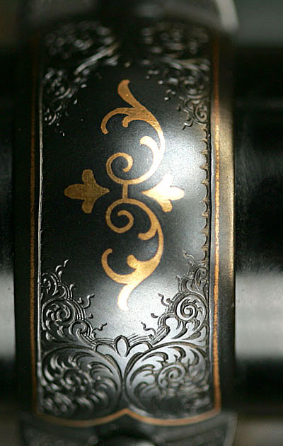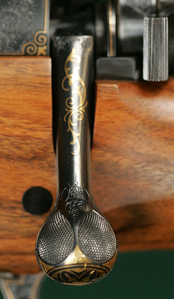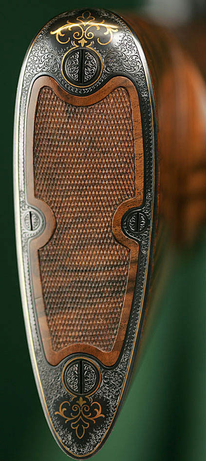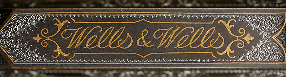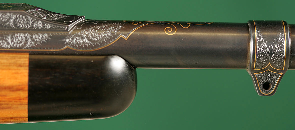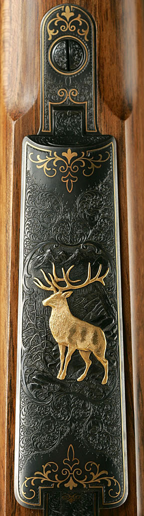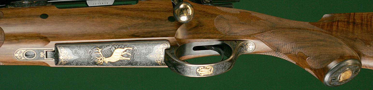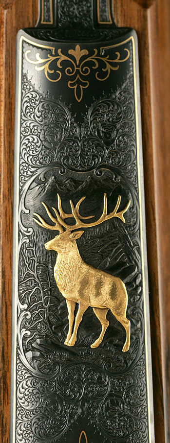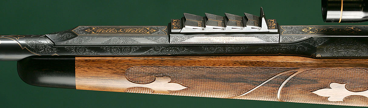 Description: 26" round barrel with hooded full-band front sight (with three interchangeable blades), full-band swivel base and quarter rib (with 1 standing and four folding express sights numbered in gold 50, 100, 150, 200, and 300) all integrally machined from one homogeneous bar of steel by Reuben Wells. Highly figured Turkish walnut stock by Bob Emmons with steel pistol grip cap, ribbon and fleur-de-lys checkering, widow's-peaked ebony forend tip, beaded cheekpiece, inletted rear swivel stud, double recoil crossbolts and skeleton buttplate---checkered within. Hand made, left-hand, double squarebridge, magnum Mauser action by Fred Wells with blind rear action screw, model 70-type safety, hinged straddle floorplate, jeweled bolt and follower, 5-panel checkered and gold-inlaid bolt knob. Elaborate scroll engraving by Claus Willig with embellished gold line borders and scrollwork on the receiver, scope rings, 12 inch long rear barrel section, quarter rib, front sight, barrel sling swivel mount, buttstock sling swivel, skeletonized buttplate, bolt handle, floor plate and trigger guard. Gold inlaid bull elk on floorplate. Gold inlaid bear head on pistol grip cap. The quarter rib inlaid in gold script Wells & Wells in front of the rear sight and .375 H&H behind. Leupold M8-4x scope on custom Leupold-type bases. 14 1/8"pull. Weight: 11lbs, 8oz. Huey custom oak & elephant hide case with brass hardware and green canvas overcase, two screw drivers, a brush, three-piece brass cleaning rod, two brass containers, oiler, an extra pair of scope rings and two keys. Large custom folding knife with silver frame, 3 3/4" art-damascus blade and ivory panels by Mike Leach---a few hairlines in the ivory. Near new, with 99%+ blue with only slight handling marks. Extensive documentation pertaining to the construction of the rifle.