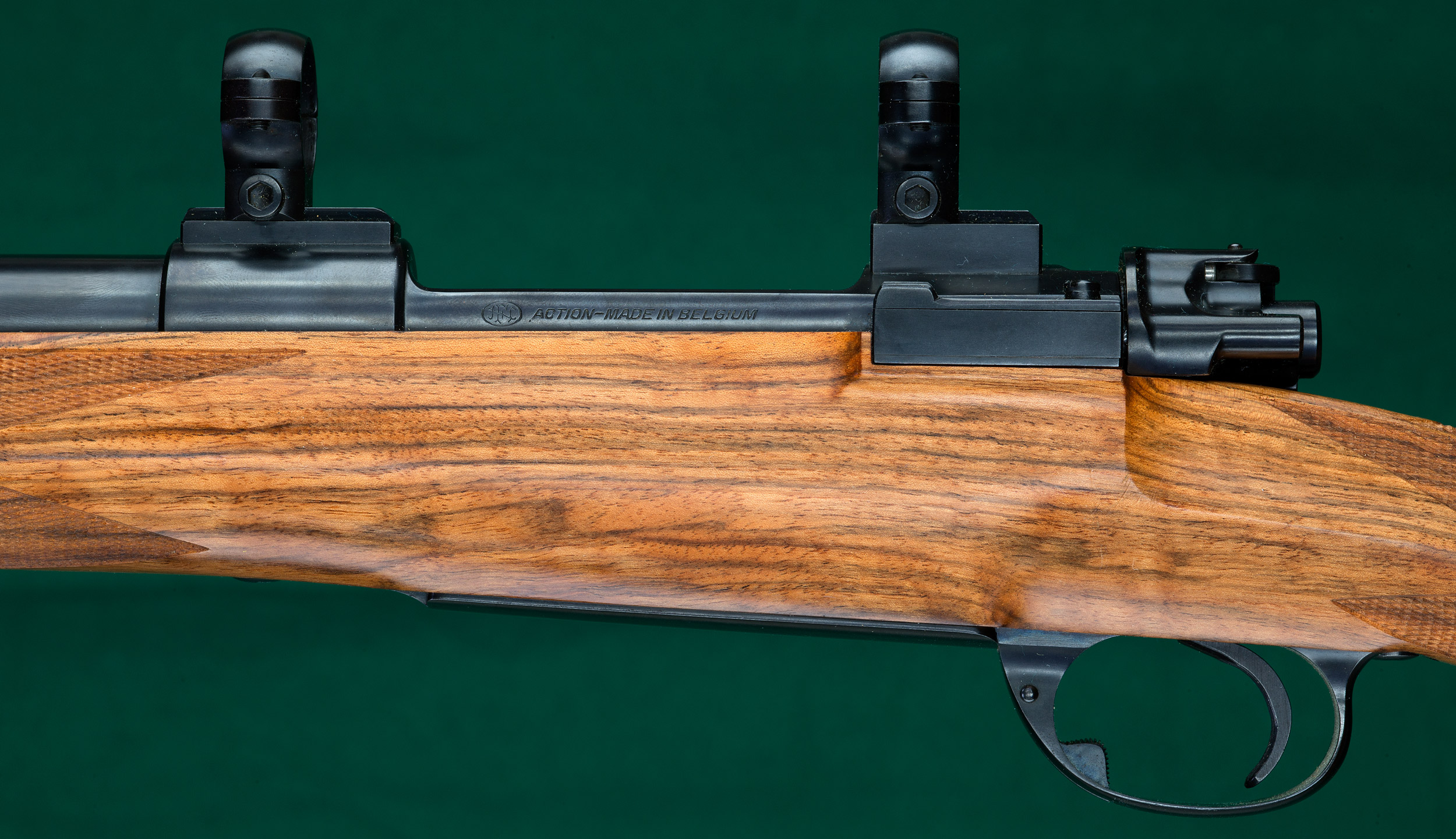 | | checkered withing. Metalwork by Herman Waldron: FN Mauser action with |