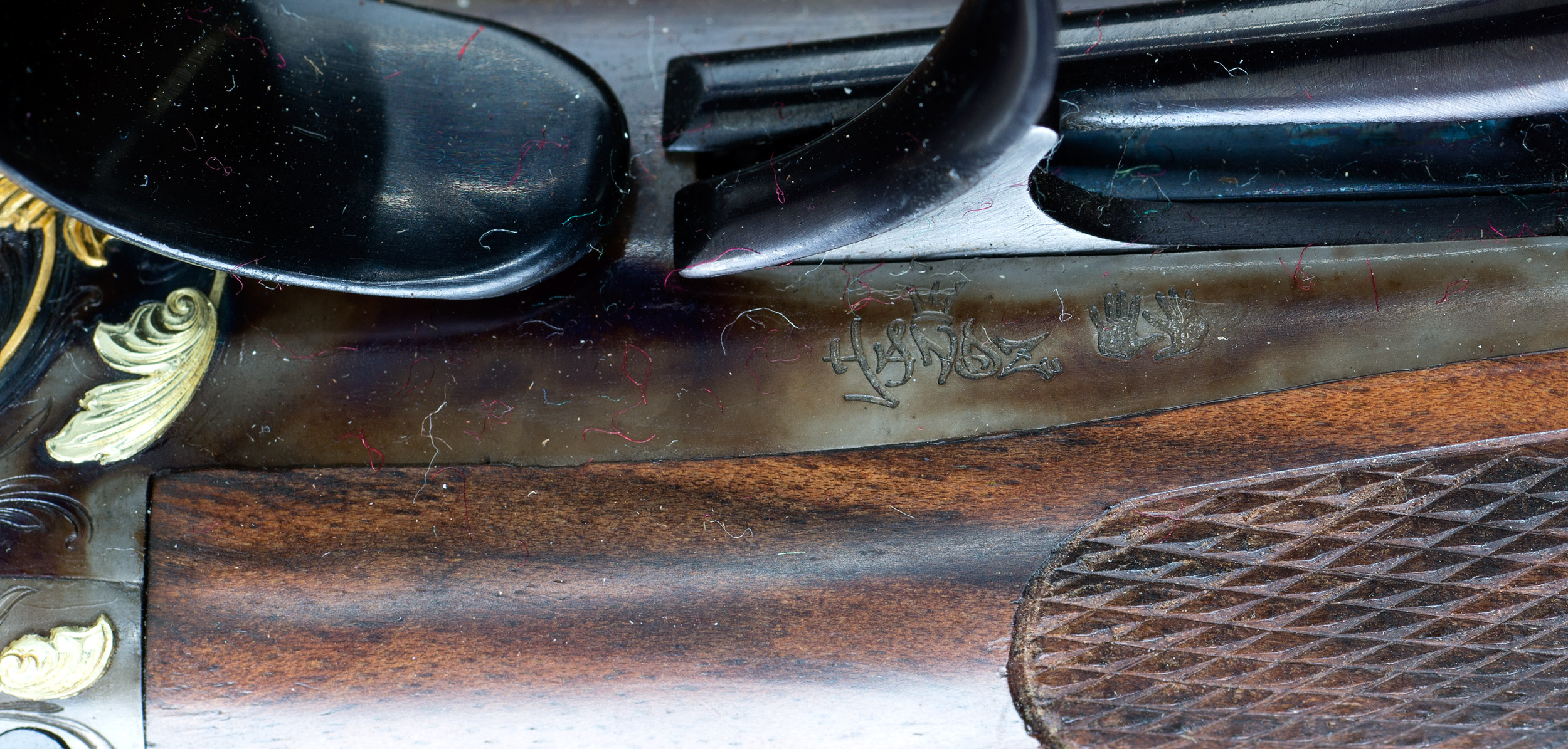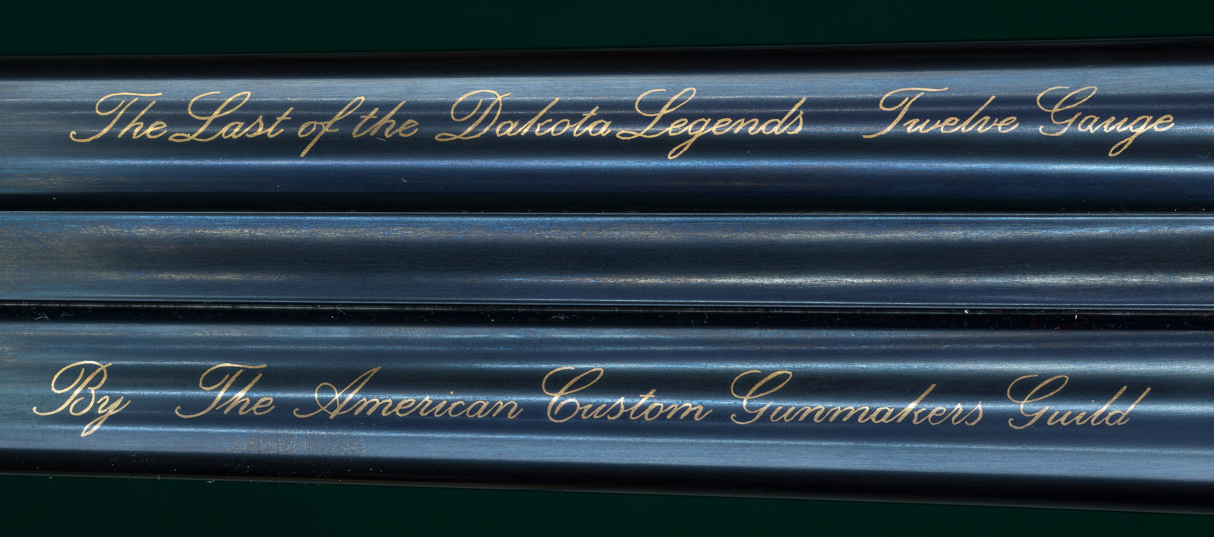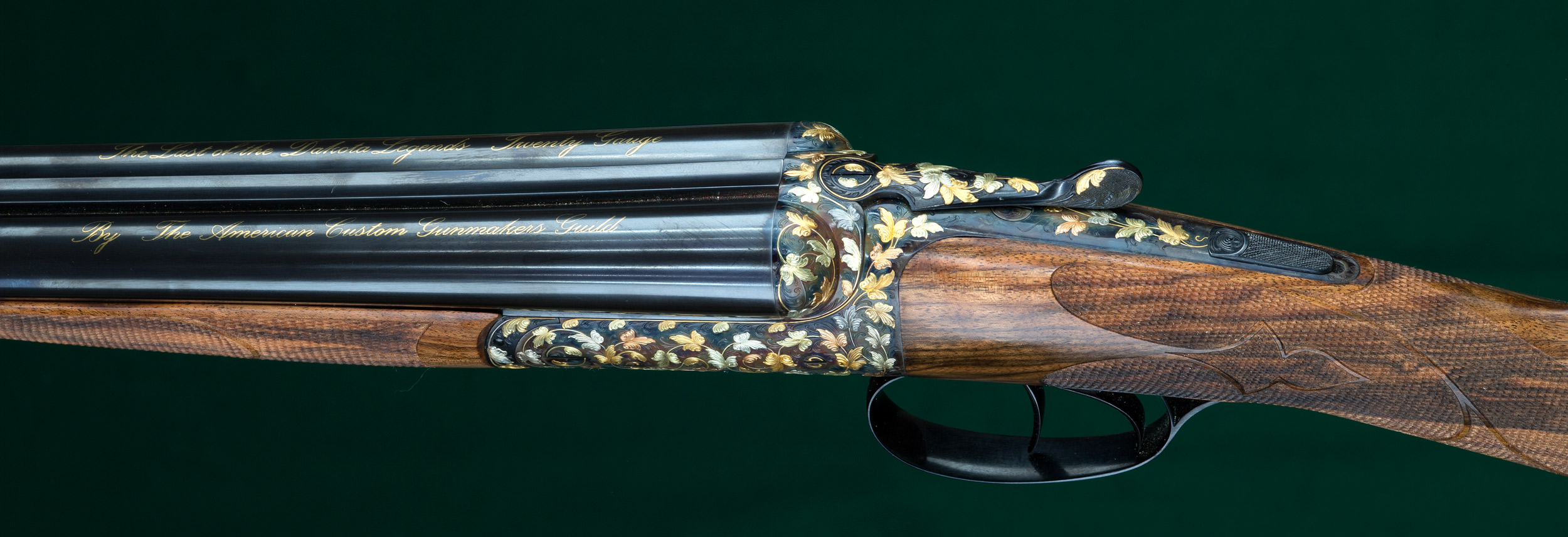| | Gunmakers Guild" flush-inlaid in cursive gold atop the barrels. Cold rust |