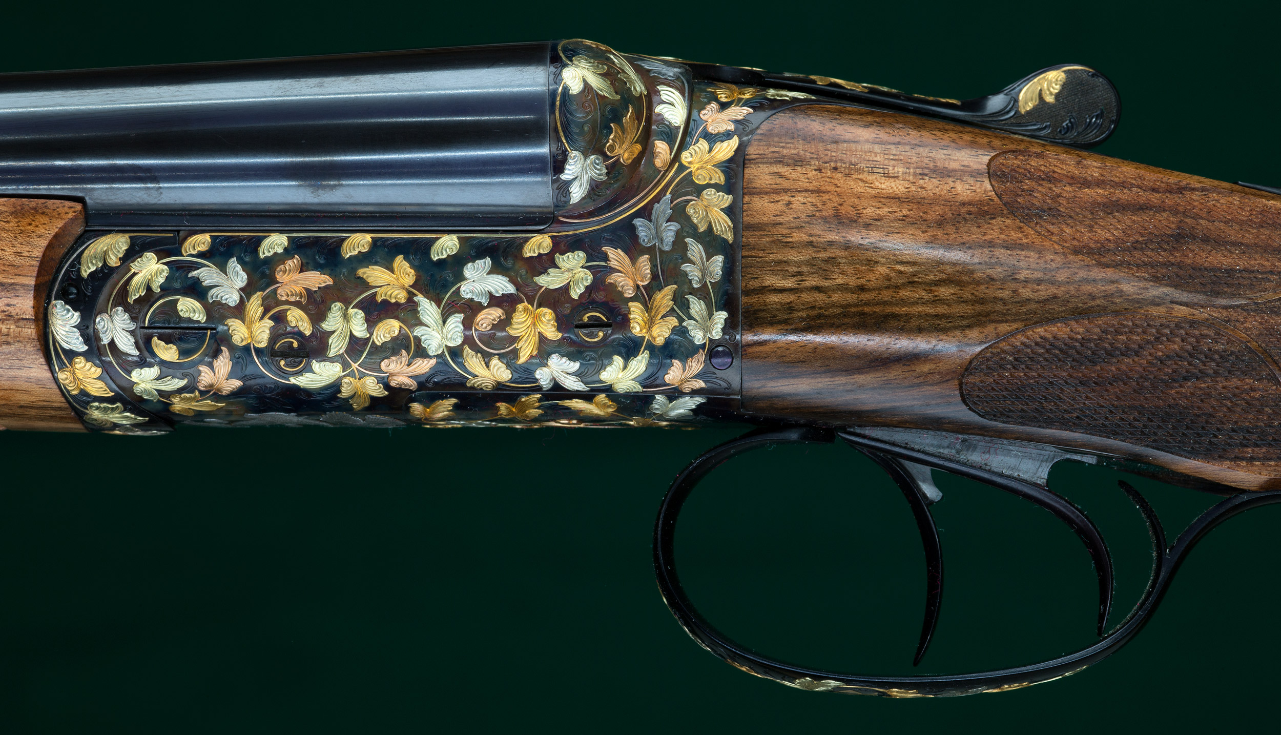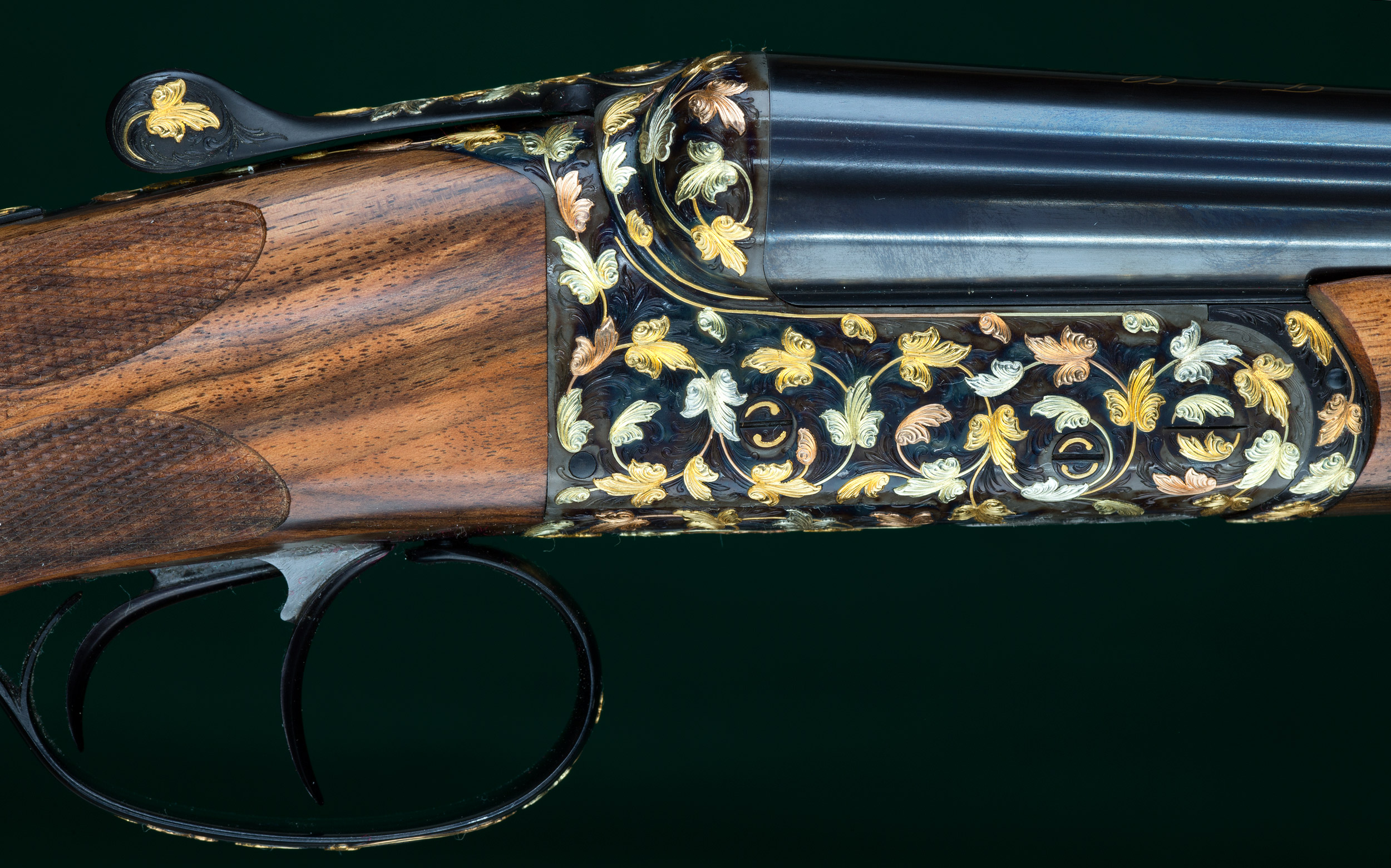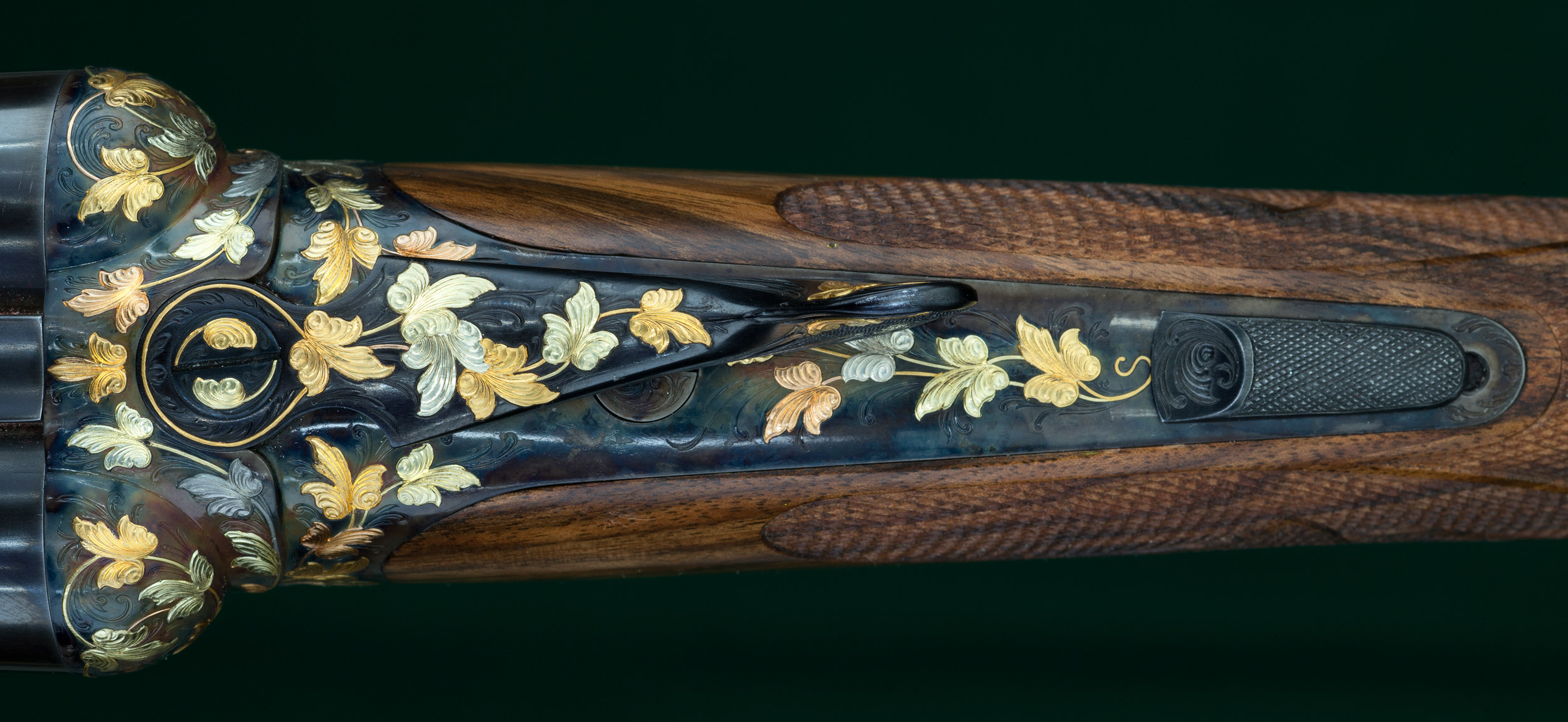 | | fleurs-de-lys. Round-bodied, casehardened, boxlock actions with automatic |