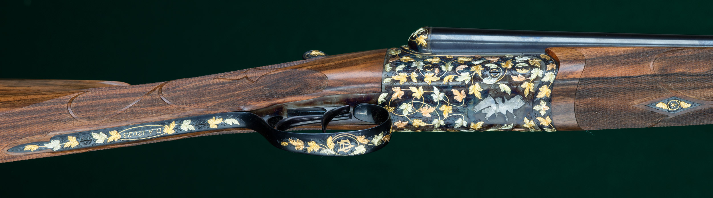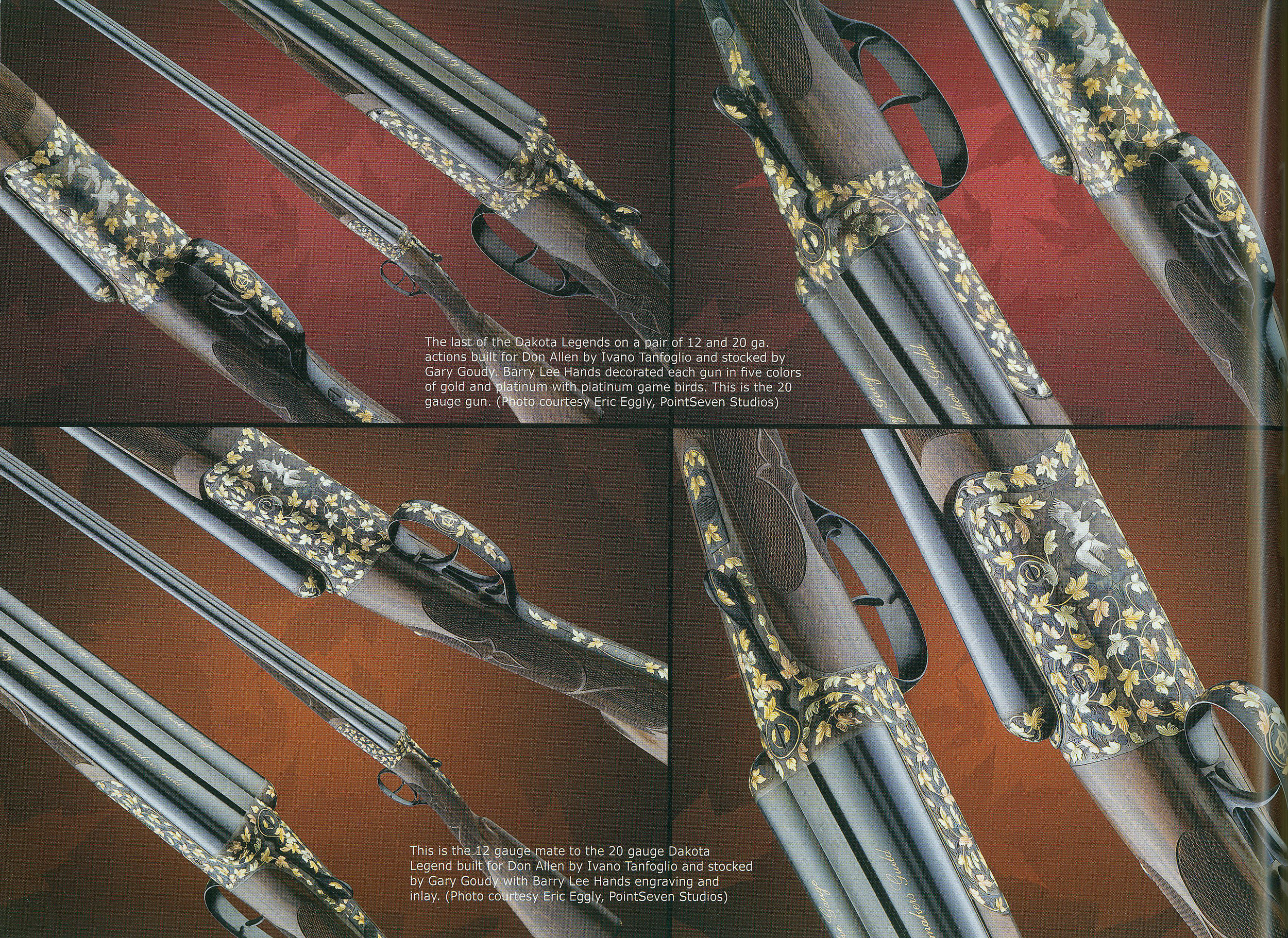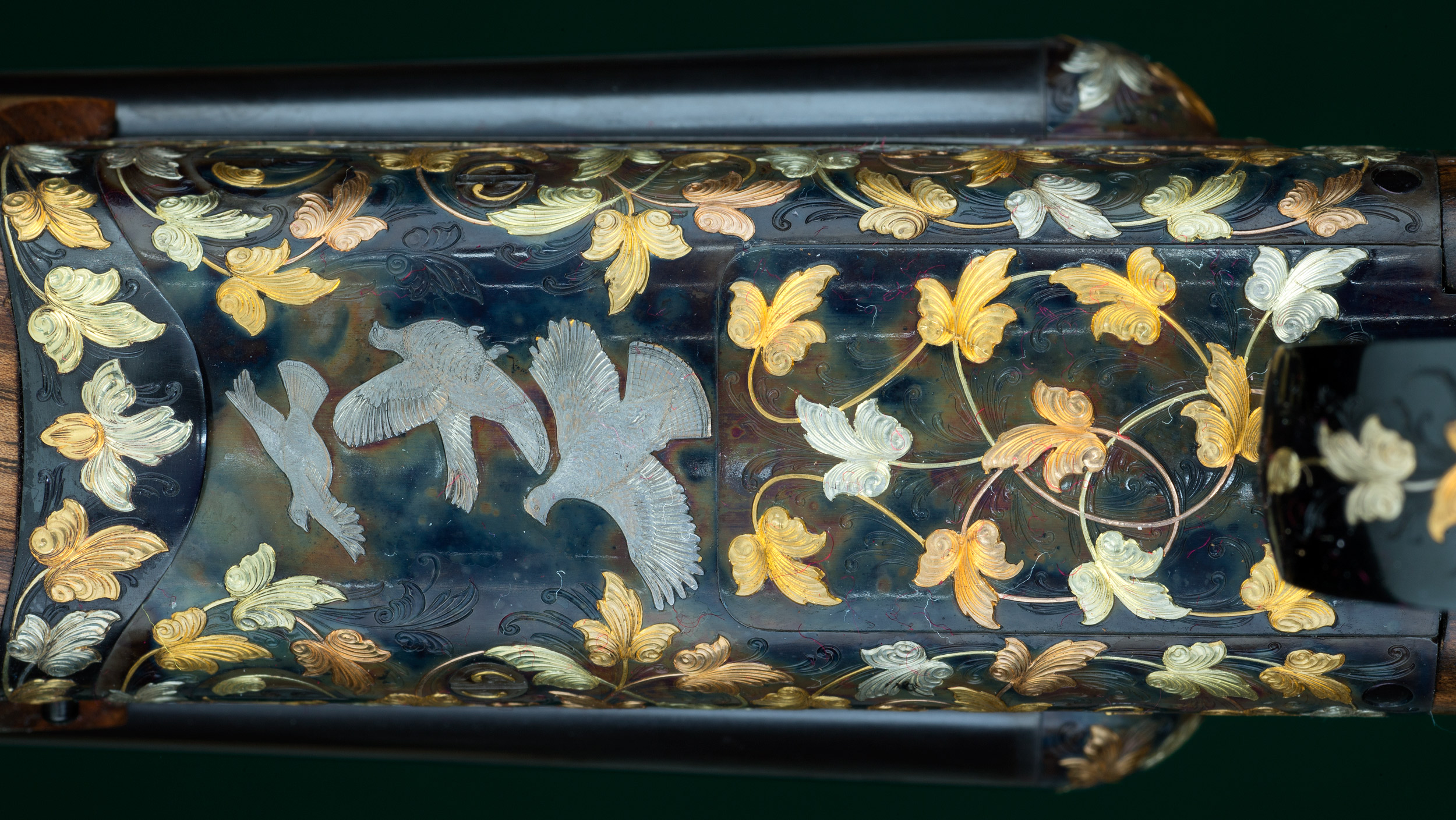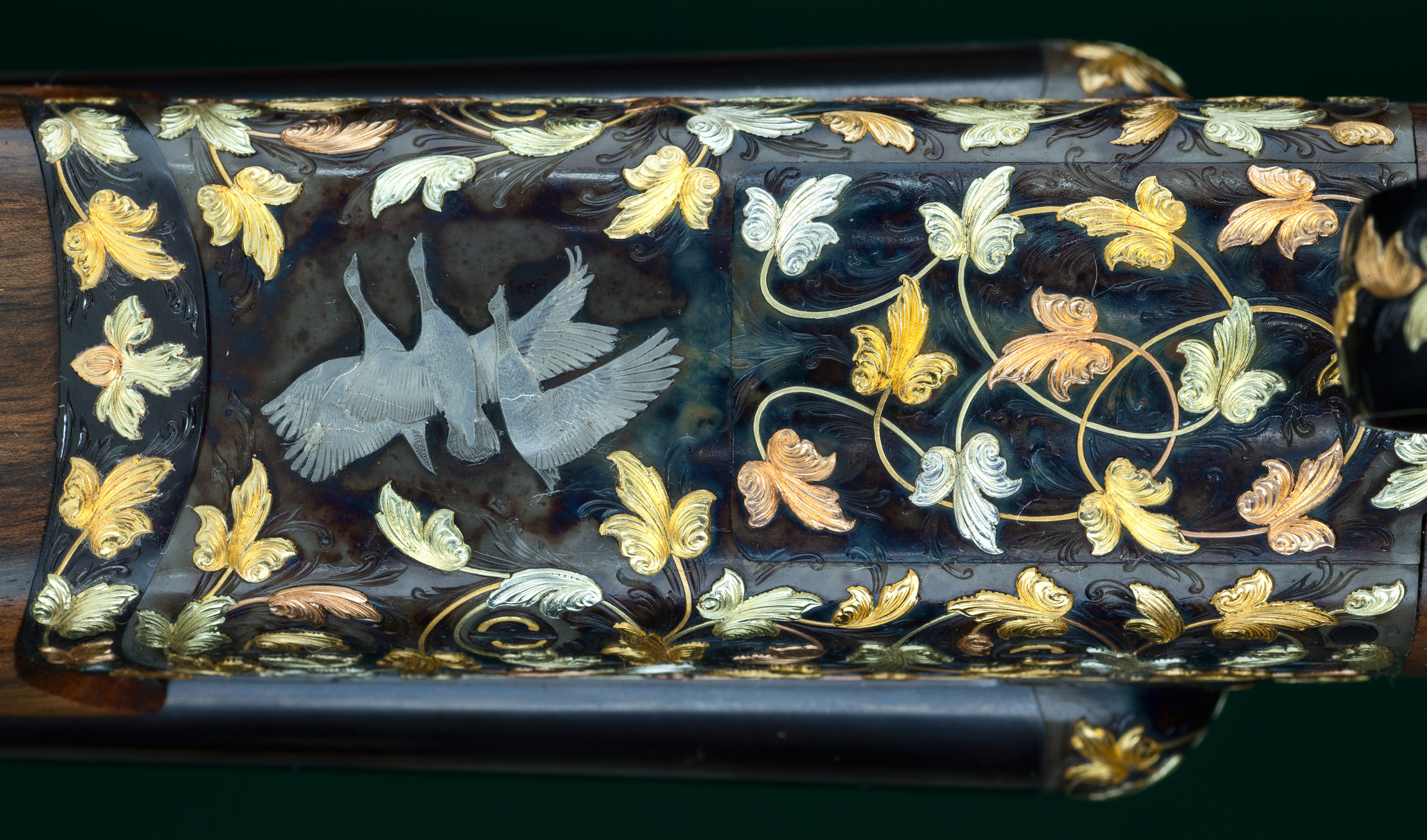 | | on the 12ga and three grouse on the 20ga, all in flight, silver-inlaid in |