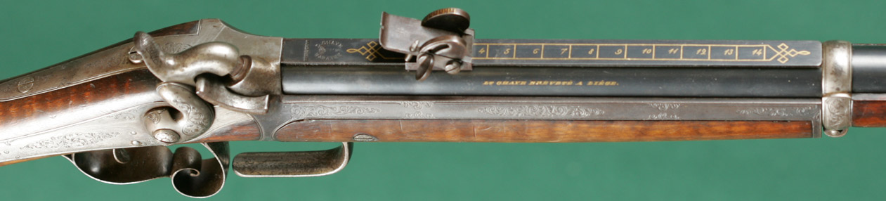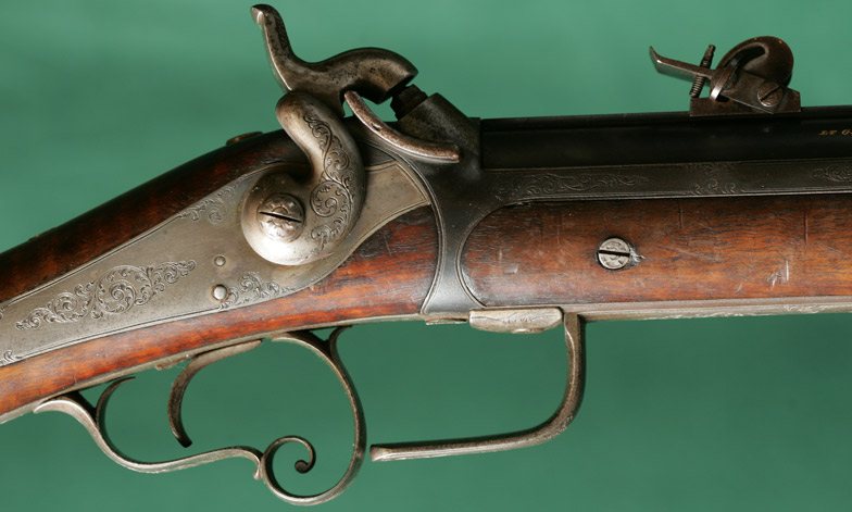 | quarter-rib track. Figured walnut stock with two barrel bands, scrolled steel |