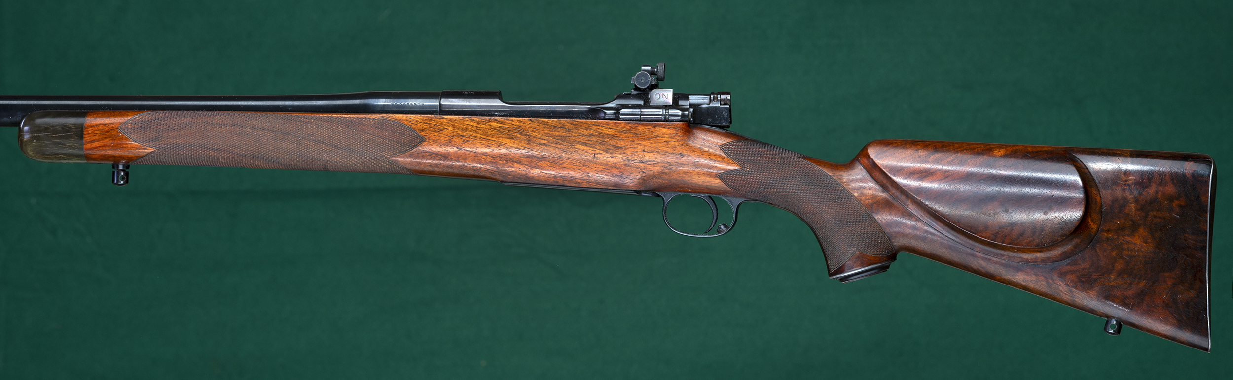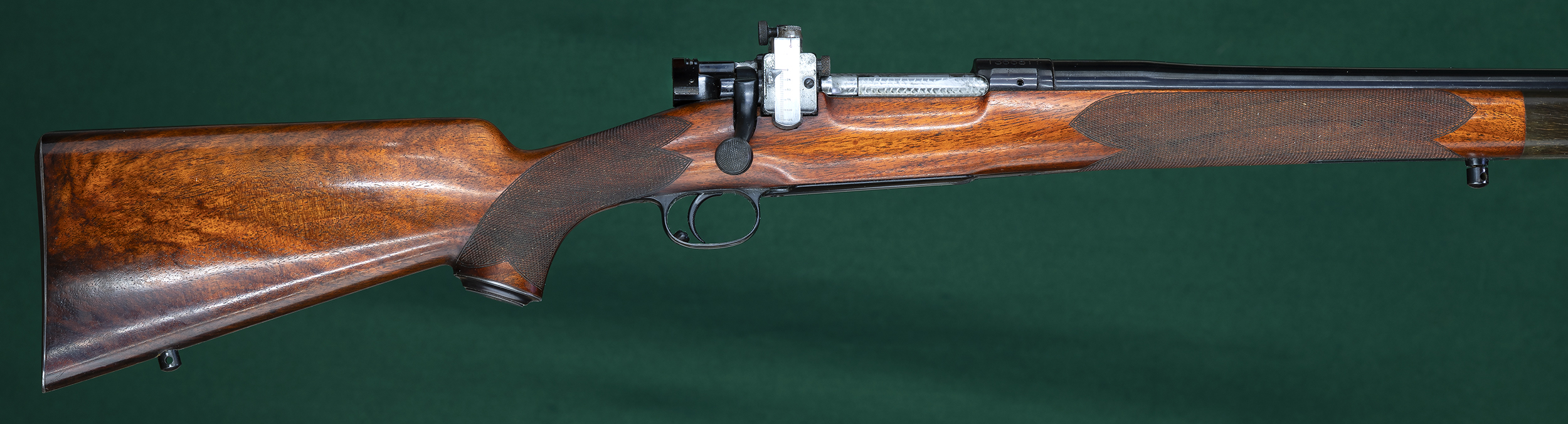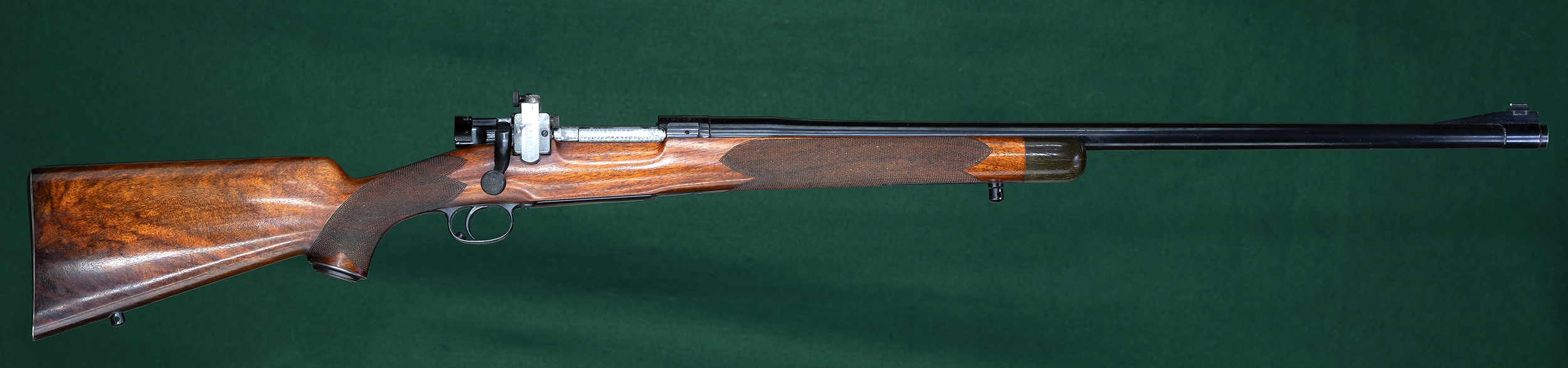 | | with beaded cheekpiece, rear swivel base, and hand-checkered steel |