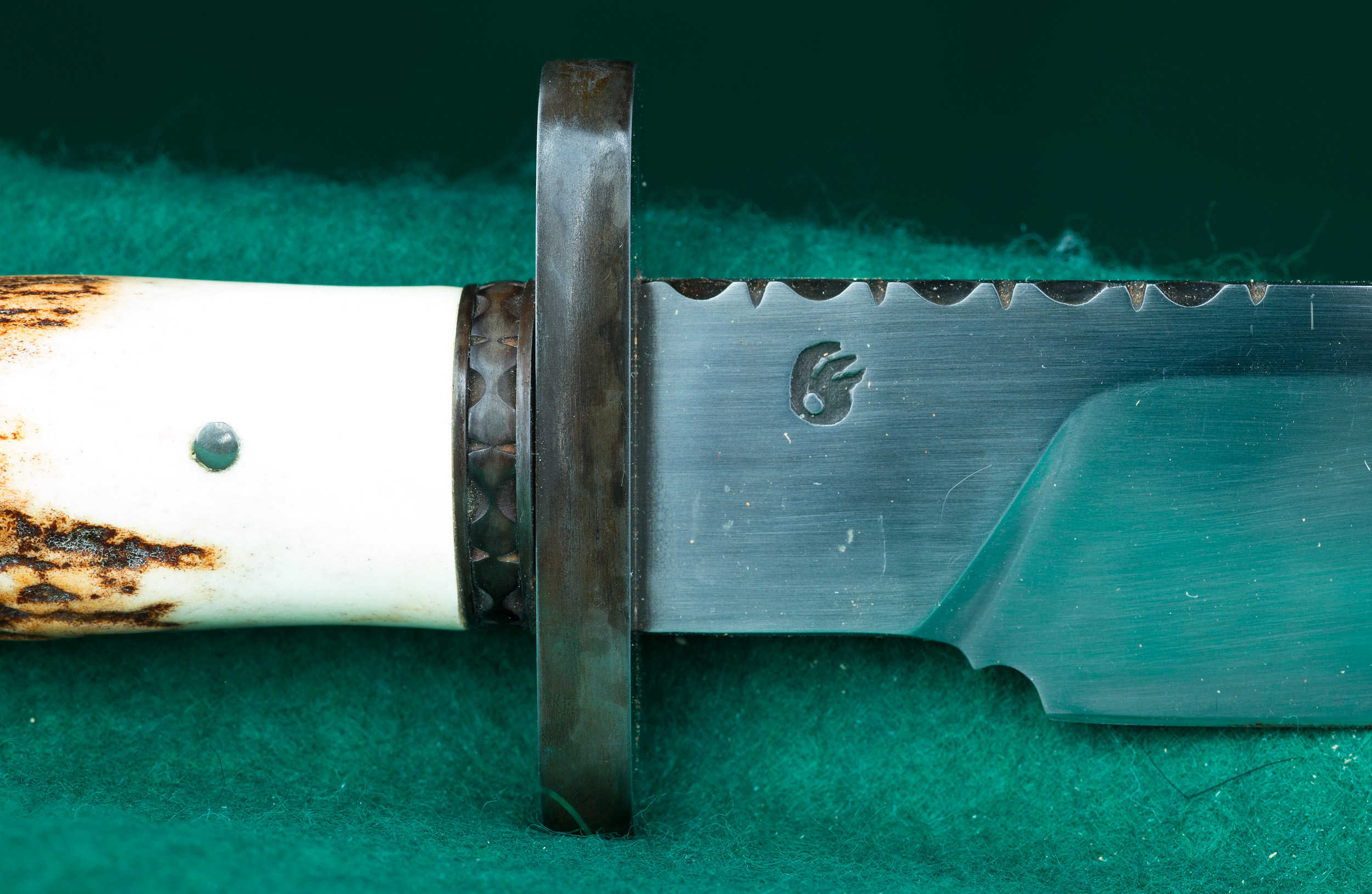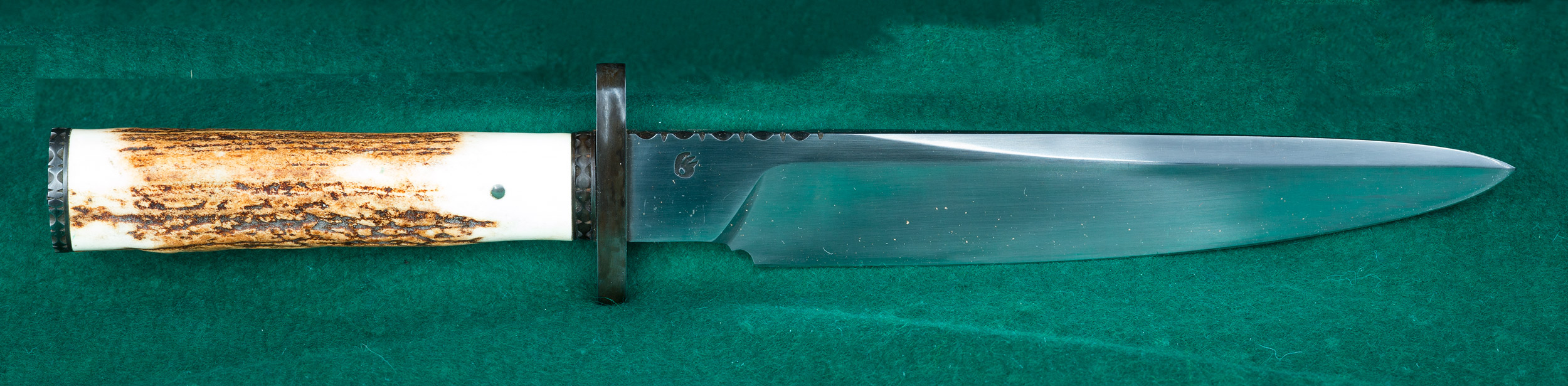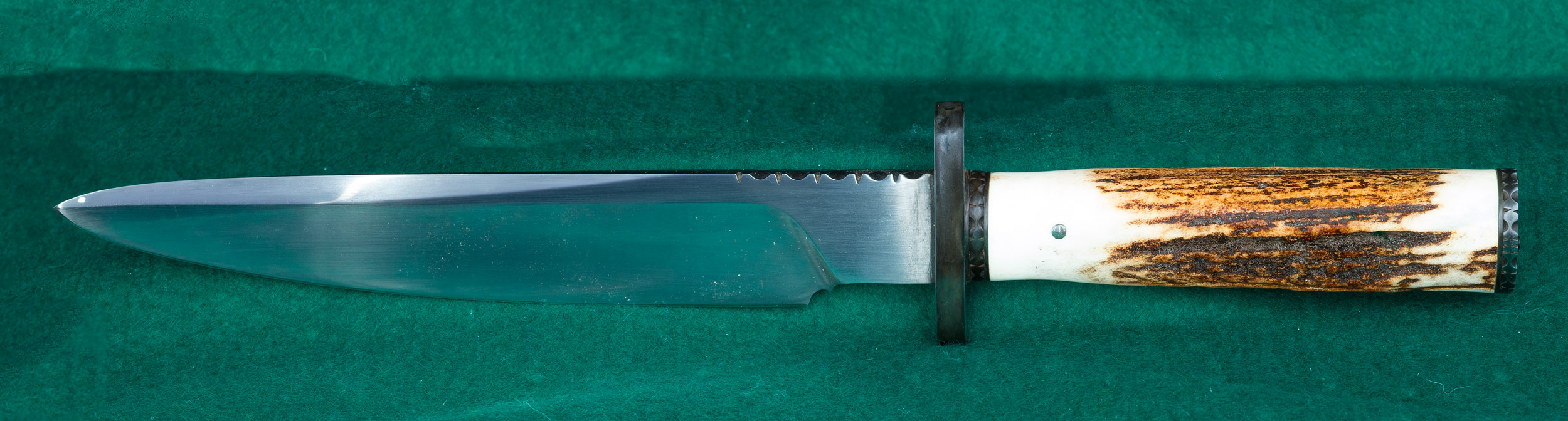 | | 7 3/8" blade with false edge and file-cut spine. One-piece stag grip with file-cut end caps. |