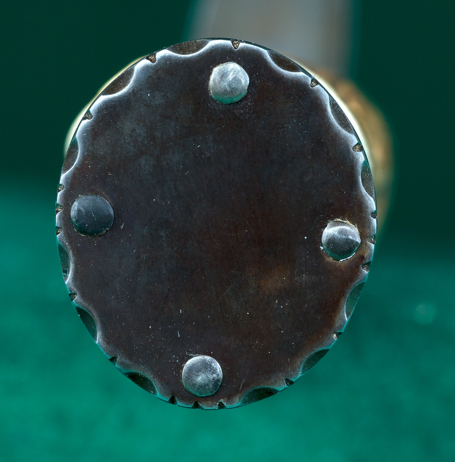 | | 12" overall length. Bronze-patinated quillion. Tooled leather sheath. $475. |