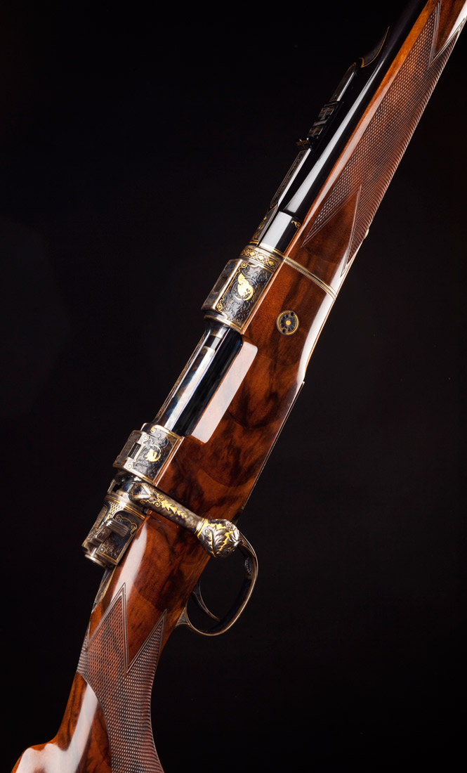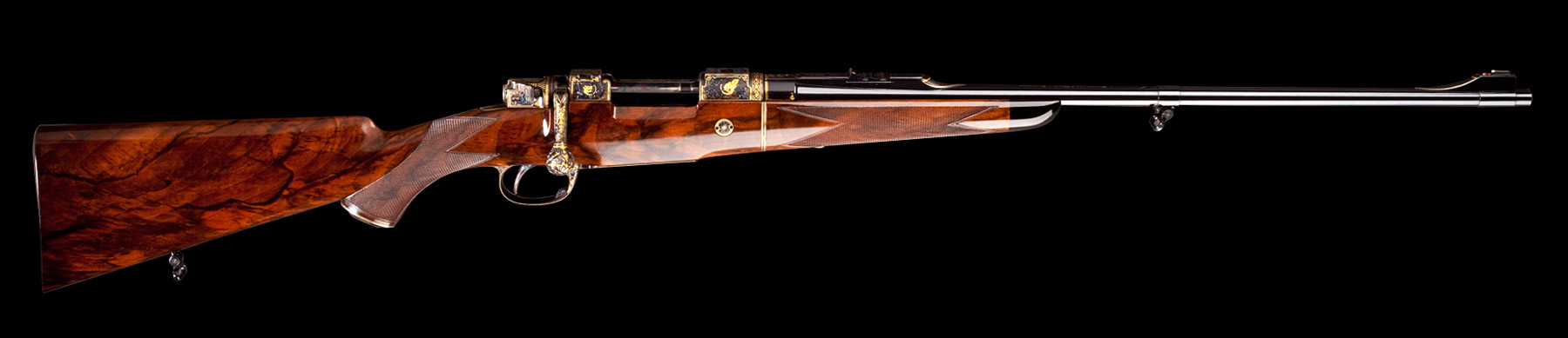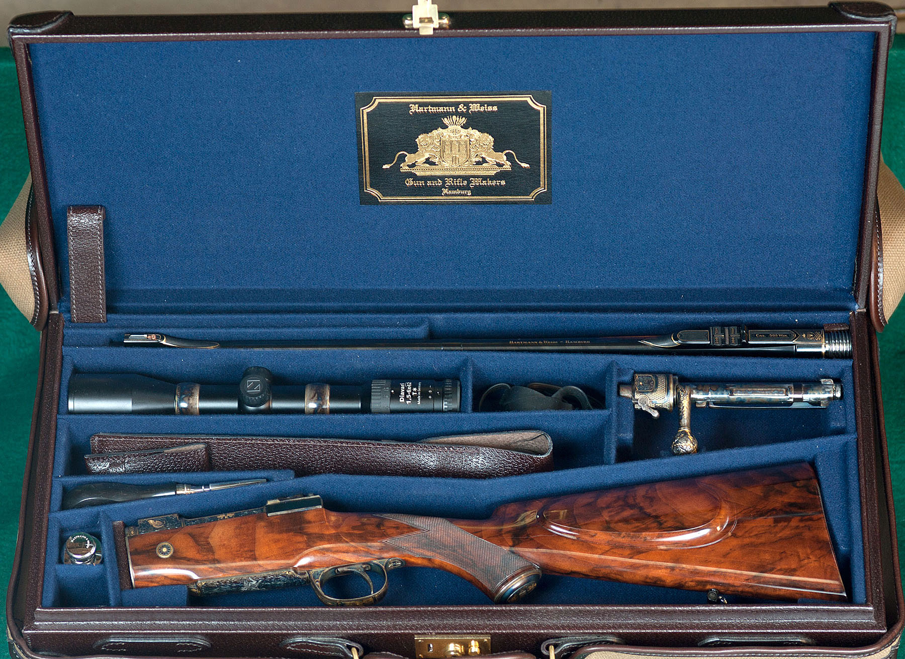 Description: 23 1/2" tapered round barrel with full-band front sight with fine bead and folding twilight bead, full-band swivel base, quarter rib with 1 standing and 2 folding gold-lined express sights with gold-inlaid markings for 100, 160 and 200 yards. Highly-figured, lustrously-finished walnut stock with ebony forend tip, wrap-around point-pattern checkering with mullered borders, Hartmann & Weiss proprietary takedown mechanism, recoil crossbolt, steel pistol grip cap, beaded pancake cheekpiece, rear swivel and checkered butt. 143/8"pull. Hartmann & Weiss, bench-made, color casehardened, Kurz Mauser, double-squarebridge action with Model 70-type safety, checkered trigger, fire-blued extractor and hinged floorplate with release inside triggerguard. Zeiss Diavari 1.5-6x42 T* scope with bold duplex reticle on Riechnagel quick-detachable mounts fitted directly to receiver squarebridges without separate bases. Extensively engraved by Hans Eisbacher: gold griffins on receiver bridges and siderail, platinum griffin on floorplate, gold griffin on triggerguard, gold horned grotesque on floorplate hinge, greenman on cocking piece, three-dimensional gold-backgrounded roccoco acanthus scroll covering bolt knob---all surrounded with deep-cut acanthus scroll and extensive gold-inlaid linework on receiver, bottom metal, scope mounts sights and grip cap; signed behind rear action screw. Weight: 7lbs, 5oz without scope; 8lbs, 10oz with. Built in 2010. New and unfired except by the maker and proof house. Cased in the maker's dark brown pigskin takedown trunk case with deep blue baize lining, leather trade label, turnscrew, cleaning kit and oil bottle and with heavy, leather-bound, linen overcase.