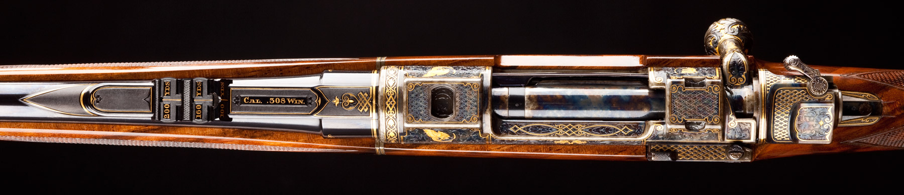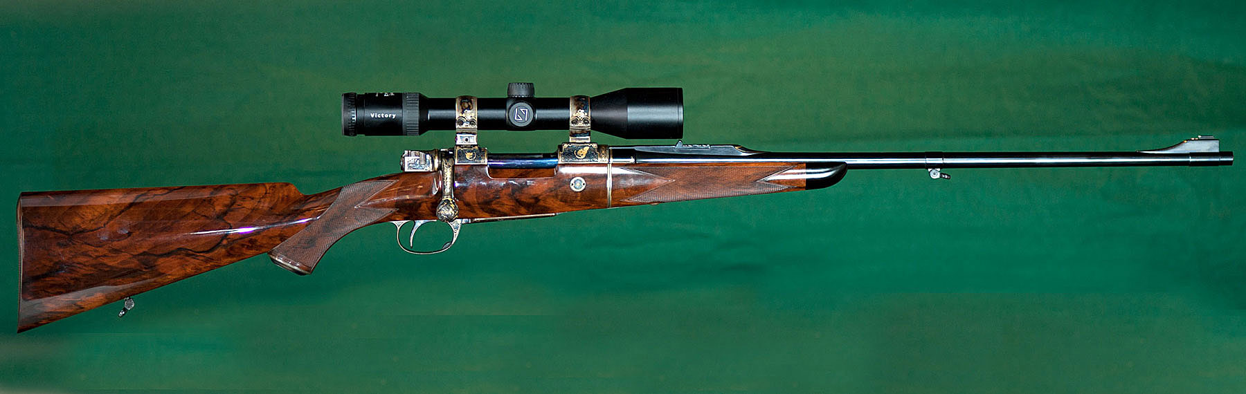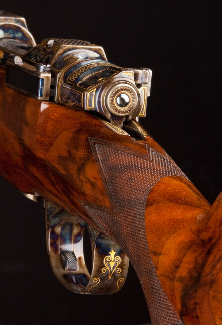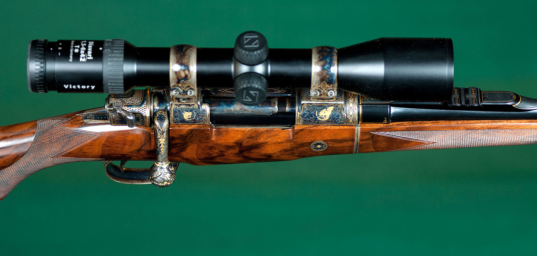 Description: 23 1/2" tapered round barrel with full-band front sight with fine bead and folding twilight bead, full-band swivel base, quarter rib with 1 standing and 2 folding gold-lined express sights with gold-inlaid markings for 100, 160 and 200 yards. Highly-figured, lustrously-finished walnut stock with ebony forend tip, wrap-around point-pattern checkering with mullered borders, Hartmann & Weiss proprietary takedown mechanism, recoil crossbolt, steel pistol grip cap, beaded pancake cheekpiece, rear swivel and checkered butt. 143/8"pull. Hartmann & Weiss, bench-made, color casehardened, Kurz Mauser, double-squarebridge action with Model 70-type safety, checkered trigger, fire-blued extractor and hinged floorplate with release inside triggerguard. Zeiss Diavari 1.5-6x42 T* scope with bold duplex reticle on Riechnagel quick-detachable mounts fitted directly to receiver squarebridges without separate bases. Extensively engraved by Hans Eisbacher: gold griffins on receiver bridges and siderail, platinum griffin on floorplate, gold griffin on triggerguard, gold horned grotesque on floorplate hinge, greenman on cocking piece, three-dimensional gold-backgrounded roccoco acanthus scroll covering bolt knob---all surrounded with deep-cut acanthus scroll and extensive gold-inlaid linework on receiver, bottom metal, scope mounts sights and grip cap; signed behind rear action screw. Weight: 7lbs, 5oz without scope; 8lbs, 10oz with. Built in 2010. New and unfired except by the maker and proof house. Cased in the maker's dark brown pigskin takedown trunk case with deep blue baize lining, leather trade label, turnscrew, cleaning kit and oil bottle and with heavy, leather-bound, linen overcase.