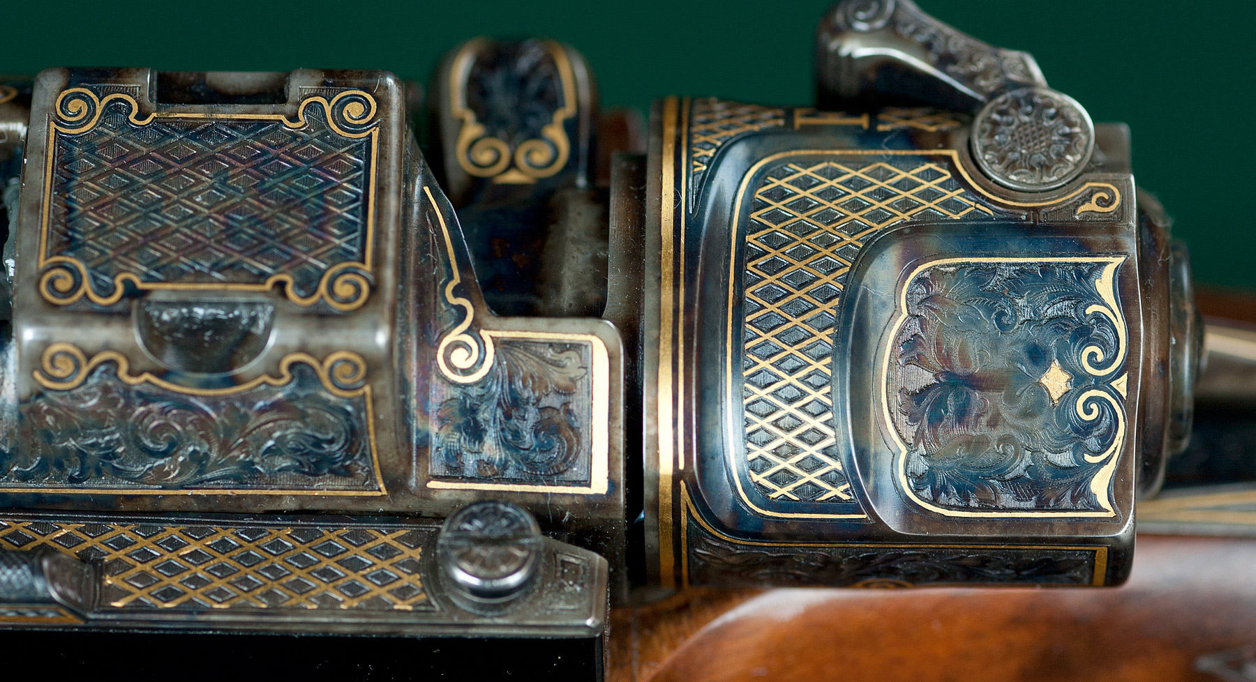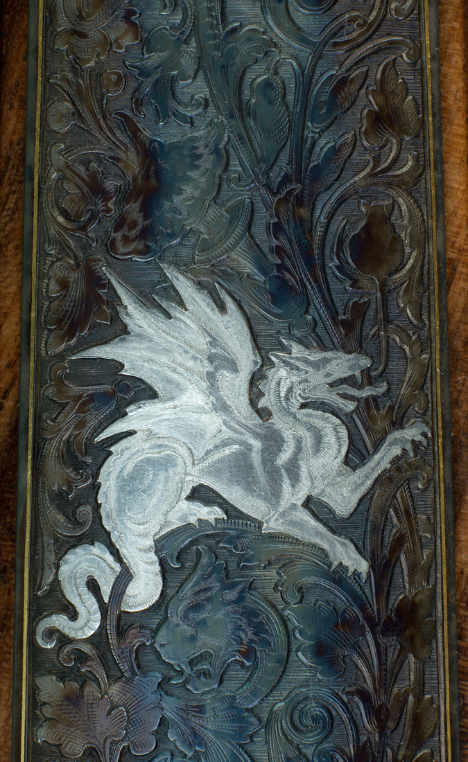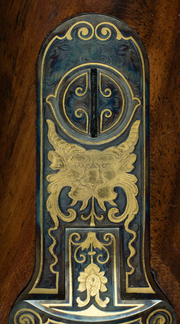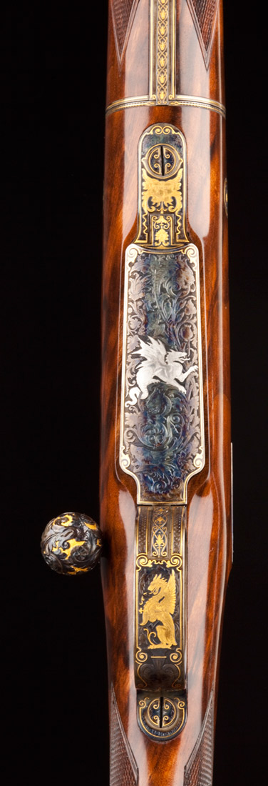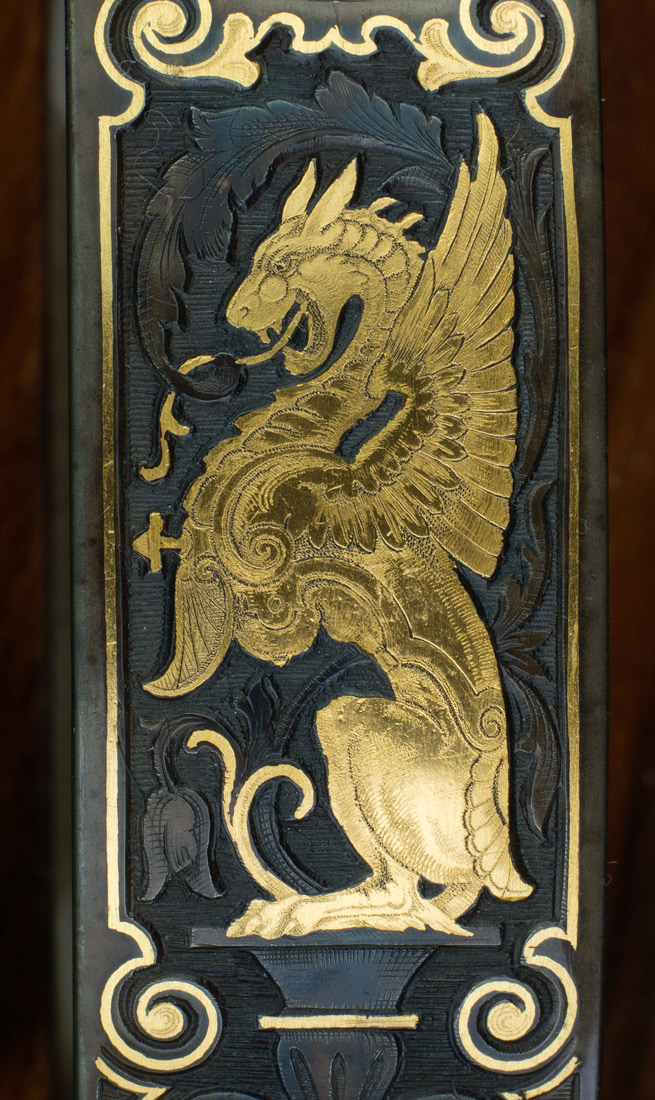 Griffon on top of cocking piece Carved and gold damascened bolt knob
