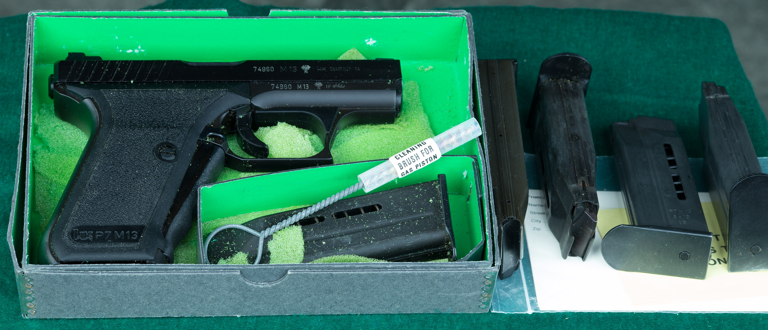 | | with guarantee, cleaning rod and four extra H&K 13-round magazines. Mfd 1985. |