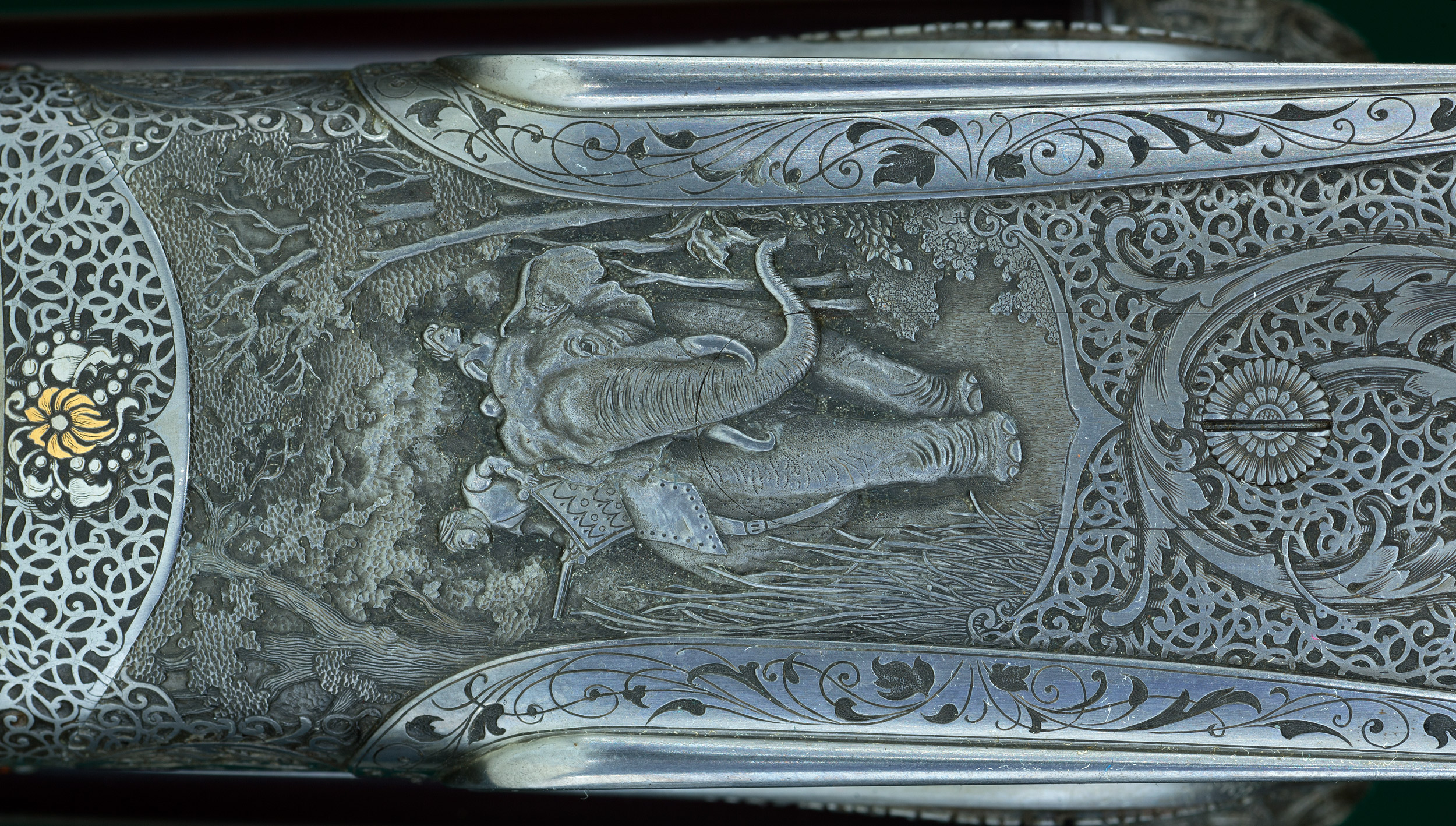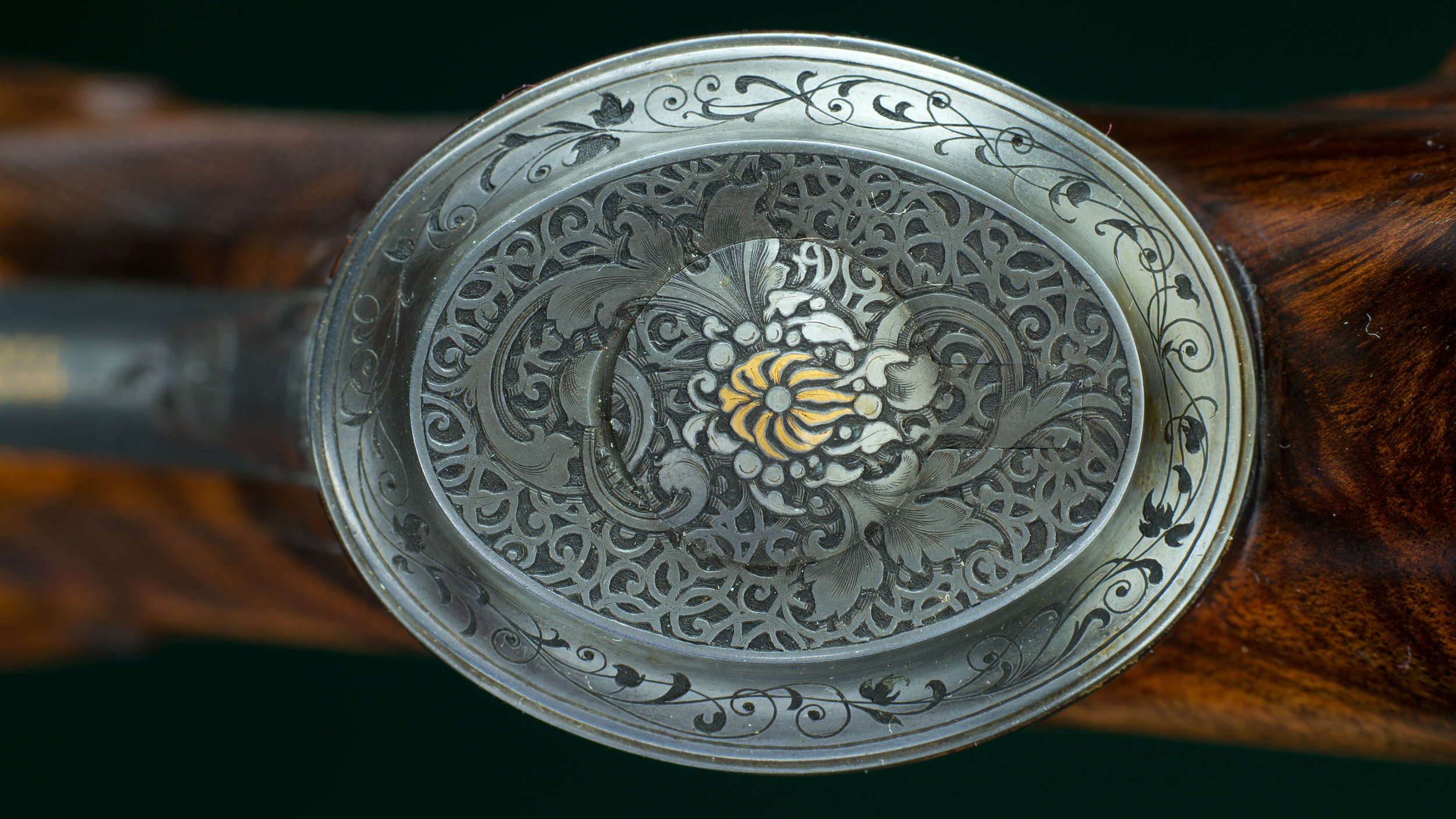 | gold roses on forend iron, triggerguard, breech top, grip trapdoor, and a |