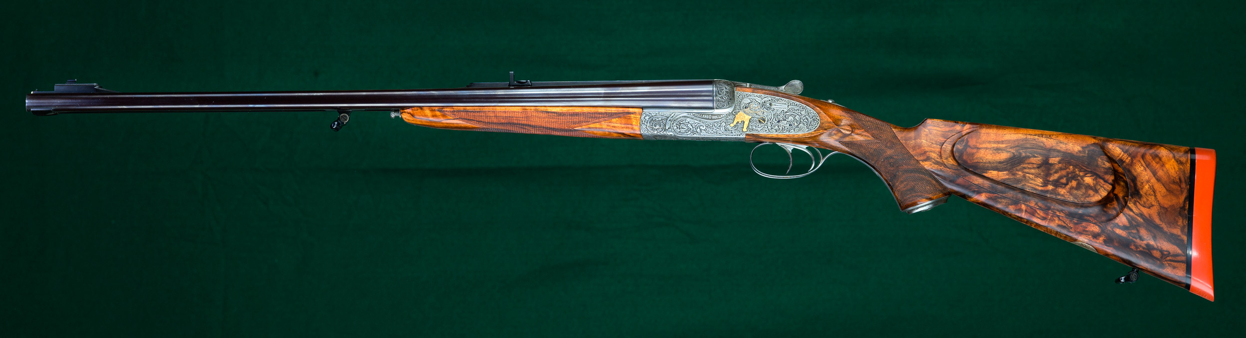 | folding gold-lined express sight regulated for 150 yards. Highly figured |