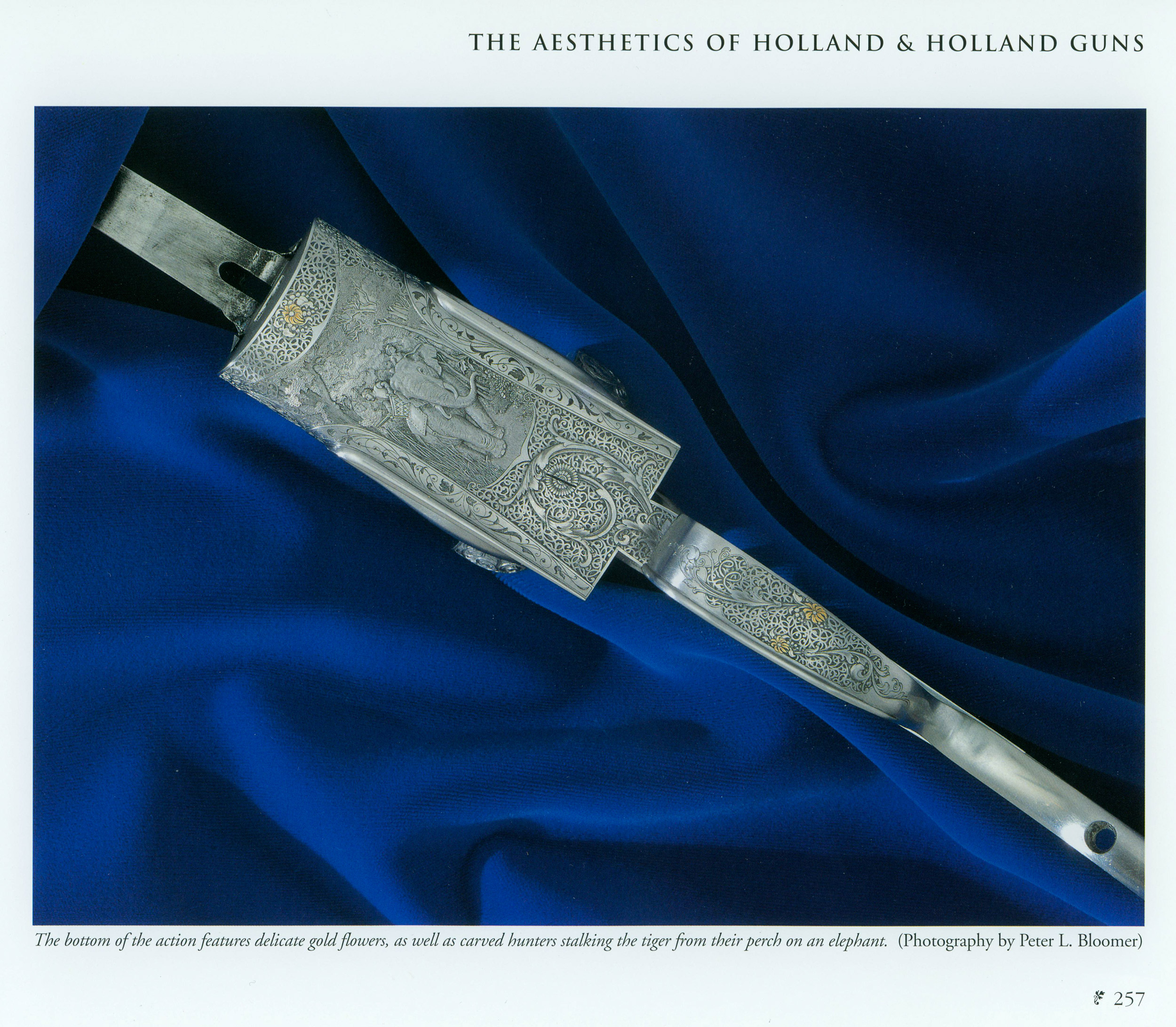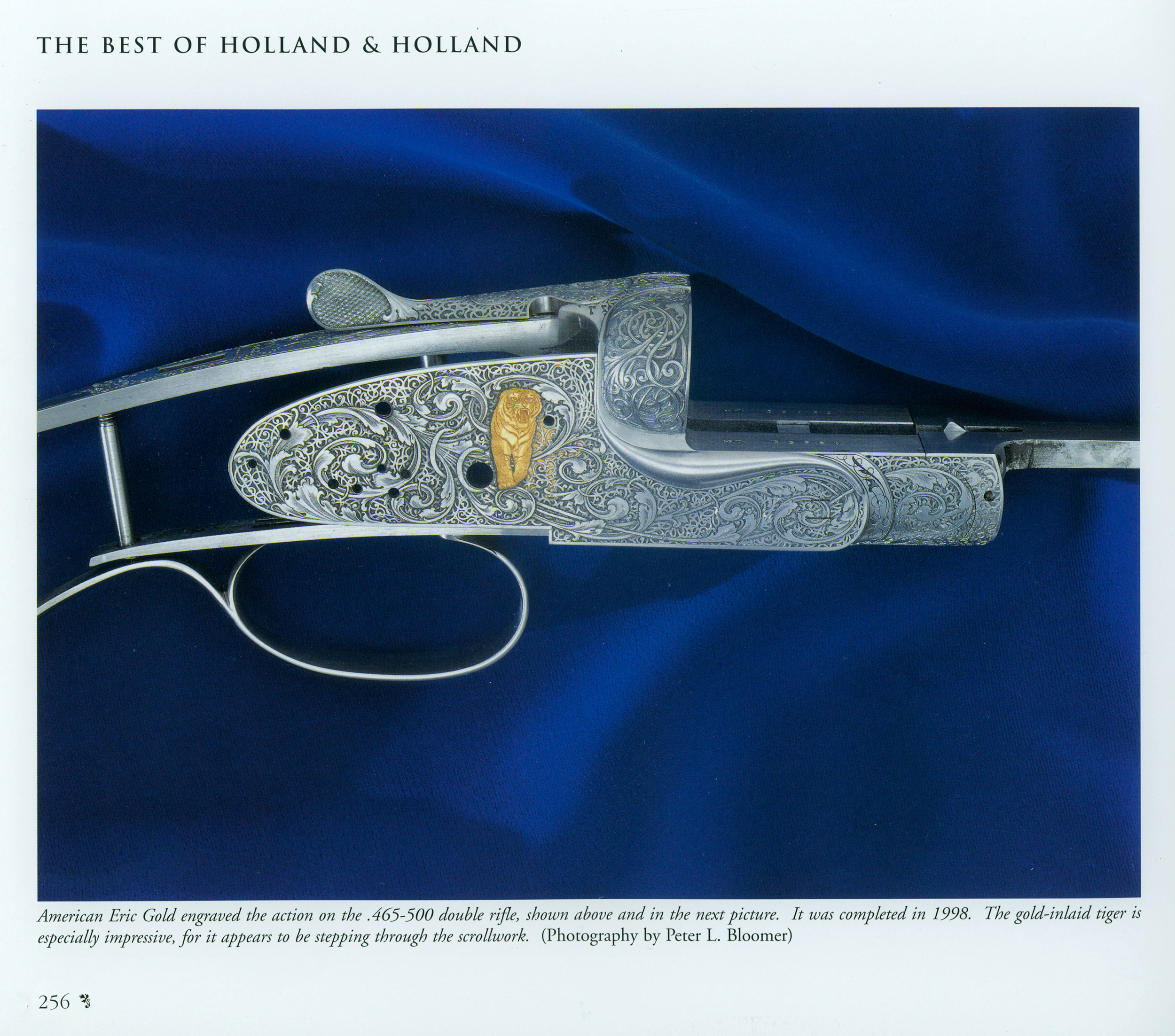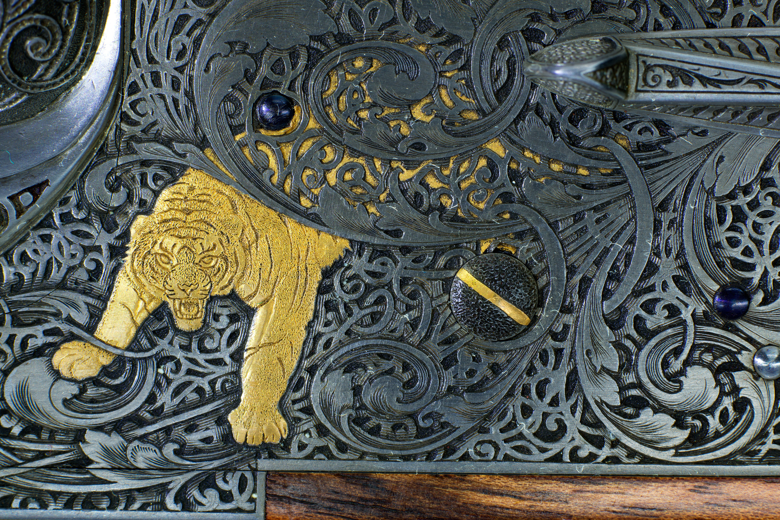 | coin-finished receiver and with an intertwined gold-inlaid tiger on each side, |