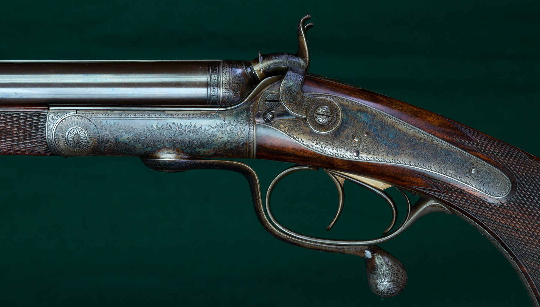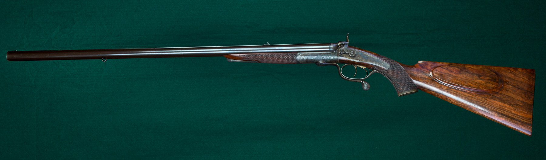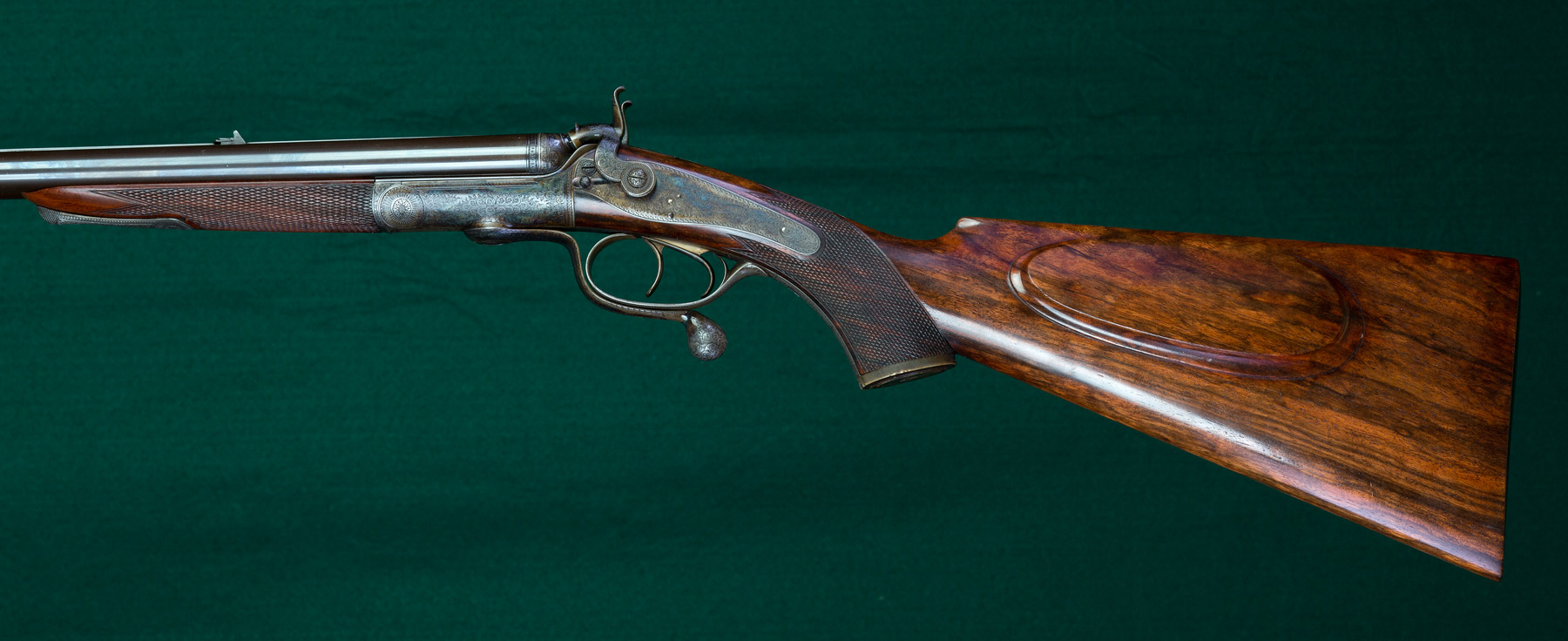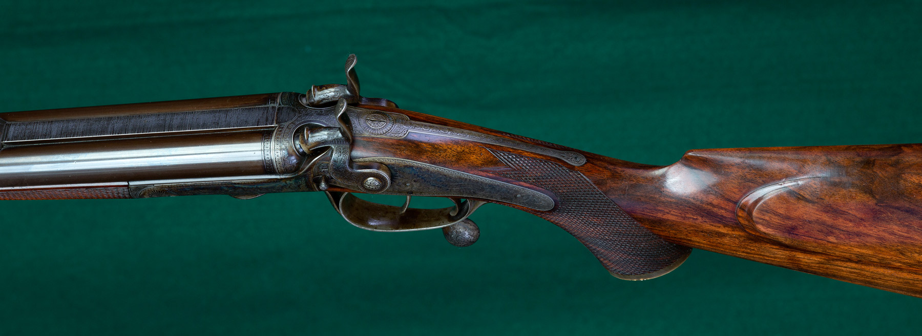 26" SxS barrels of fluid steel with flat file-cut rib, fine front bead, 1 standing & 2 folding platinum-lined express sights, 14 3/8"pull from checkered front trigger to smooth walnut butt. Figured walnut stock with beaded pancake cheekpiece, horn pistol grip cap, classic point-pattern checkering and lever-release splinter forend. Fine scroll engraved peninsula sidelock action with percussion fences, Jones underlever, long bottom tang, non-rebounding hammers and stalking safeties. Groove diameter: .408". Weight: 7lbs, 8oz. Built in 1898. Retaining 95% original barrel brown and 90% original casehardening colors.