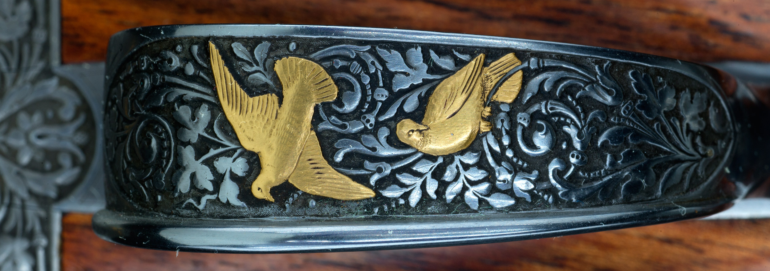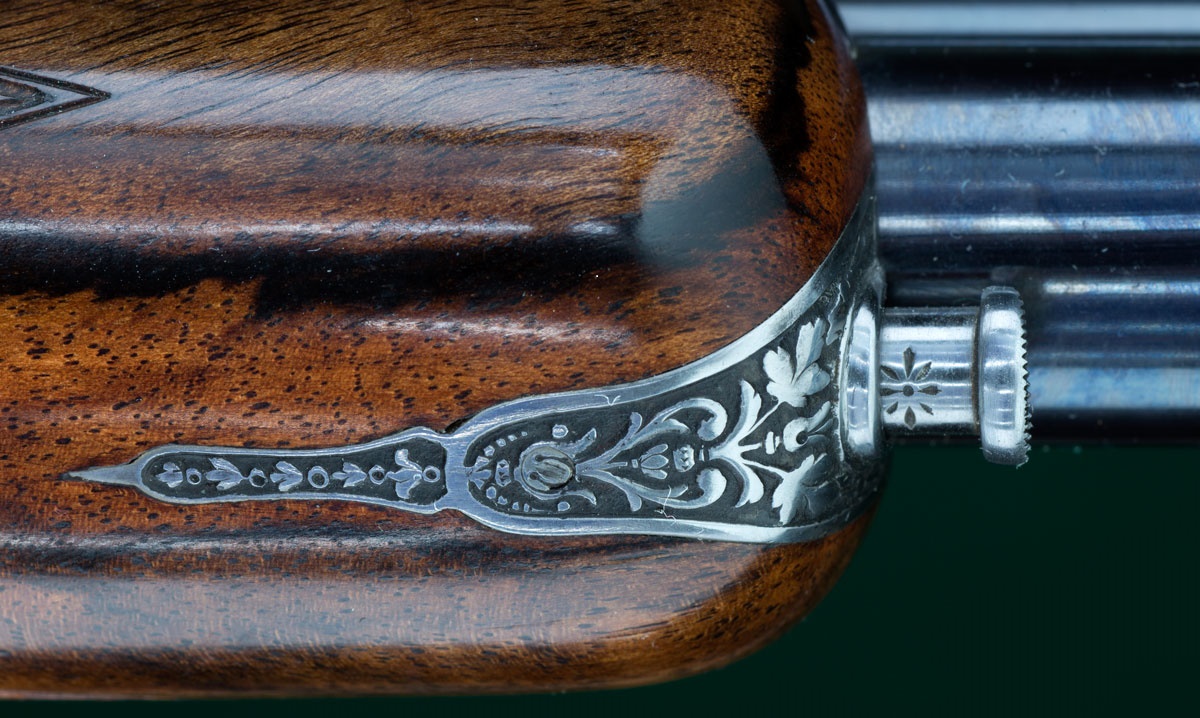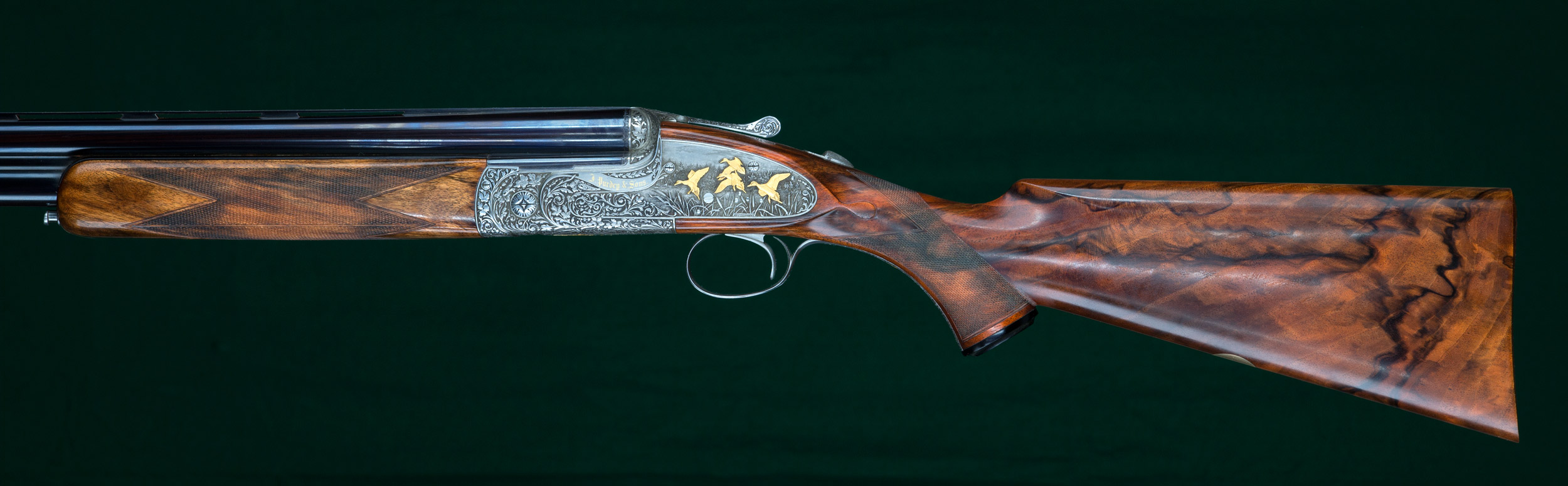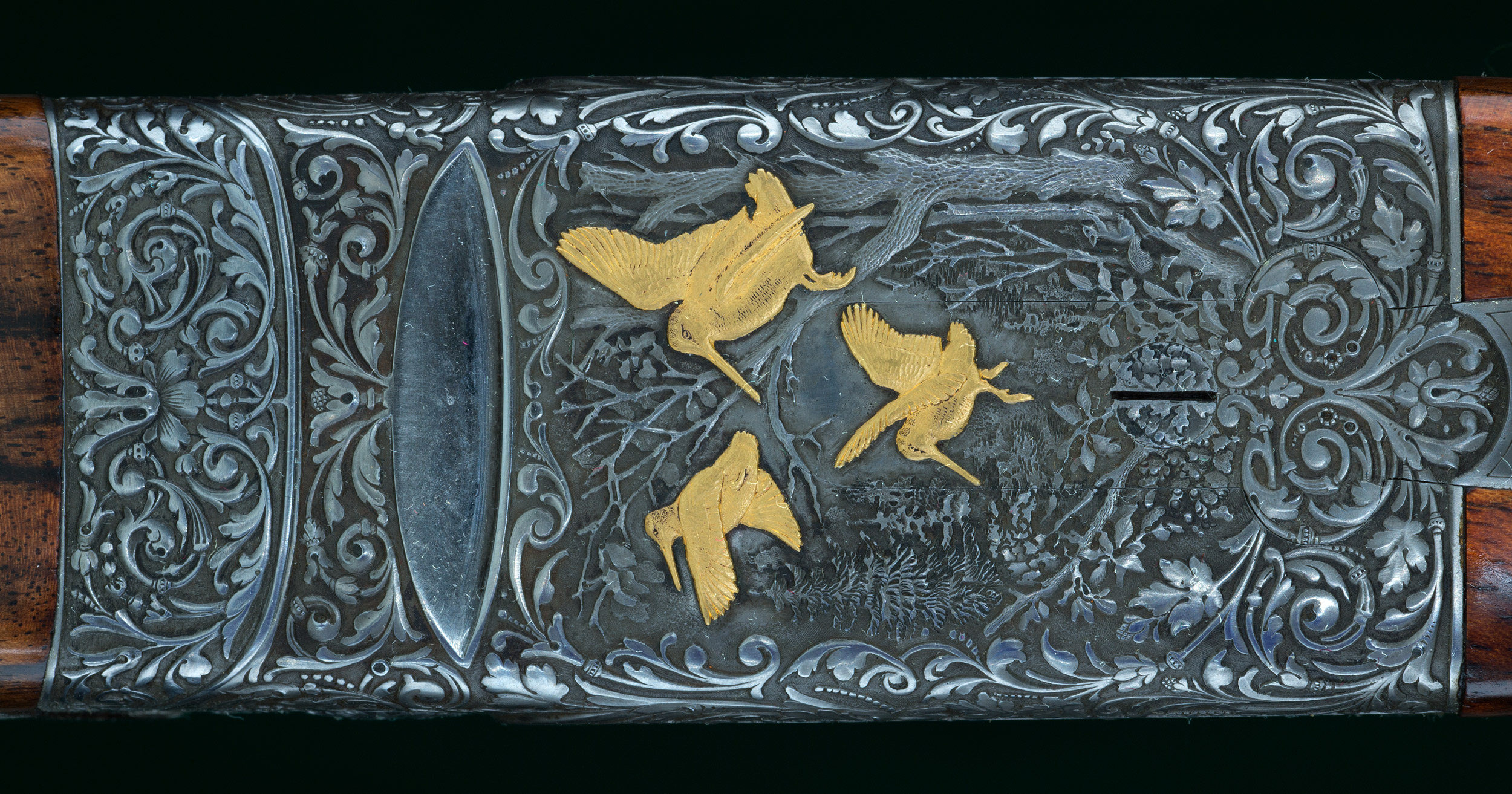 Extensively engraved by Ken Hunt on mutedly coin-finished receiver: four gold-inlaid ducks landing on a cattail marsh on the left lockplate, four grouse flushing in a woodland scene on the right lockplate, three gold-inlaid woodcock rising on the underside and two gold pigeons on the triggerguard. Two tiny small-game animals hidden amongst the foliage. The landscapes of layer upon layer of grasses, brush, trees, forest and distant misty skies are absolutely stunning. And, all surrounded with deep-carved and burnished acanthus scroll. Maker's name flush-gold-inlaid in Old English lettering on both sides of receiver. Serial number inlaid in gold on triggerguard tang. Signed by Ken Hunt on both lockplates. Ken Hunt at his finest; perhaps his masterpiece.