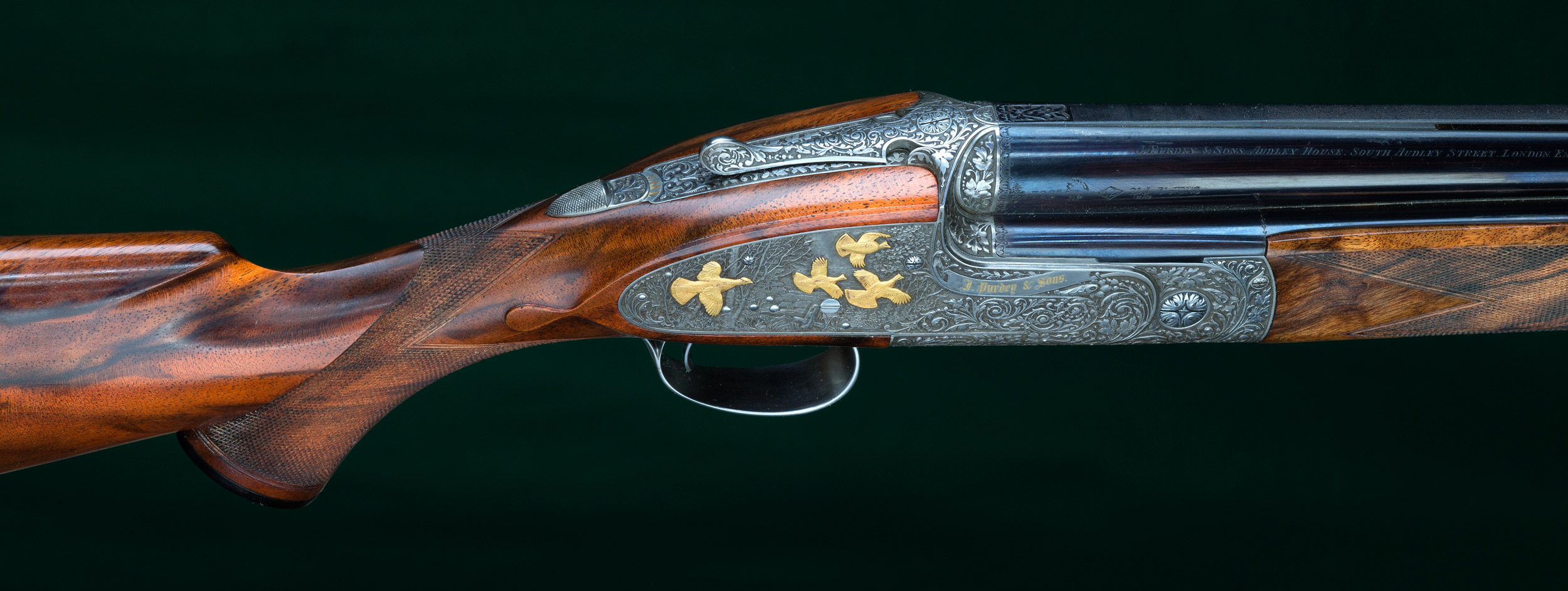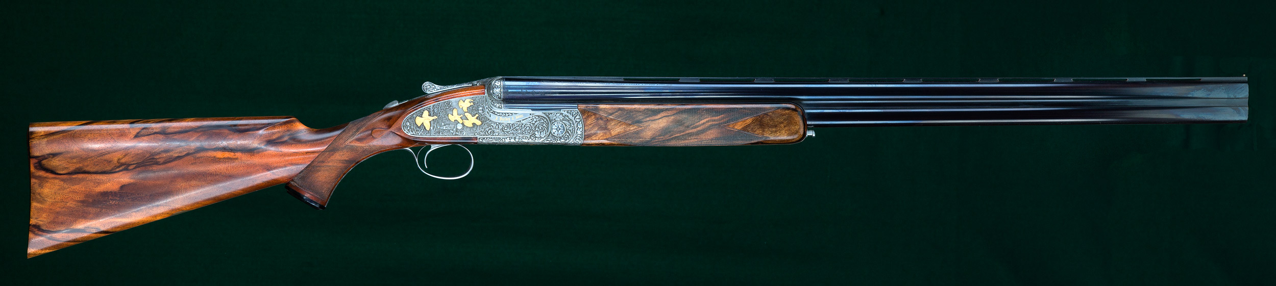 28" O/U chopper-lump barrels with hand-filed matted ventilated rib and one fine brass bead, choked full & extra full. 14 5/8" Length of pull from single non-selective trigger to checkered wood butt. 1 1/2" - 1 3/4" Drop at comb and heel respectively. 1/4" Cast-off for a right-handed shooter. Stocked in highly figured European walnut with Anson pushbutton-release semi-beavertail forend, ebony-capped pistol grip, classic point pattern checkering with mullered borders, teardrops and vacant gold oval. Purdey/Woodward Over & Under action with bifurcated lumps, intercepting sears, cocking indicators, hold-open toplever, extended bottom tang, rolled triggerguard and manual top tang safety with SAFE inlaid in gold.
