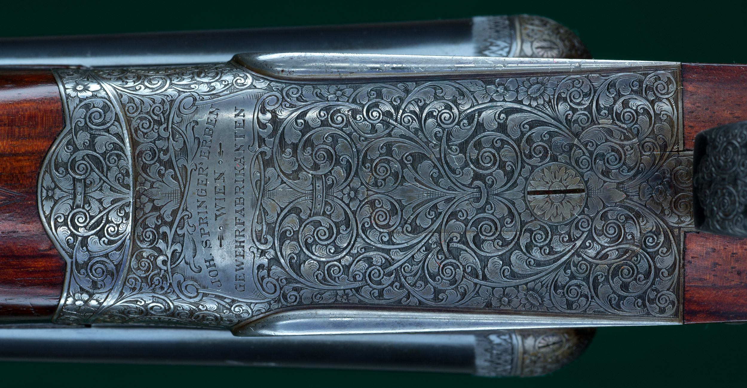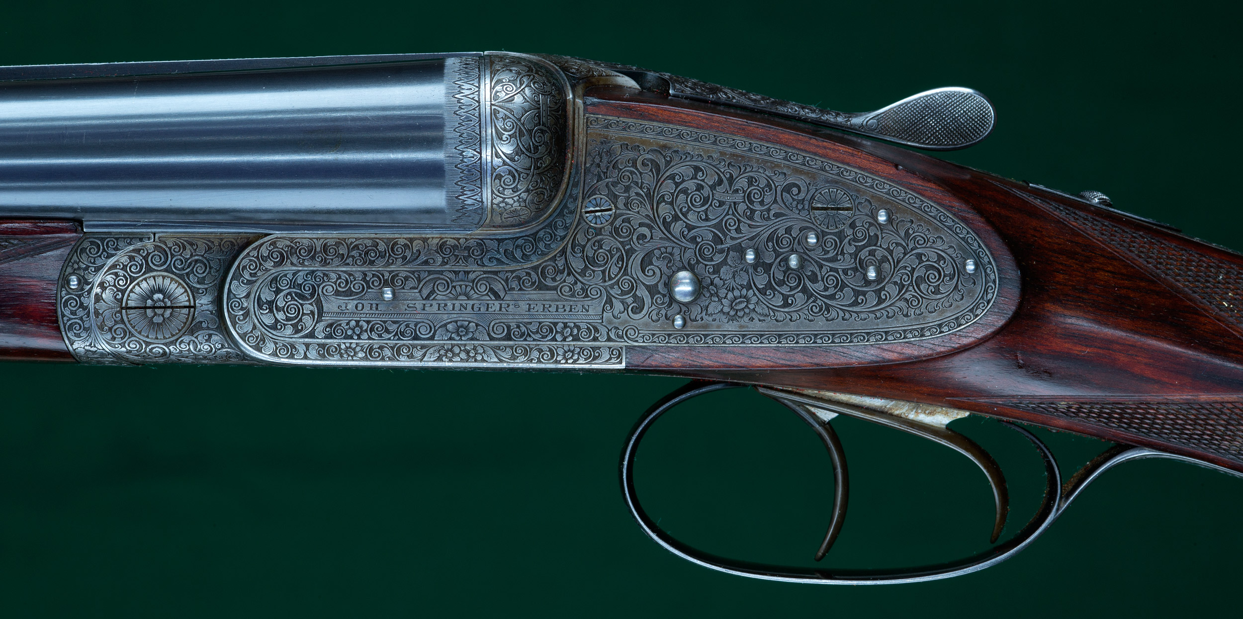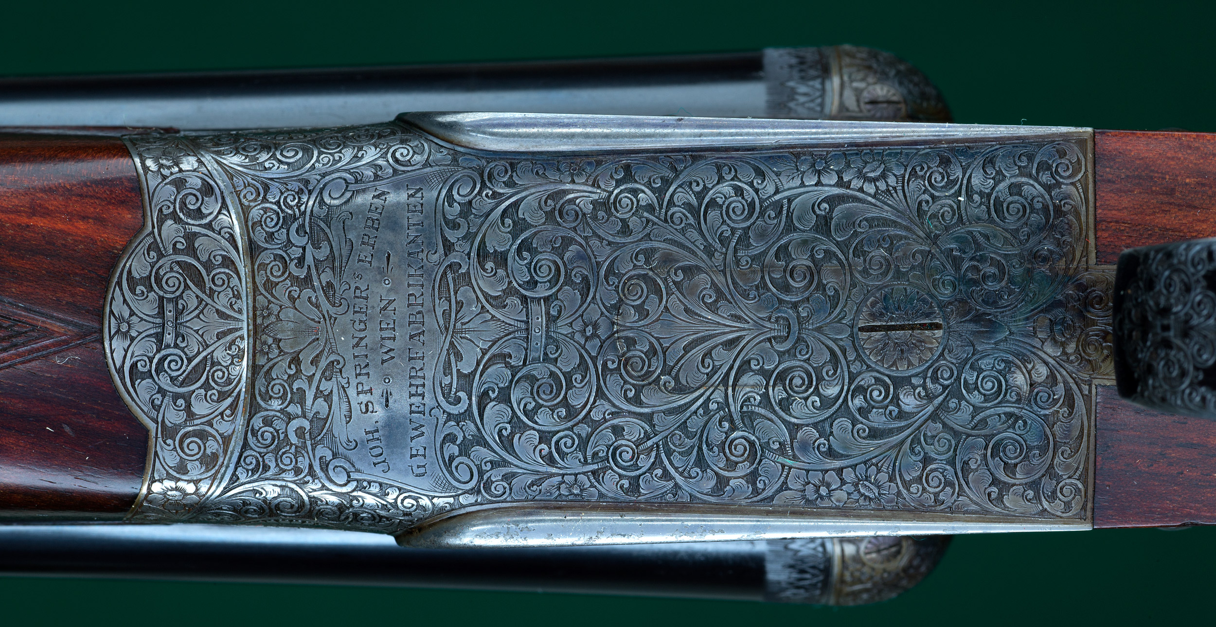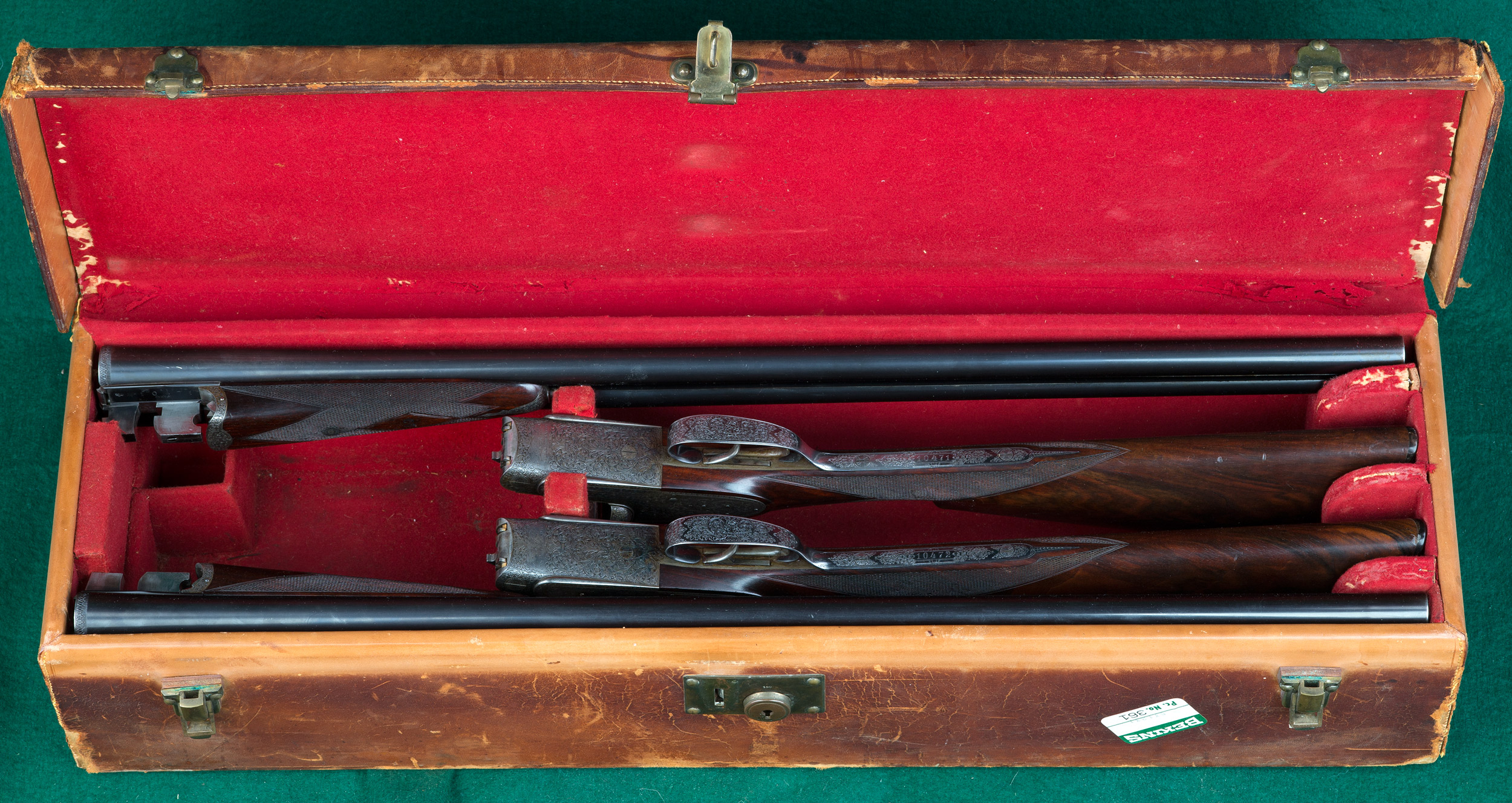 28" SxS chopper-lump barrels of Thomas Kilby Special Fine Steel with concave matted ribs, all choked full and with a touch of engraving at the breeches. 14" length of pull from articulated front triggers to striated horn buttplates. 1 3/8" - 2 1/4" drop at comb and heel. Trace of cast-off. Fully figured, dark, oil-finished European walnut stocks to the fences with Anson-release splinter forends, classic point-pattern checkering with mullered borders, and diamond-section straight English grips. Holland & Holland-pattern bar-action sidelocks with bushed firing pins, concealed third fasteners, intercepting sears, gold-washed internals, Springer's signature elongated toplevers, barrel lumps concealed within action bottom plates, automatic ejectors and automatic top tang safeties with SAFE inlaid in gold, fully engraved in Springer's Holland & Holland-type scroll. Weights: 6lbs, 12oz each. All components numbered 1 & 2; barrels & actions being in gold. CV inlaid in silver on underside of forends. Built 1934. Gun No.1 retaining 98% blue and 30% casehardening colors. Gun No.2 retaining 99% blue and 60% casehardening colors. Tight, and with excellent bores. In original double motor case that has spared no sacrifice to protect the guns.. $19,750. for the pair.