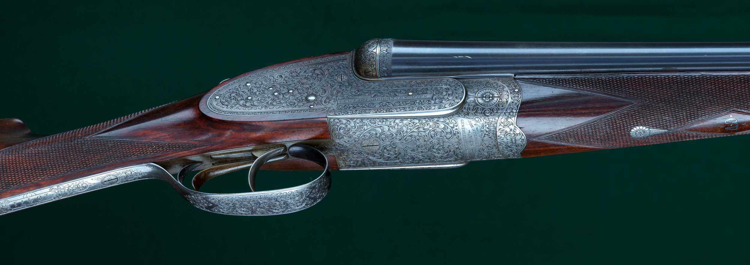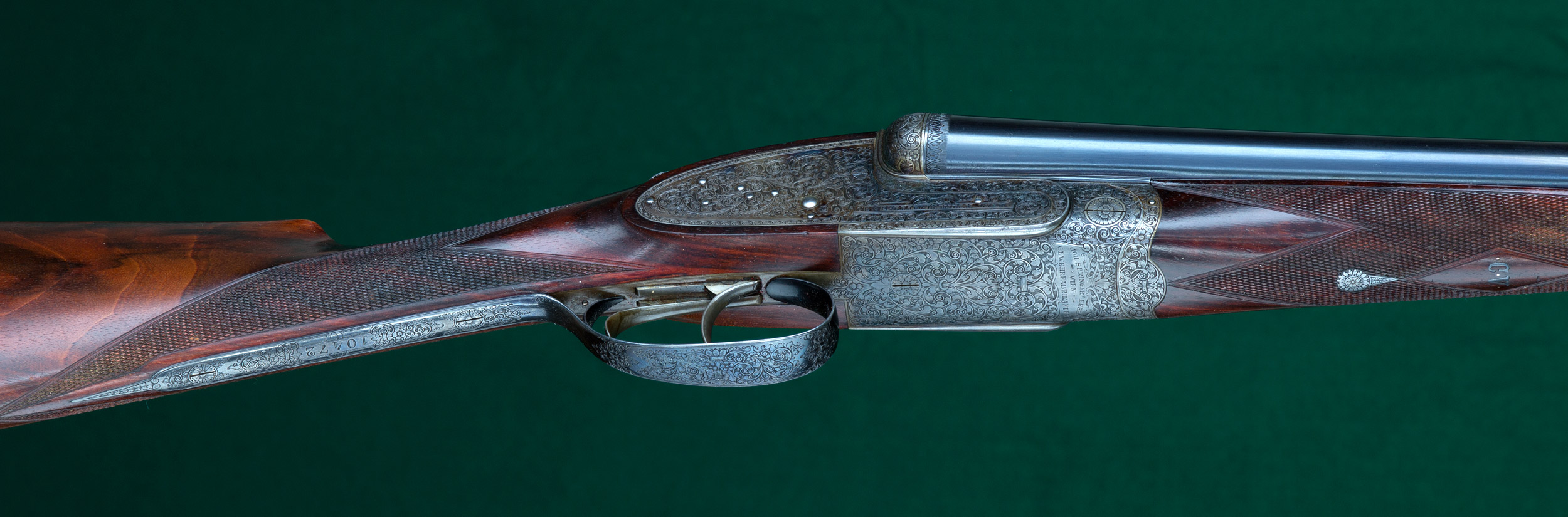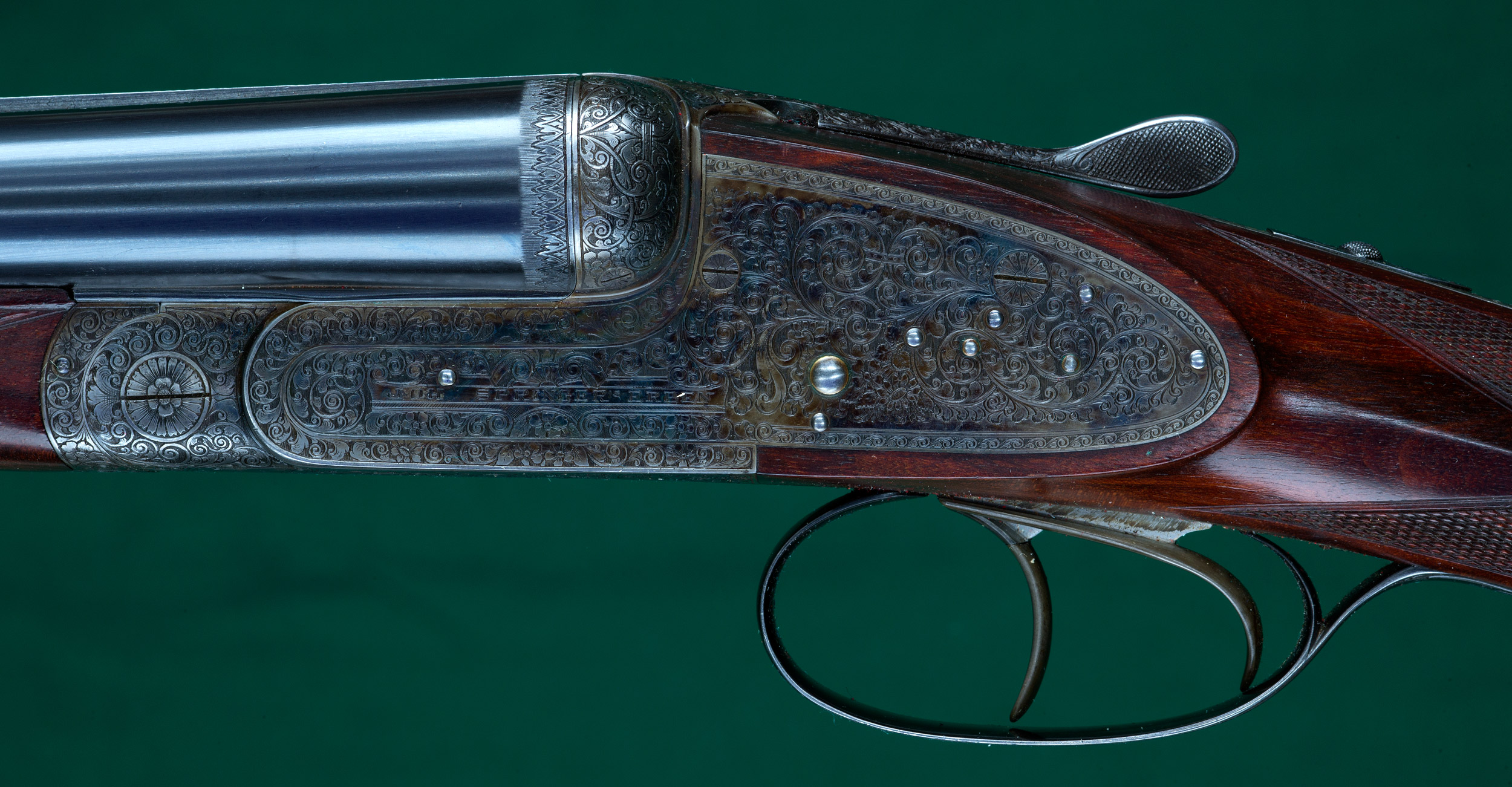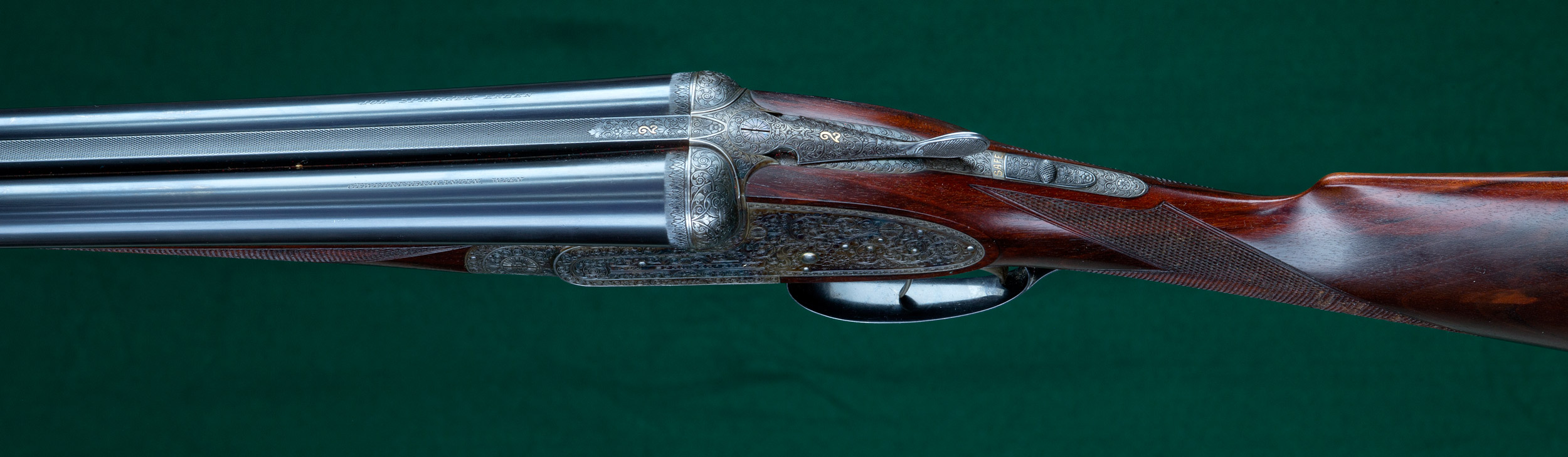 28" SxS chopper-lump barrels of Thomas Kilby Special Fine Steel with concave matted ribs, all choked full and with a touch of engraving at the breeches. 14" length of pull from articulated front triggers to striated horn buttplates. 1 3/8" - 2 1/4" drop at comb and heel. Trace of cast-off. Fully figured, dark, oil-finished European walnut stocks to the fences with Anson-release splinter forends, classic point-pattern checkering with mullered borders, and diamond-section straight English grips. Holland & Holland-pattern bar-action sidelocks with bushed firing pins, concealed third fasteners, intercepting sears, gold-washed internals, Springer's signature elongated toplevers, barrel lumps concealed within action bottom plates, automatic ejectors and automatic top tang safeties with SAFE inlaid in gold, fully engraved in Springer's Holland & Holland-type scroll. Weights: 6lbs, 12oz each. All components numbered 1 & 2; barrels & actions being in gold. CV inlaid in silver on underside of forends. Built 1934. Gun No.1 retaining 98% blue and 30% casehardening colors. Gun No.2 retaining 99% blue and 60% casehardening colors. Tight, and with excellent bores. In original double motor case that has spared no sacrifice to protect the guns.. $19,750. for the pair.