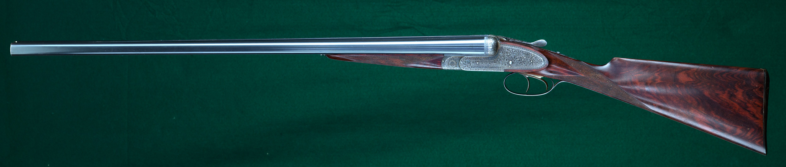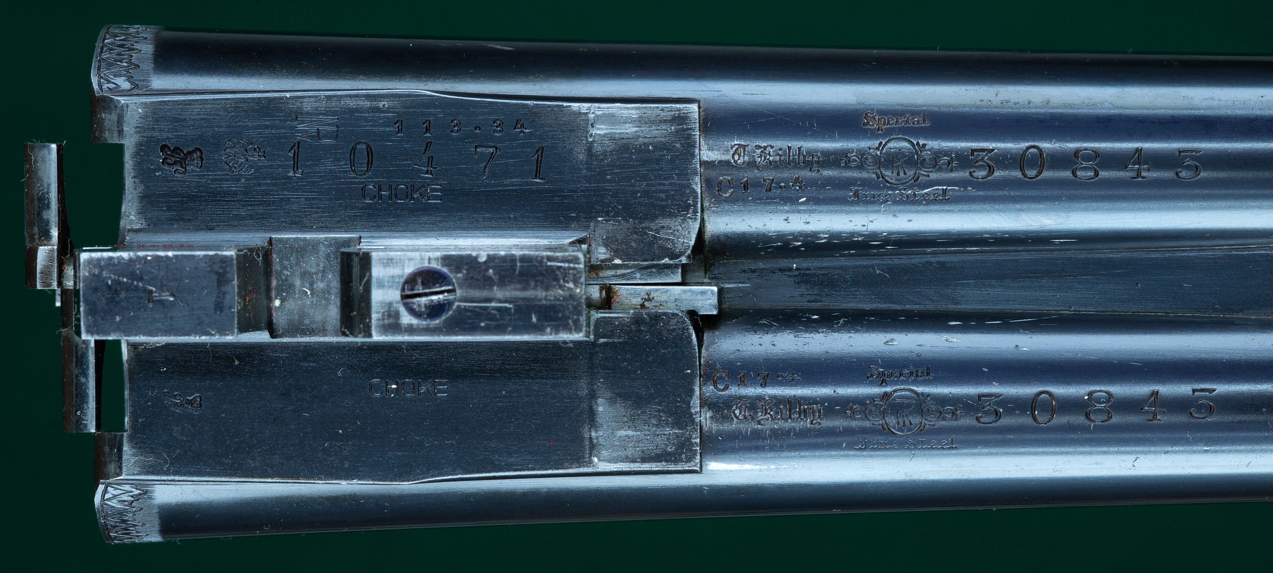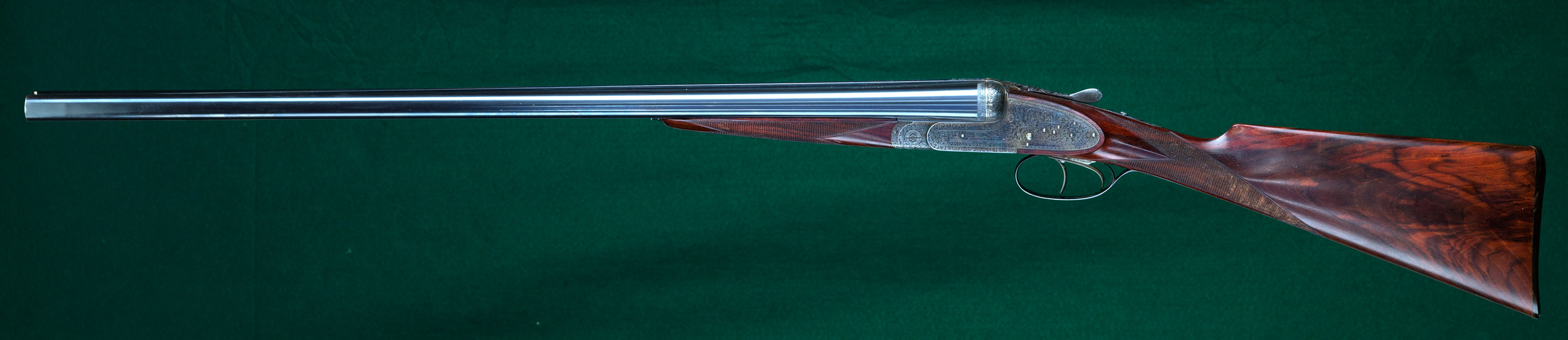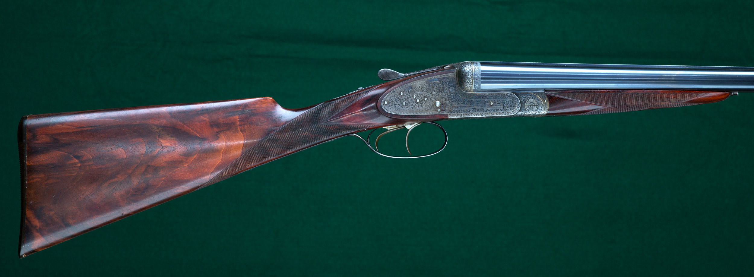 28" SxS chopper-lump barrels of Thomas Kilby Special Fine Steel with concave matted ribs, all choked full and with a touch of engraving at the breeches. 14" length of pull from articulated front triggers to striated horn buttplates. 1 3/8" - 2 1/4" drop at comb and heel. Trace of cast-off. Fully figured, dark, oil-finished European walnut stocks to the fences with Anson-release splinter forends, classic point-pattern checkering with mullered borders, and diamond-section straight English grips. Holland & Holland-pattern bar-action sidelocks with bushed firing pins, concealed third fasteners, intercepting sears, gold-washed internals, Springer's signature elongated toplevers, barrel lumps concealed within action bottom plates, automatic ejectors and automatic top tang safeties with SAFE inlaid in gold, fully engraved in Springer's Holland & Holland-type scroll. Weights: 6lbs, 12oz each. All components numbered 1 & 2; barrels & actions being in gold. CV inlaid in silver on underside of forends. Built 1934. Gun No.1 retaining 98% blue and 30% casehardening colors. Gun No.2 retaining 99% blue and 60% casehardening colors. Tight, and with excellent bores. In original double motor case that has spared no sacrifice to protect the guns.. $19,750. for the pair.