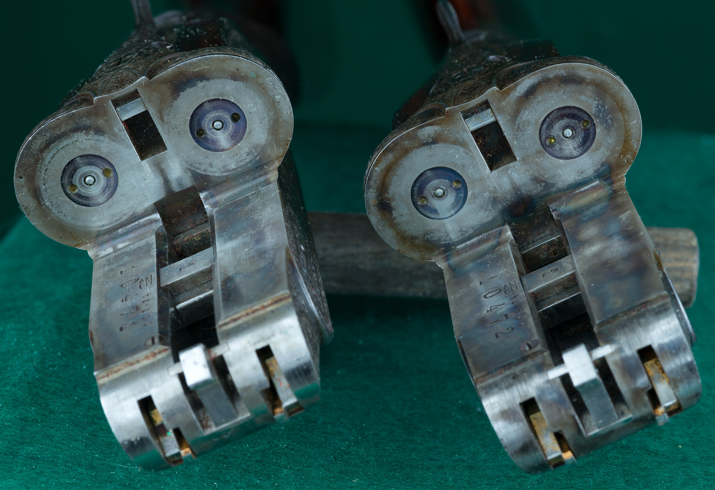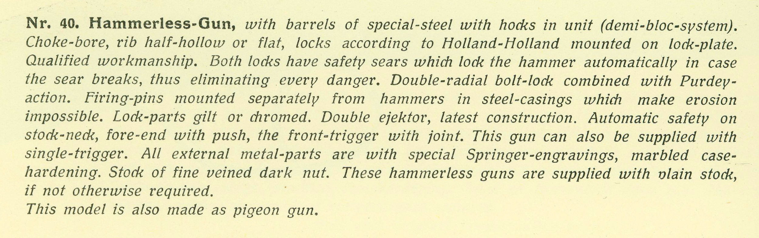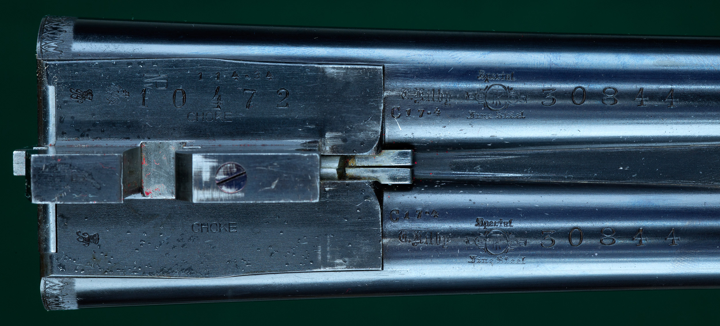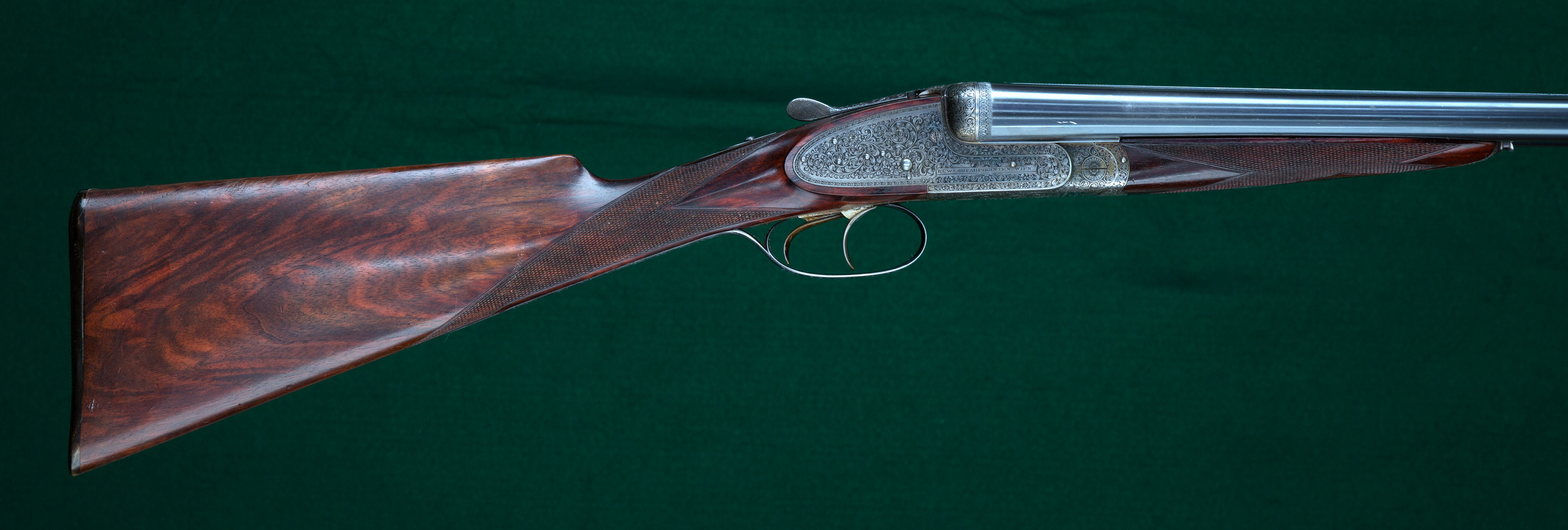 28" SxS chopper-lump barrels of Thomas Kilby Special Fine Steel with concave matted ribs, all choked full and with a touch of engraving at the breeches. 14" length of pull from articulated front triggers to striated horn buttplates. 1 3/8" - 2 1/4" drop at comb and heel. Trace of cast-off. Fully figured, dark, oil-finished European walnut stocks to the fences with Anson-release splinter forends, classic point-pattern checkering with mullered borders, and diamond-section straight English grips. Holland & Holland-pattern bar-action sidelocks with bushed firing pins, concealed third fasteners, intercepting sears, gold-washed internals, Springer's signature elongated toplevers, barrel lumps concealed within action bottom plates, automatic ejectors and automatic top tang safeties with SAFE inlaid in gold, fully engraved in Springer's Holland & Holland-type scroll. Weights: 6lbs, 12oz each. All components numbered 1 & 2; barrels & actions being in gold. CV inlaid in silver on underside of forends. Built 1934. Gun No.1 retaining 98% blue and 30% casehardening colors. Gun No.2 retaining 99% blue and 60% casehardening colors. Tight, and with excellent bores. In original double motor case that has spared no sacrifice to protect the guns.. $19,750. for the pair.