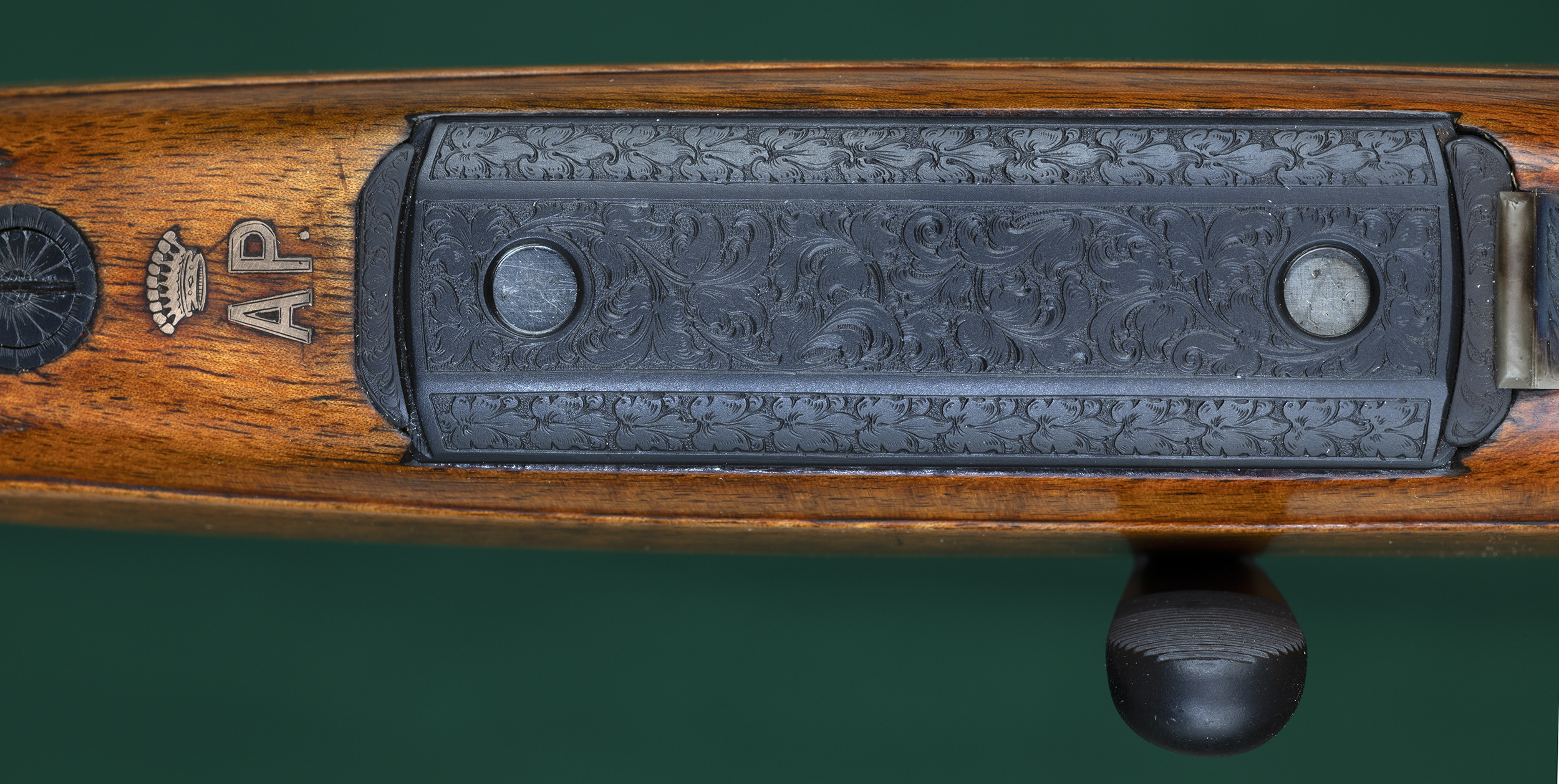 | | AP inlaid in flush gold by Springer. Weights: 7lbs, 3oz with scope; 6lbs, 2 |