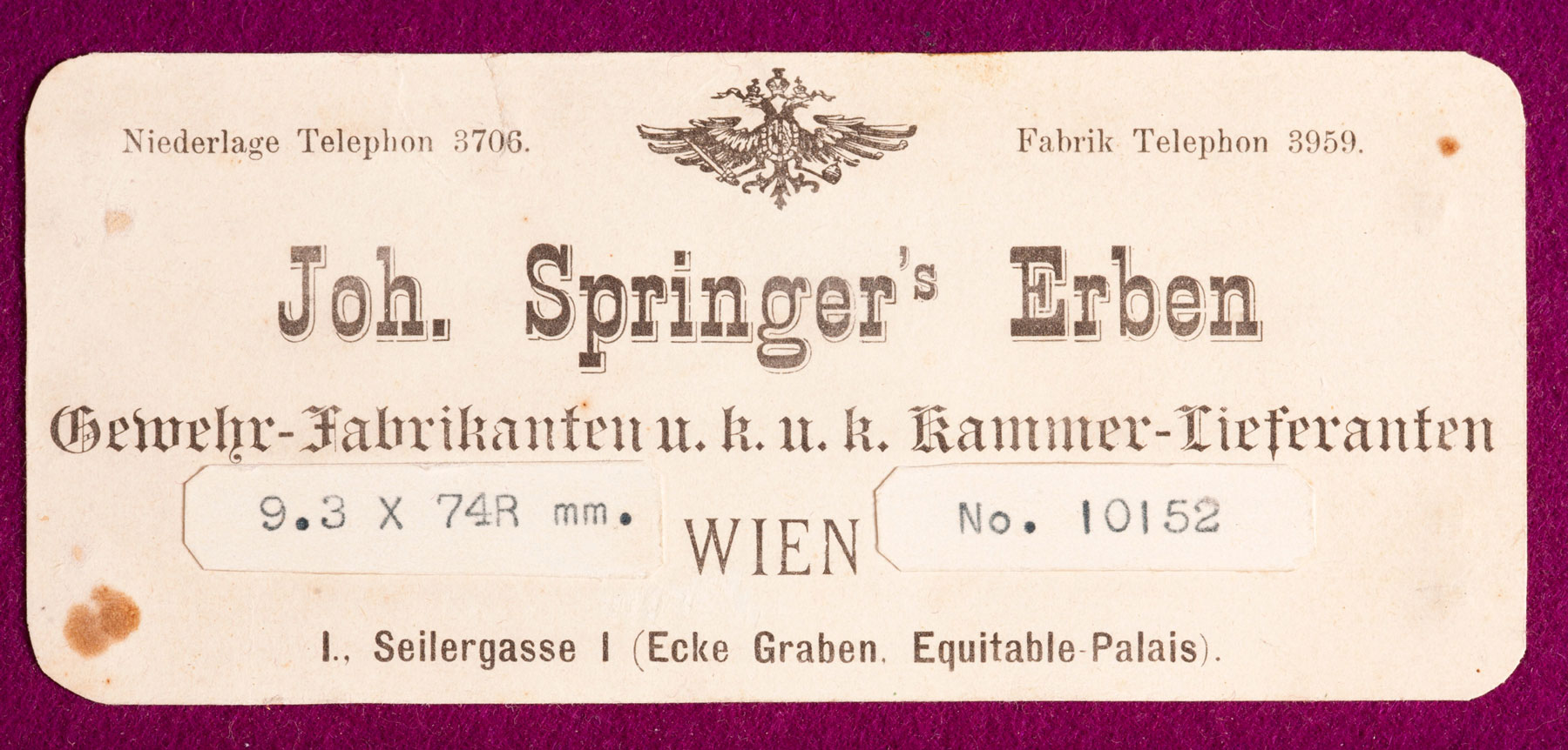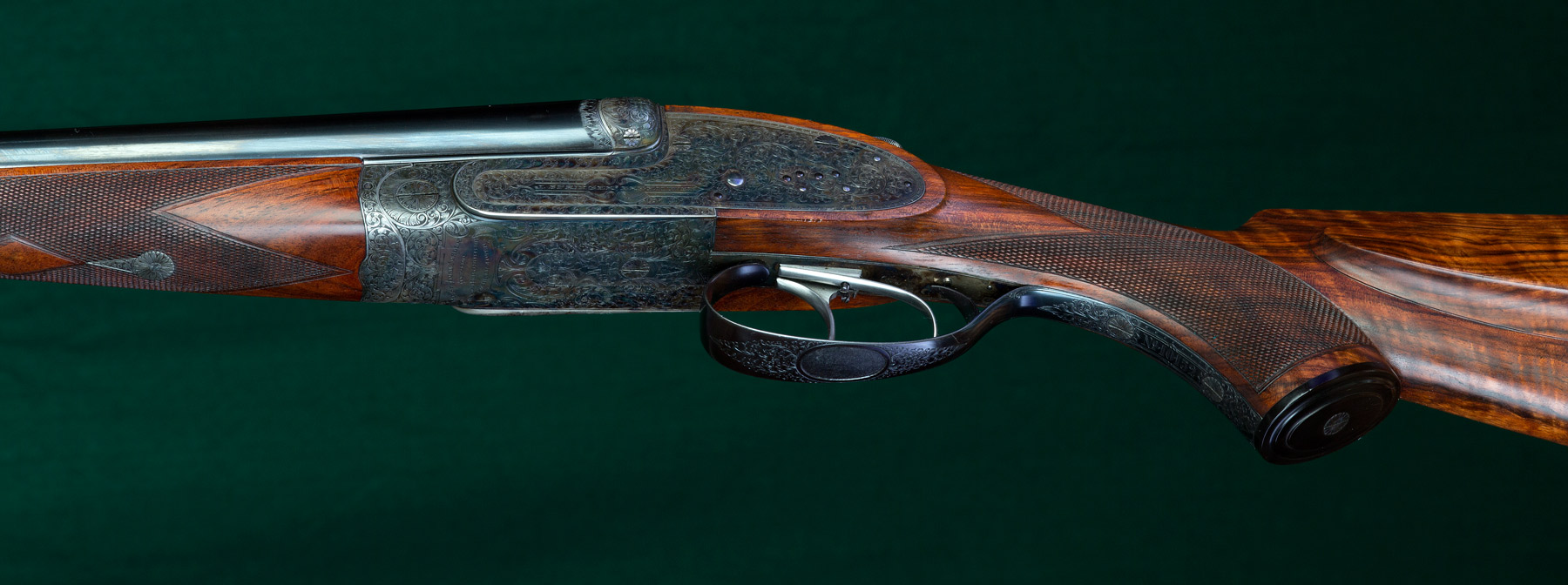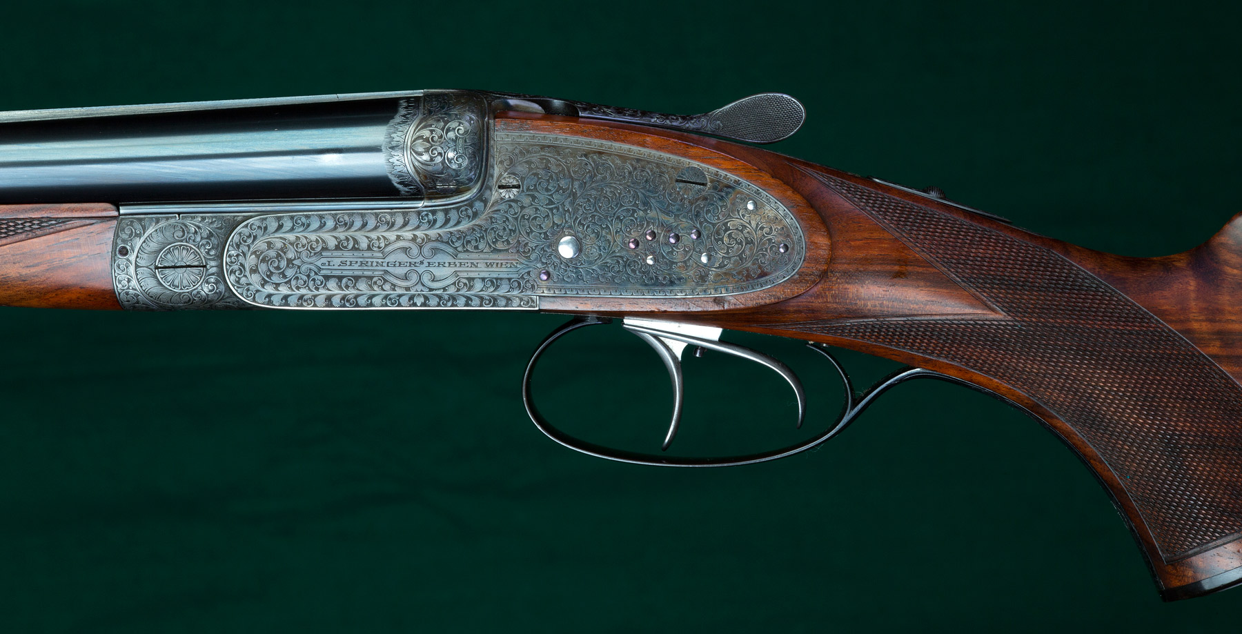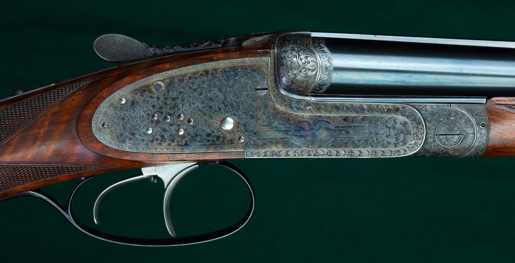 Description: 25" SxS chopper-lump barrels of Poldi Anticorro steel with full raised solid matted rib, fine front bead and pop-up twilight bead, 1 folding leaf sight alternately for 100 or 200 meters and acanthus scroll engraving at the muzzles. 14" pull. Twin, single-set triggers. Fully figured, oil-finished walnut stock with classic mullered-border point-pattern checkering, beaded pancake cheekpiece, thin Silvers red rubber recoil pad, horn-capped pistol-grip cap, Anson-pushbutton-release splinter forend, long lower tang, gold oval engraved with the seven-point coronet over the initial "S" and sling swivels. Holland & Holland-style scroll engraving on casehardened receiver with bushed firing pins, side clips, double underbites, intercepting sears, Holland & Holland-type concealed third fastener and [automatic] SAFE in gold. Weight: 8lbs, 2oz. Built in Vienna, in the English style in 1925. Delivered to the Baronet Styrena in 1926. With superb quality and in immaculate condition retaining 99% barrel blue and 98% casehardening colors. Tight. Excellent bores. In English leather motor case with Springer trade label.