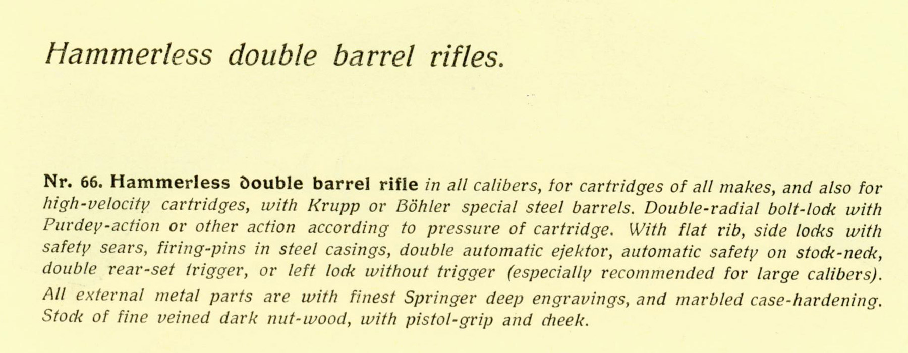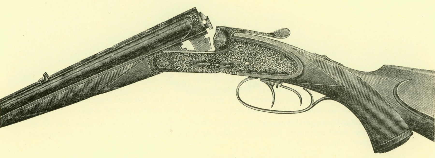 From Springer's order book: 10152 Edwin Svestberg, St. Petersburg Hammerless Double Rifle, Holland and Holland system with ejectors in calibre 9.3mm, for 3.5 grams military flake powder and expanding or brass-jacketed bullets. Barrels fabricated from Poldi Anticorro steel, sight system in accordance with customer’s drawing. Regulated with rear sight for 100 meters with flip-up second leaf for 200 meters, both with fine front bead. Fine front sight with silver bead, larger flip-up “night” front sight. Rear tang Safety not automatic. Double Purdey underbolts and sideclips. Forend with Purdey pushbutton. Trigger for the right barrel without set, left barrel crisp trigger with set. Dark, pretty wood stock with the following measurements: Length 360, 345, 365 mm, Drop 40 and 55, cast off 8 mm. Pistol grip and triggerguard engraved with gold monogram E.S. Engraving in style of Holland. The rifle must be first class manufactured, finest workmanship, finest deep Holland engraving – gun must shoot outstandingly, especially both barrels together. After completion it is to be delivered to the customer through the Warsaw Hunting Club. Accompanying ammunition has yet to be ordered.