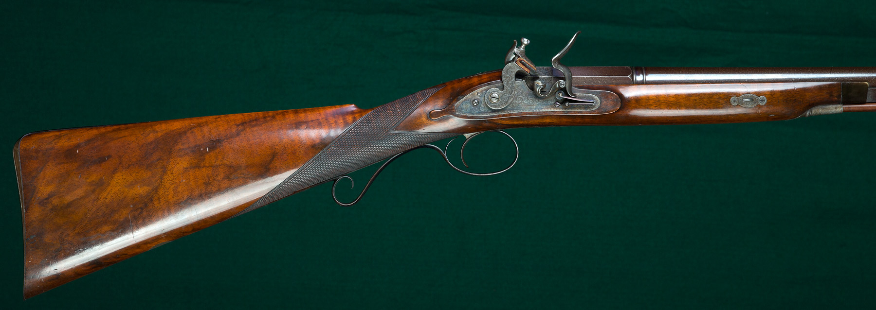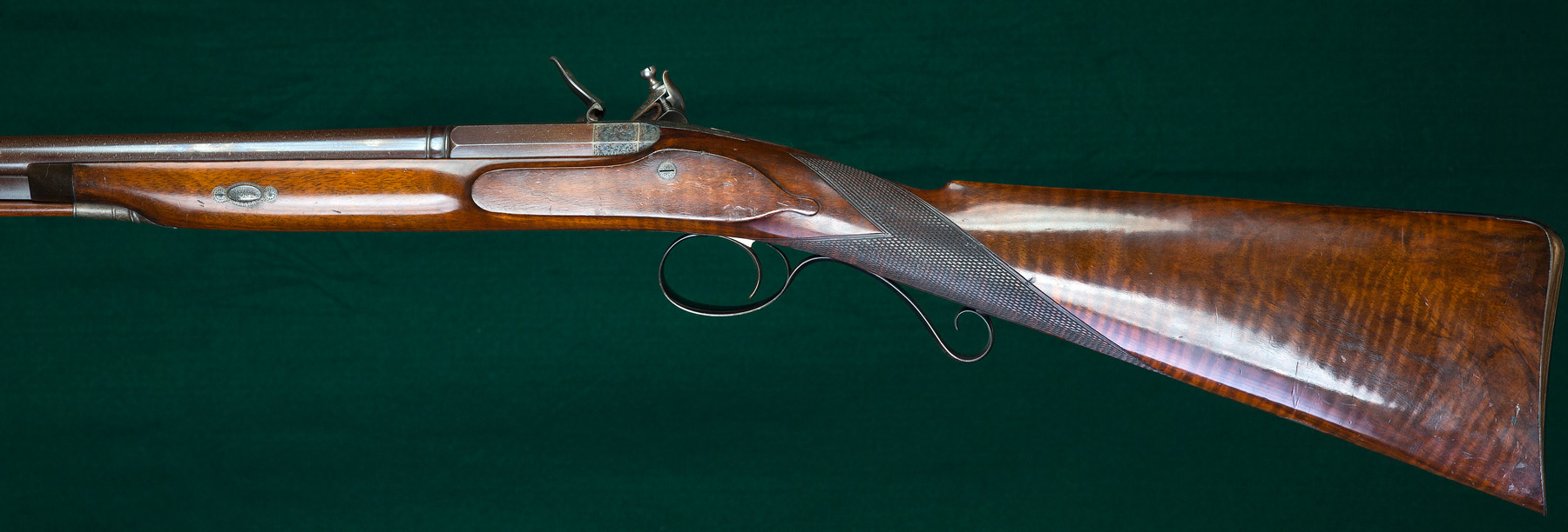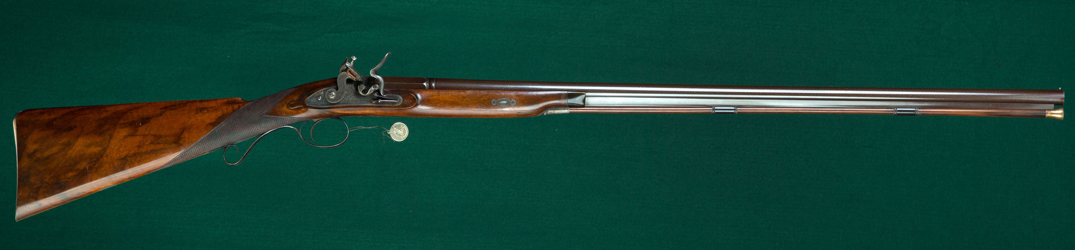 Description: 35" round damascus barrel with wedding-band transition to octagonal breech section, single fine steel front bead sight and scroll engraved casehardened breechplug. 15" length of pull to smooth steel buttplate with extended, engraved top heel flange. Fine scroll engraved, case-colored lock with swept rainproof pan, ventilated pan-cover with roller-bearing frizzen, flat-sided hammer and platinum-lined touch hole. Varnished, figured walnut stock with horn forend tip, crosspin fastener with engraved escutcheons, checkered grip, teardrops, pineapple finial and vacant silver escutcheon. Scroll engraved pistol-grip triggerguard. Brass-tipped ramrod retained under barrel with three pipes. Weight: 6lbs, 3oz. Retaining most all of its original finish and possibly unfired.
