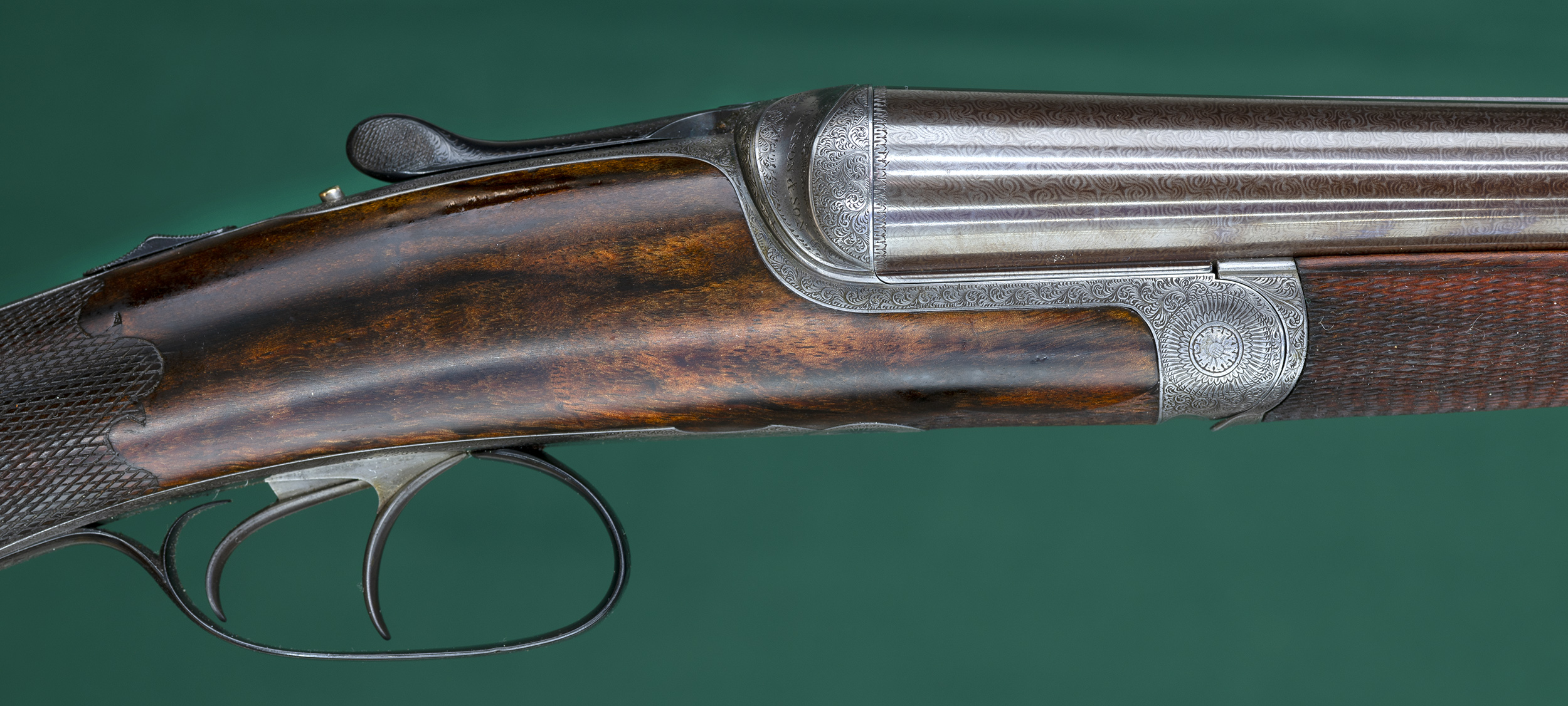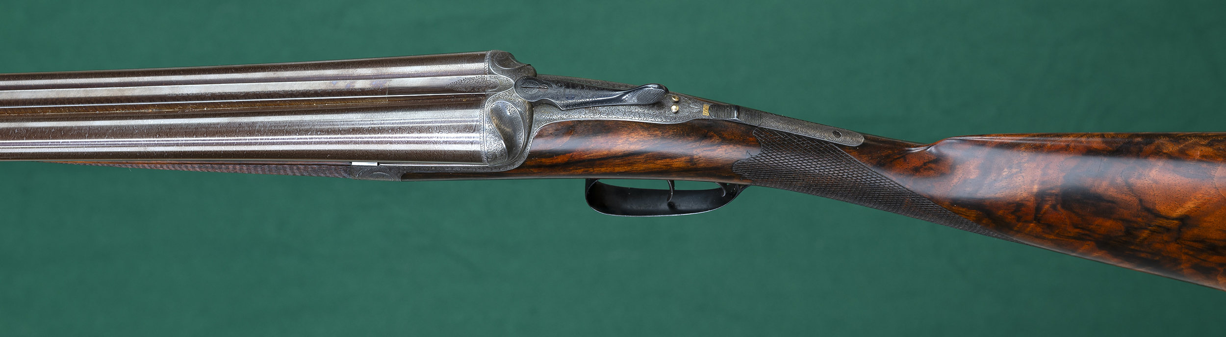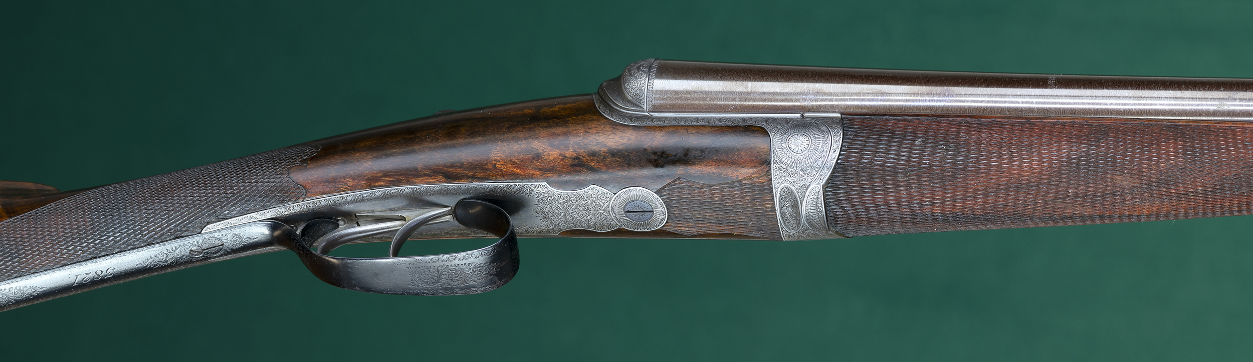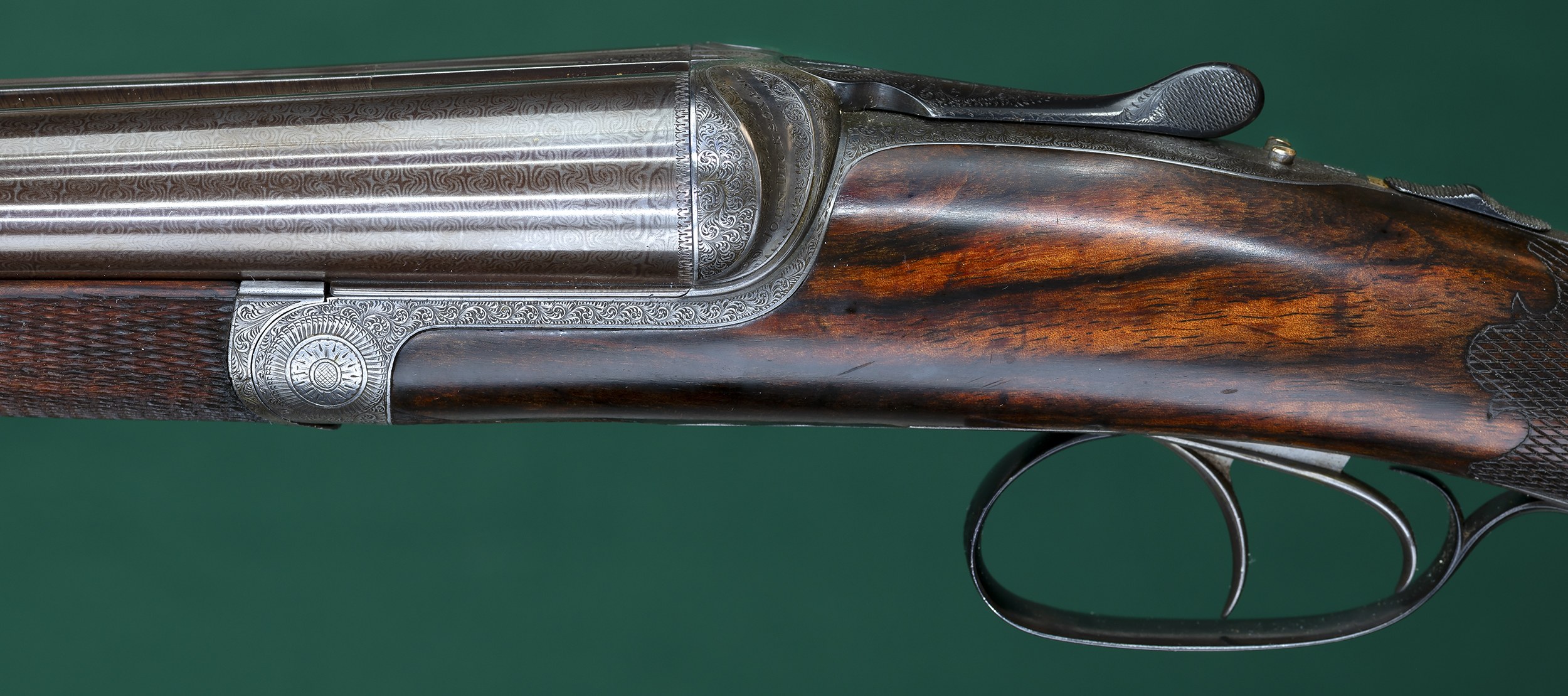 | | monogram. Fine English scroll engraved round-body, bar-in-wood action |
