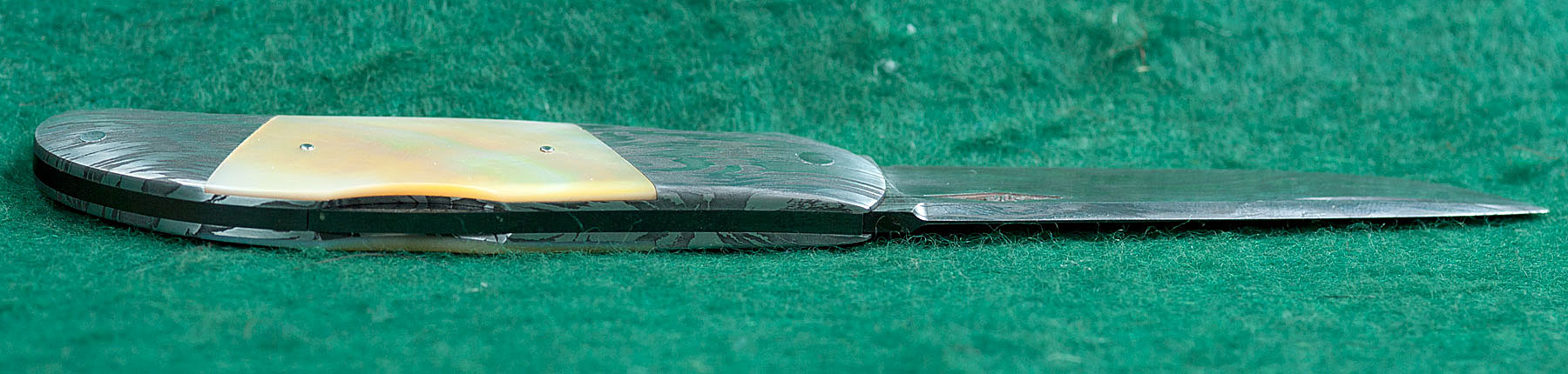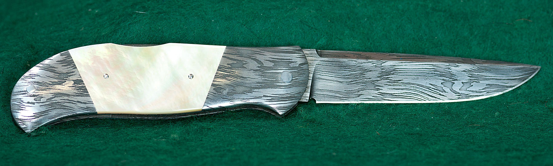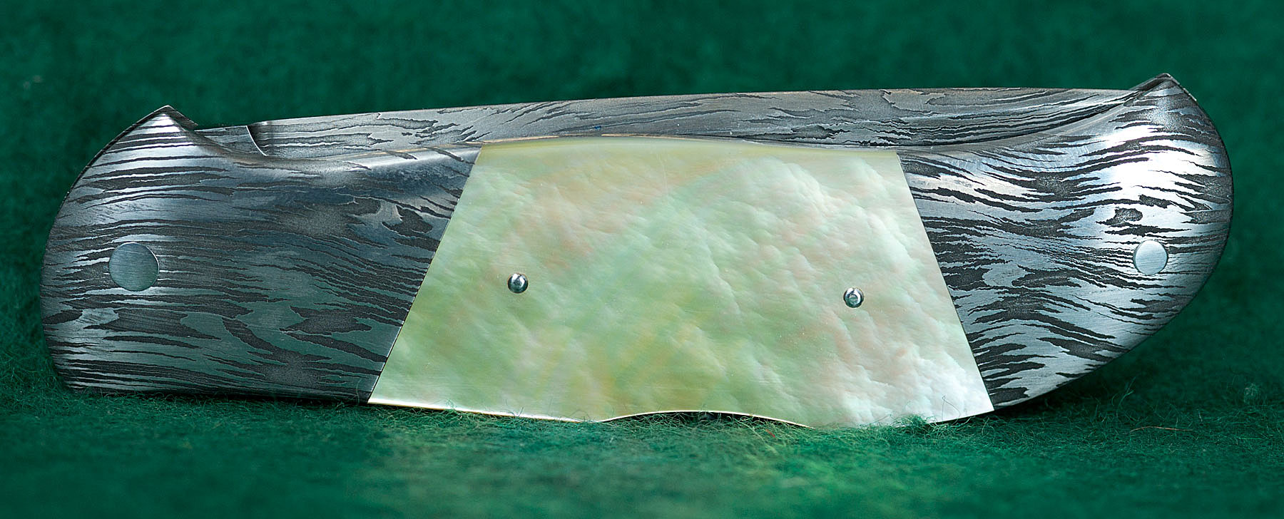 2 3/4" damascus blade. matching damascus frame with flush inserts of smooth gold-lip mother- |