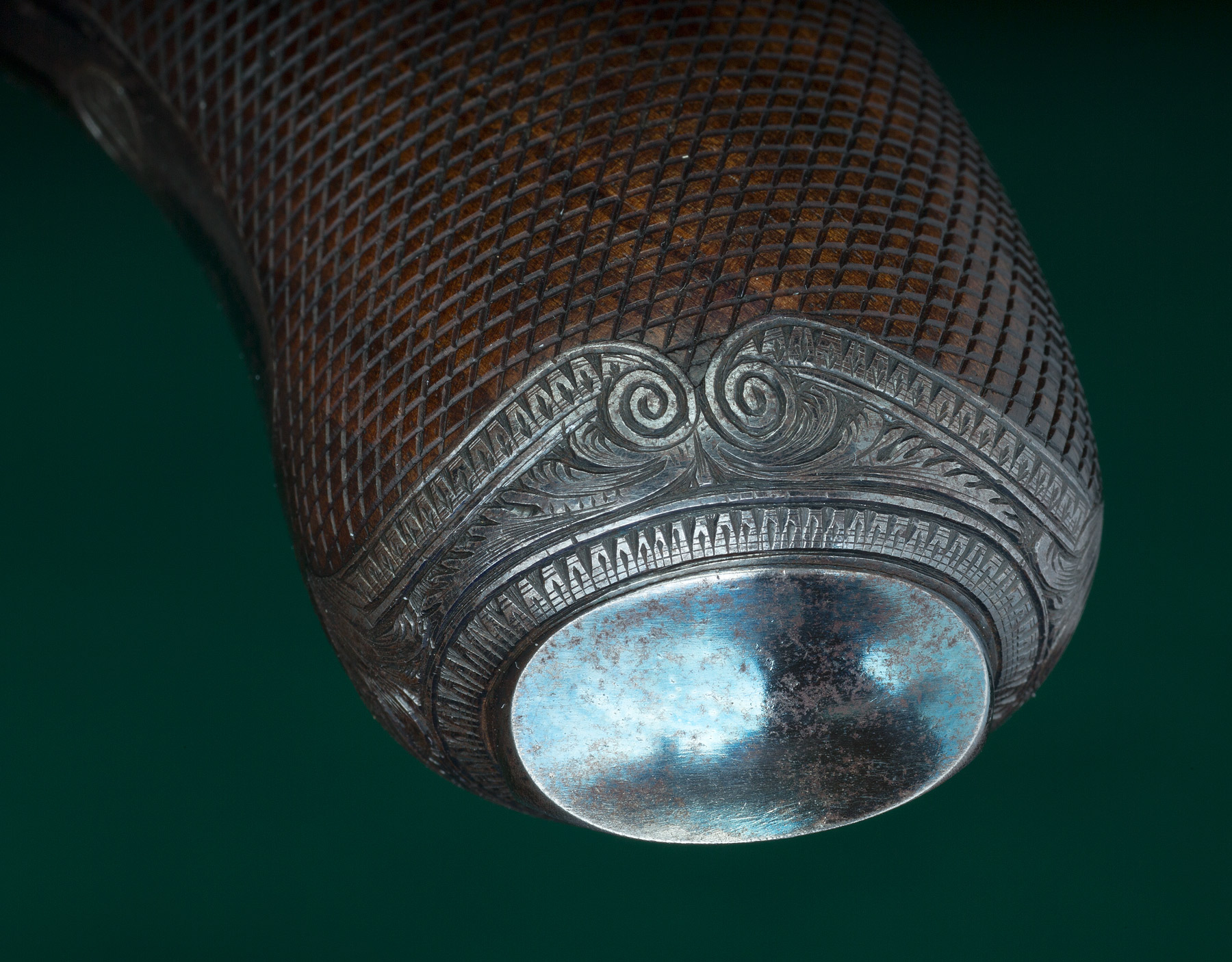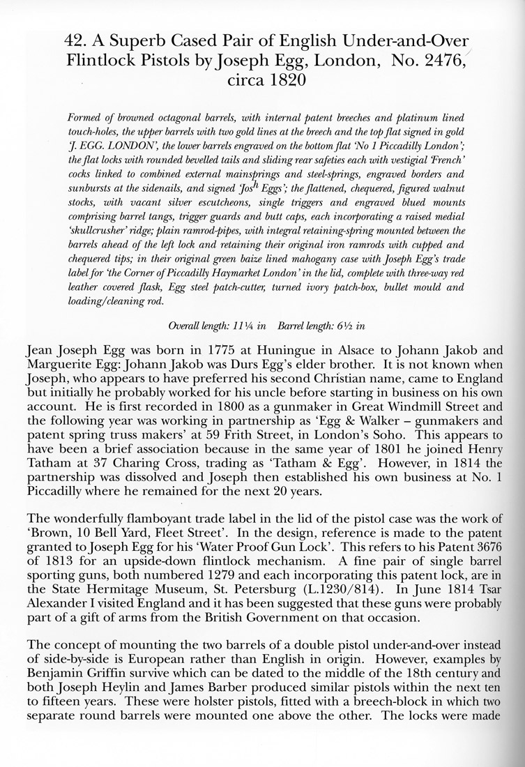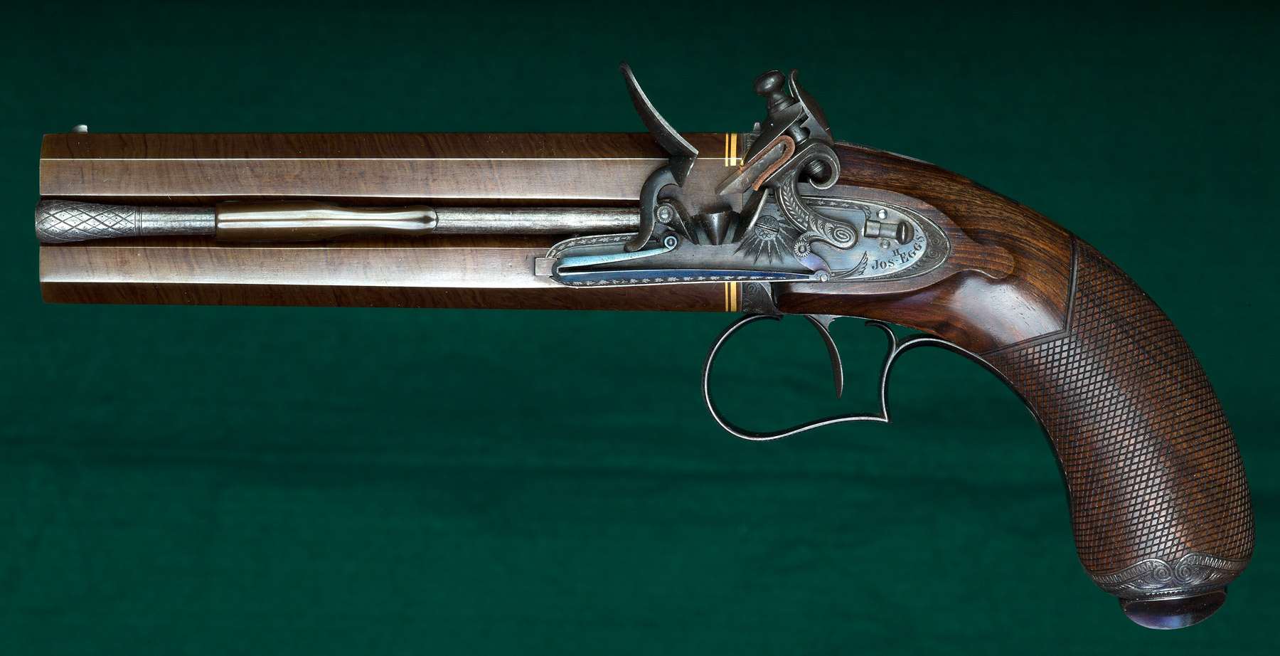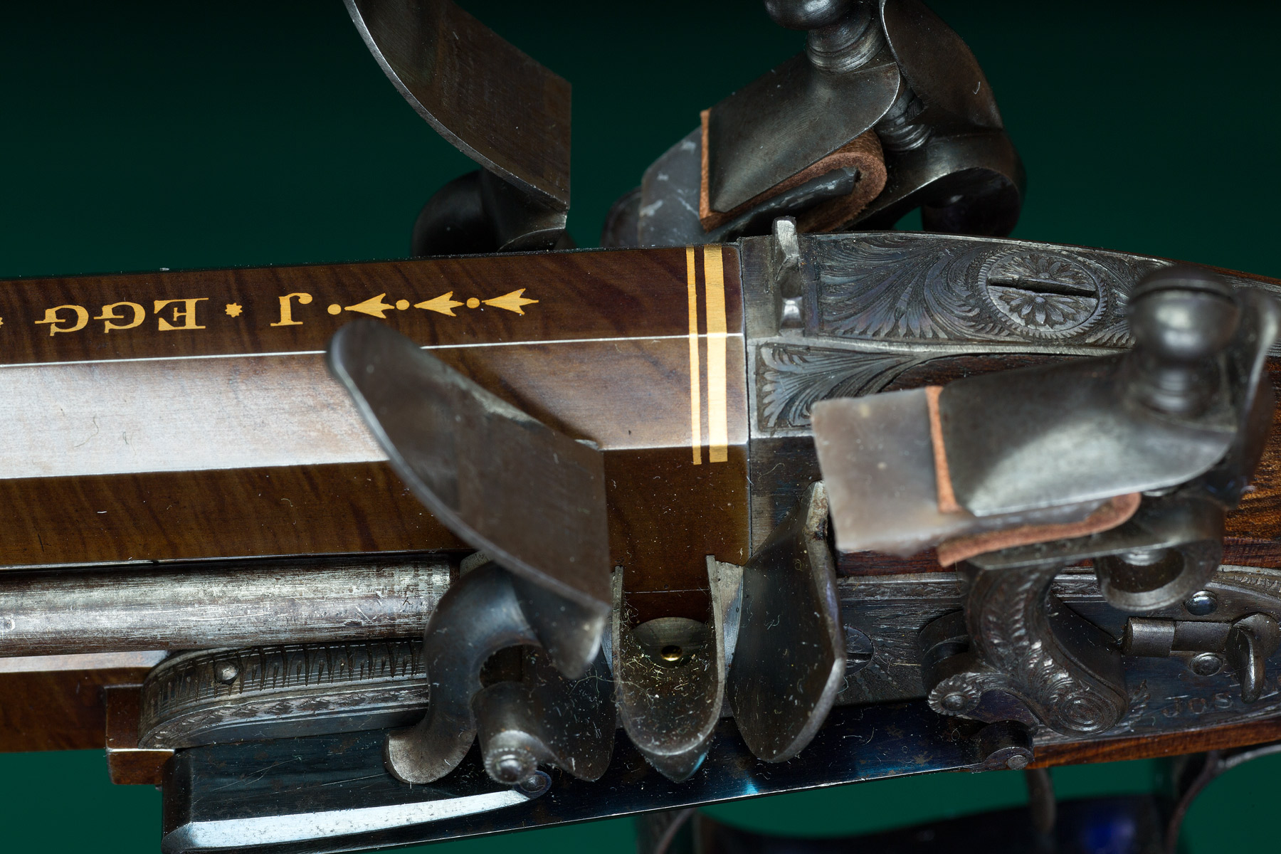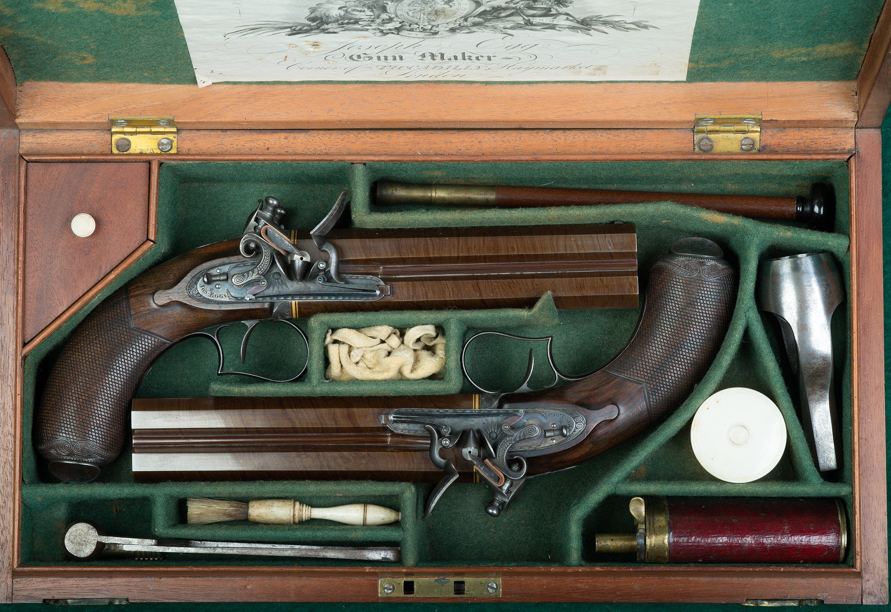 Description: 6 1/2 inch over & under octagon smoothbore barrels of browned damascus steel with fine blued steel front sight, maker's name inlaid in gold on top flat, address engraved in script on bottom flat, twin gold bands inlaid at breech and platinum touch holes. Steel ramrods attached with clip to groove between barrels on left side. Engraved casehardened standing breeches with integral notch sights. Engraved sidelocks with rainproof pans, fire-blued external mainsprings whose short leg, fitted with roller bearing, controls the frizzen and whose long leg, through a stirrup, powers the hammer. French cocks with half-cock safeties and manual sliding full-cock safeties. Single triggers fire the two actions in sequence. Locks laid out so thoughtfully that while parallel and symmetrical with respect to each other, the flashpans are subtly oriented so that one fires the top and the other the bottom barrels. Bag gripped stocks of figured walnut with skullsplitter buttcaps, flat-point checkering with mullered borders, teardrops, steel triggerguards and vacant silver escutcheons. Weight: 2lbs, 4oz, each. In sound, original, baize-lined mahogany case with vacant brass escutcheon and lift-ring, maker’s label bearing the royal warrant, red leather covered three-way flask, natural white patchbox, bone-handled brush, steel patch-cutter, combination ramrod/cleaning rod/worm, ball mould and two leather pouches containing balls and flints, respectively. Built ca 1820 at the apogee of the flintlock era. Extraordinary condition, with bright bores, strong traces of original casehardening colors on the locks, vivid fire-blue on mainsprings, most of the original blue on the triggerguard and buttcap, stocks with crisp checkering, almost all the original finish and barely a handling mark--- and with all the original accessories---after nearly 200 years.