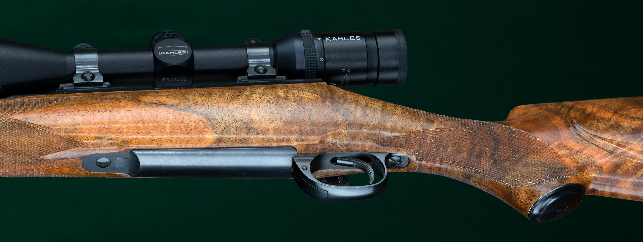 | | walnut stock with ebony forend tip, classic borderless point-pattern wrap- |