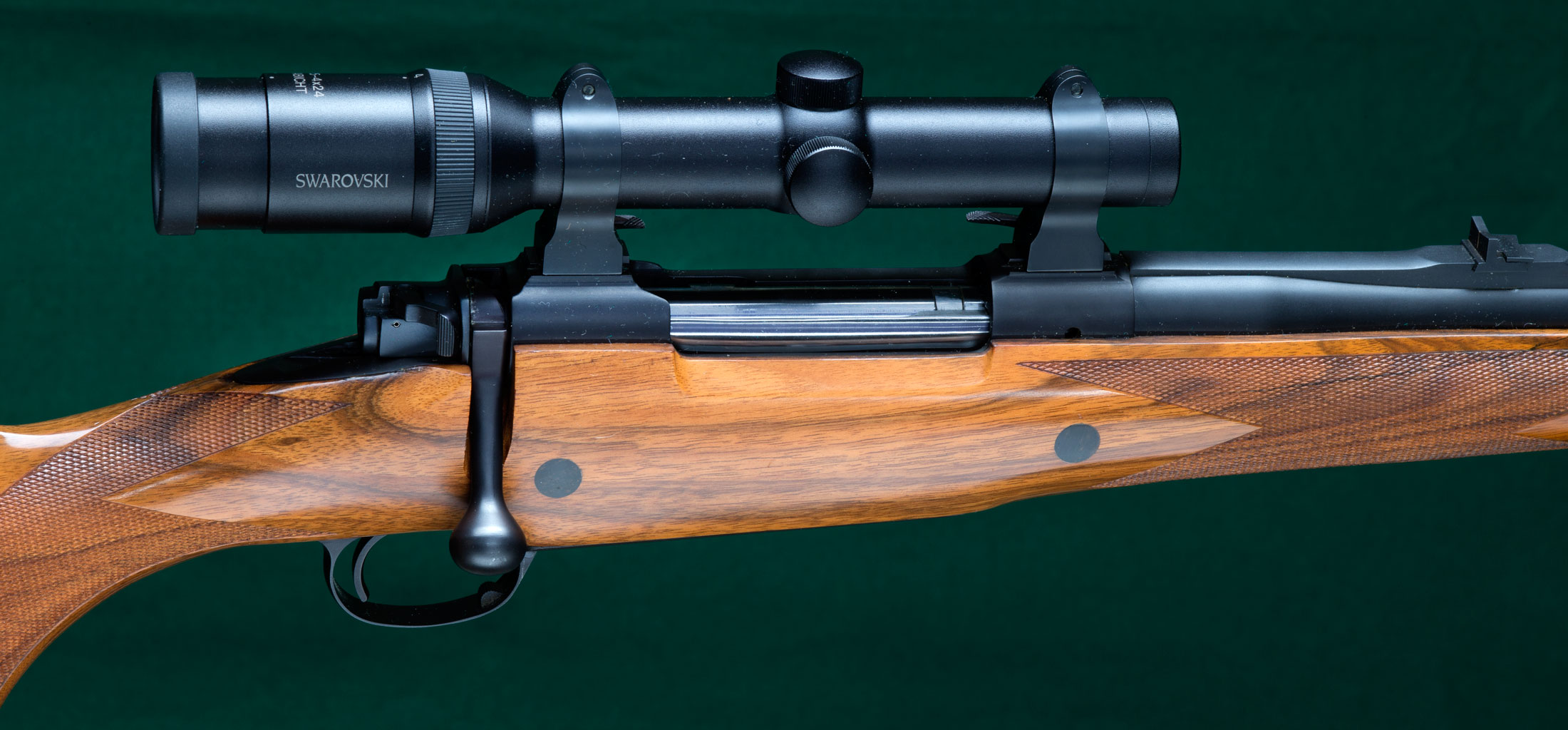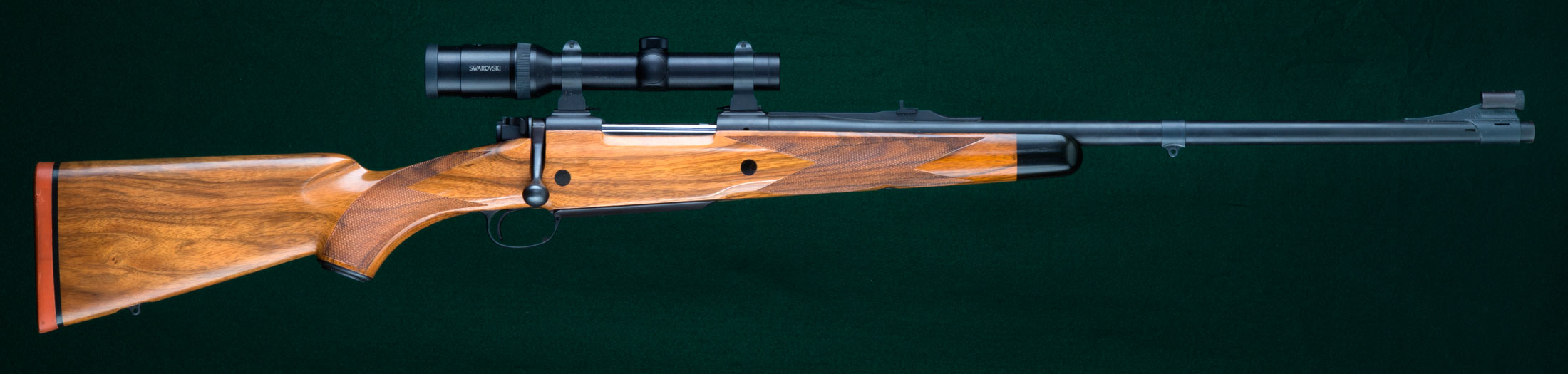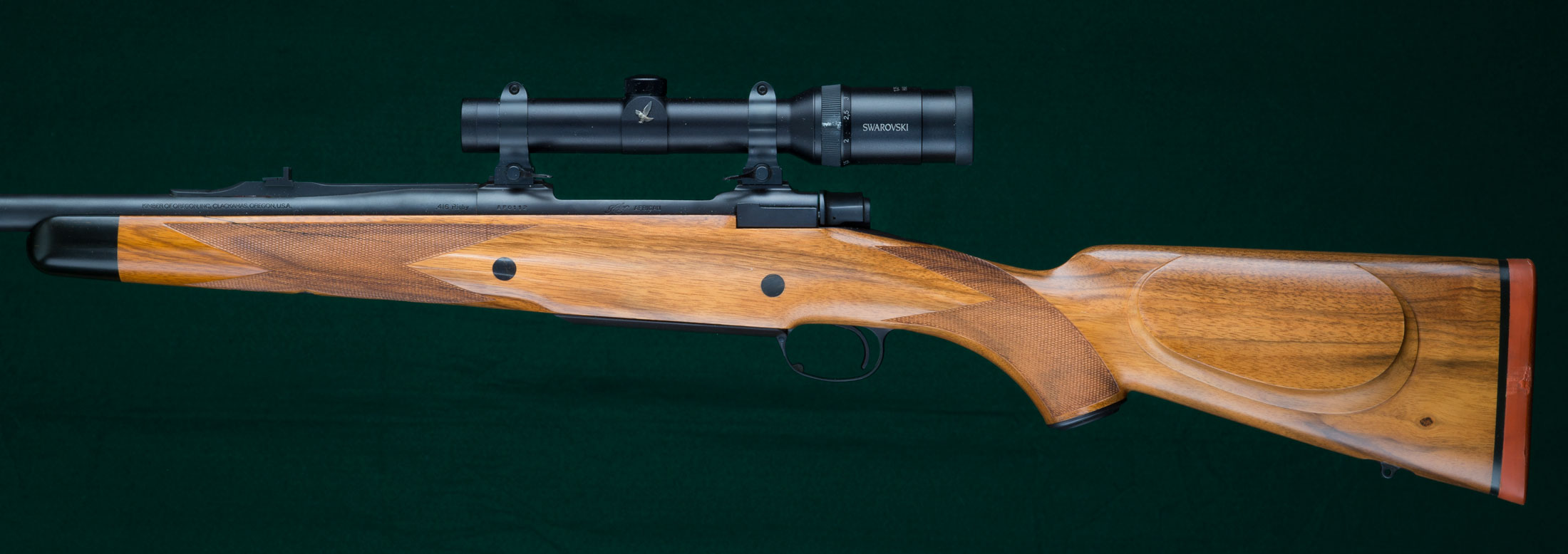 24" tapered round Magnaported barrel with hooded full-band front sight, full-band swivel base, and quarter rib with 1 standing and 1 folding express sight. Figured walnut stock with ebony forend tip, double ebony-plugged recoil crossbolts, steel trapdoor pistol grip cap containing spare front sight blade, classic borderless point-pattern checkering, beaded pancake cheekpiece, inletted rear swivel base and maker's solid red rubber recoil pad. Kimber magnum (Mauser) controlled-feed dovetailed double-squarebridge action with model 70-type safety, four round magazine and hinged straddle floorplate with release inside triggerguard. Swarovski matte-finish, 30mm diameter, 1.25-4x24 scope with bold 4A duplex reticle on Kimber quick-detachable mounts fitted directly to receiver dovetails without separate bases. Pull: 14 1/8". Weight: 9lbs, 14oz. The original Kimber, built in Clackamas, Oregon. 99%+blue. $5995.