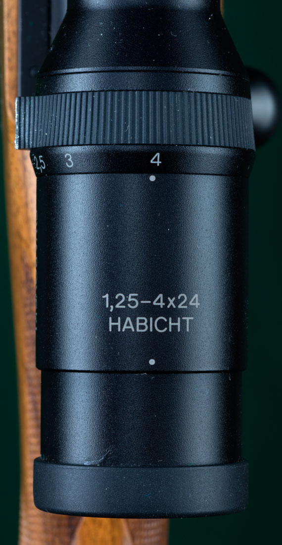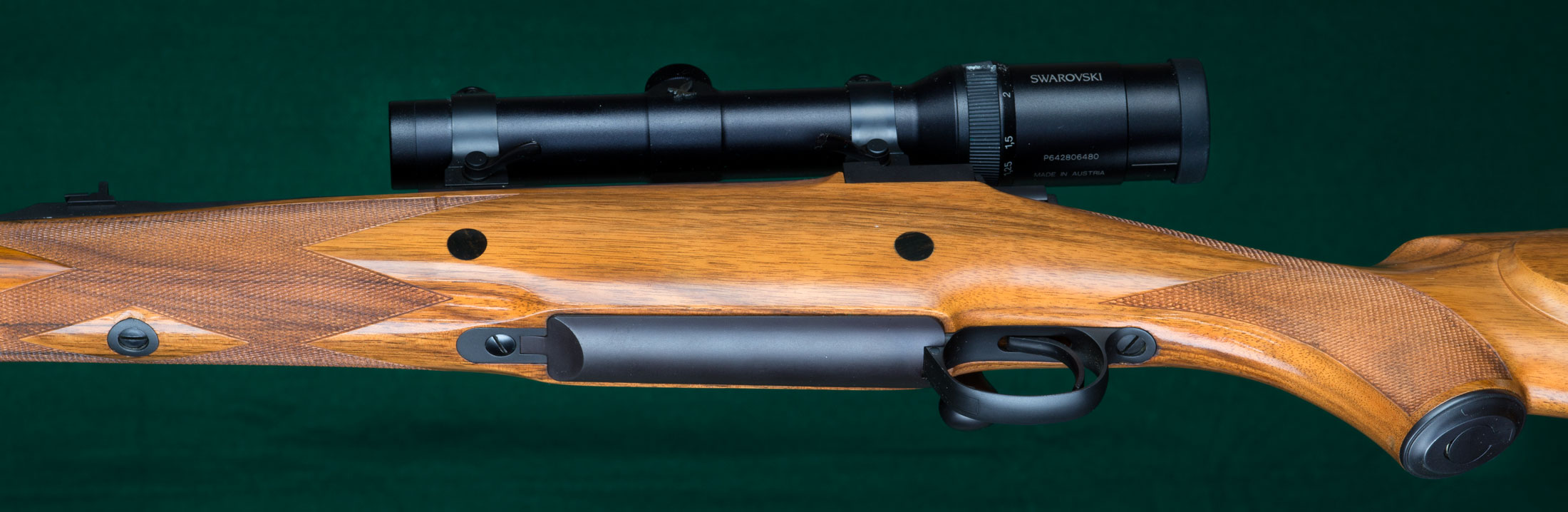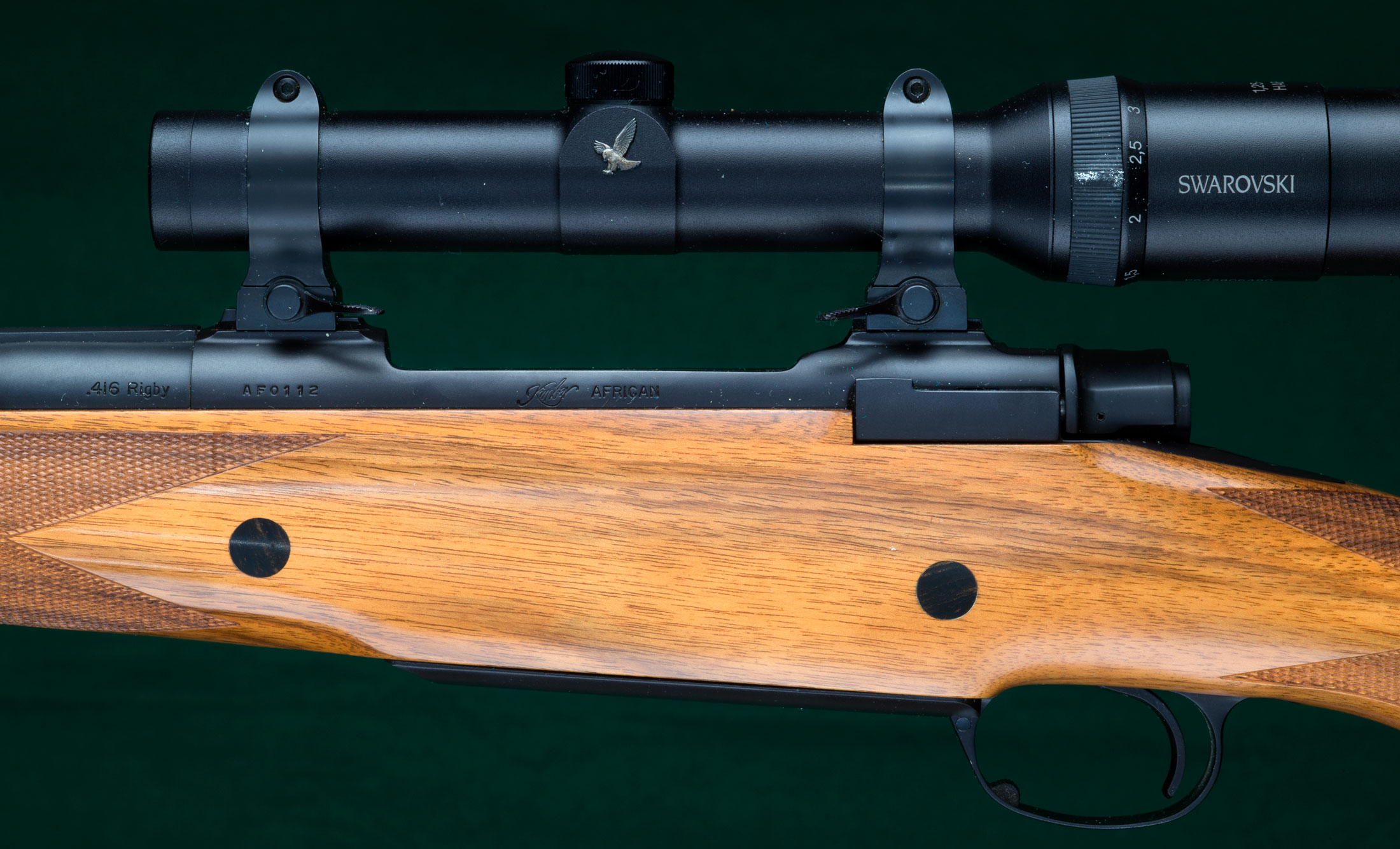 24" tapered round Magnaported barrel with hooded full-band front sight, full-band swivel base, and quarter rib with 1 standing and 1 folding express sight. Figured walnut stock with ebony forend tip, double ebony-plugged recoil crossbolts, steel trapdoor pistol grip cap containing spare front sight blade, classic borderless point-pattern checkering, beaded pancake cheekpiece, inletted rear swivel base and maker's solid red rubber recoil pad. Kimber magnum (Mauser) controlled-feed dovetailed double-squarebridge action with model 70-type safety, four round magazine and hinged straddle floorplate with release inside triggerguard. Swarovski matte-finish, 30mm diameter, 1.25-4x24 scope with bold 4A duplex reticle on Kimber quick-detachable mounts fitted directly to receiver dovetails without separate bases. Pull: 14 1/8". Weight: 9lbs, 14oz. The original Kimber, built in Clackamas, Oregon. 99%+blue. $5995.