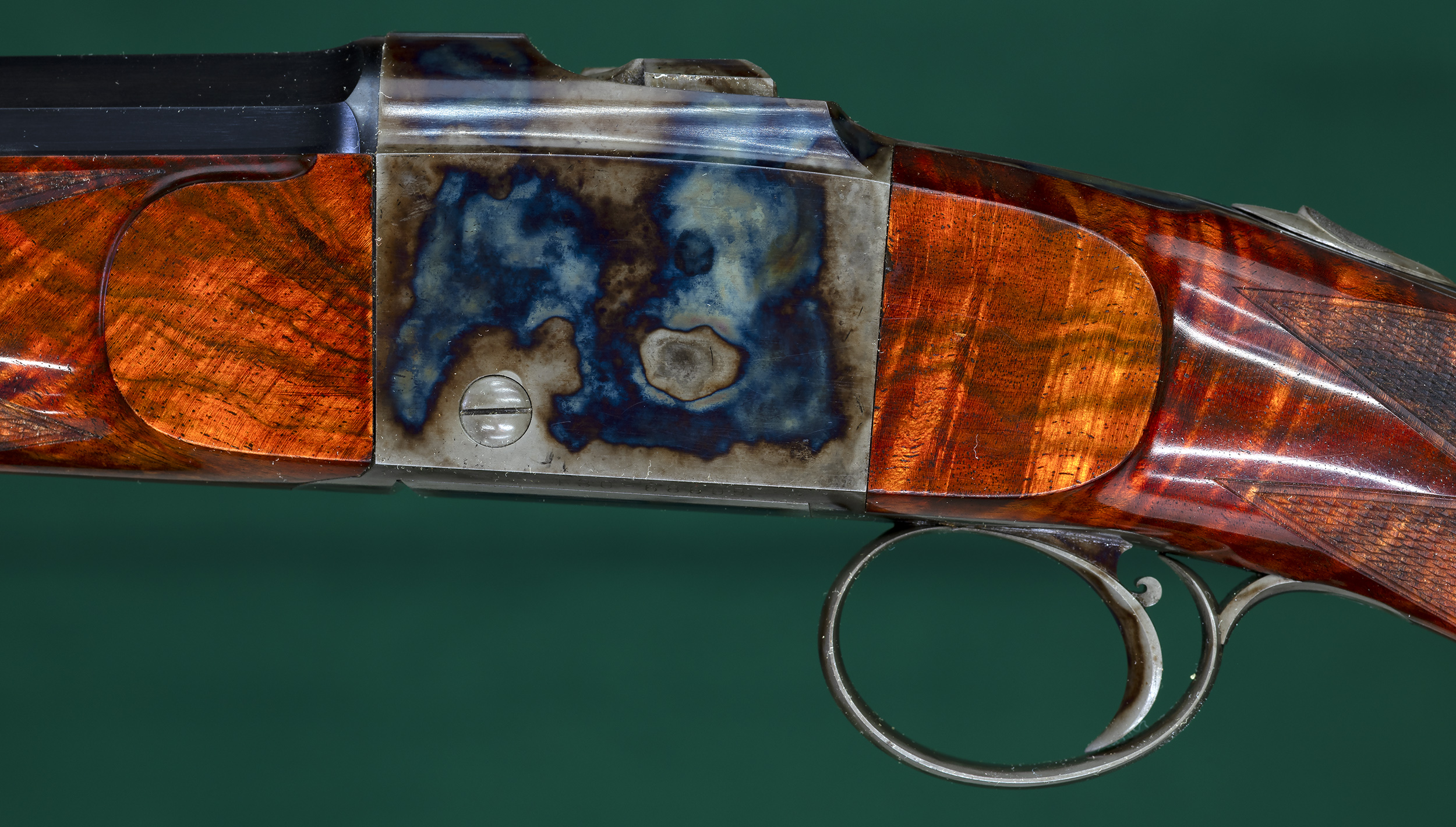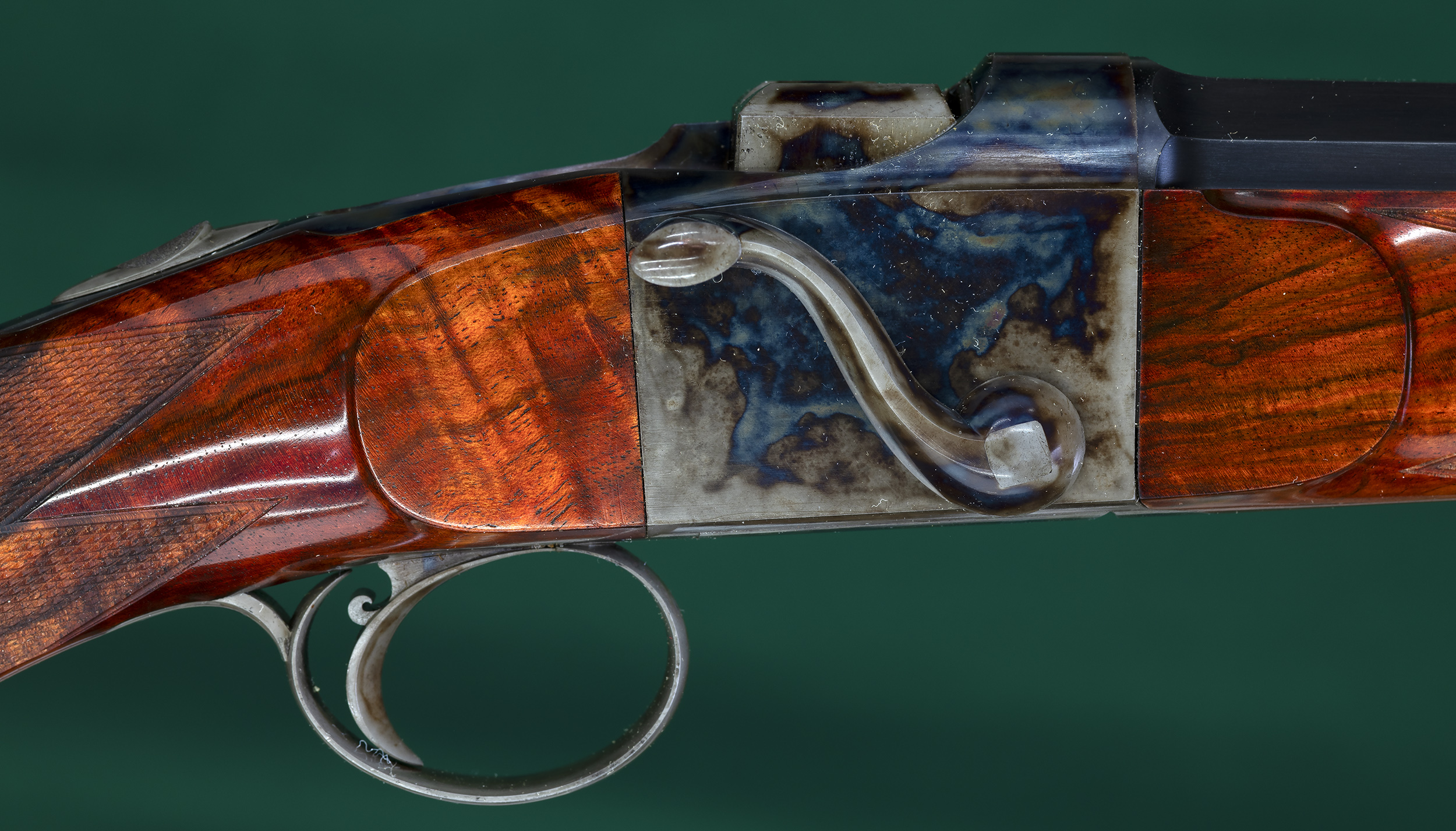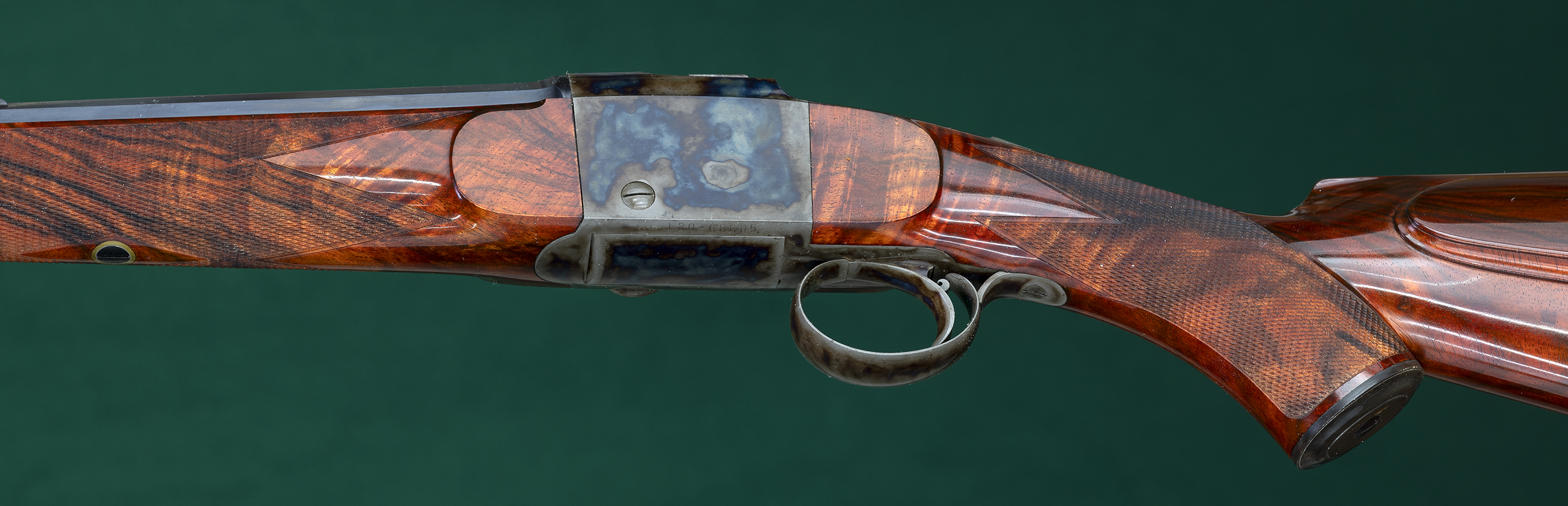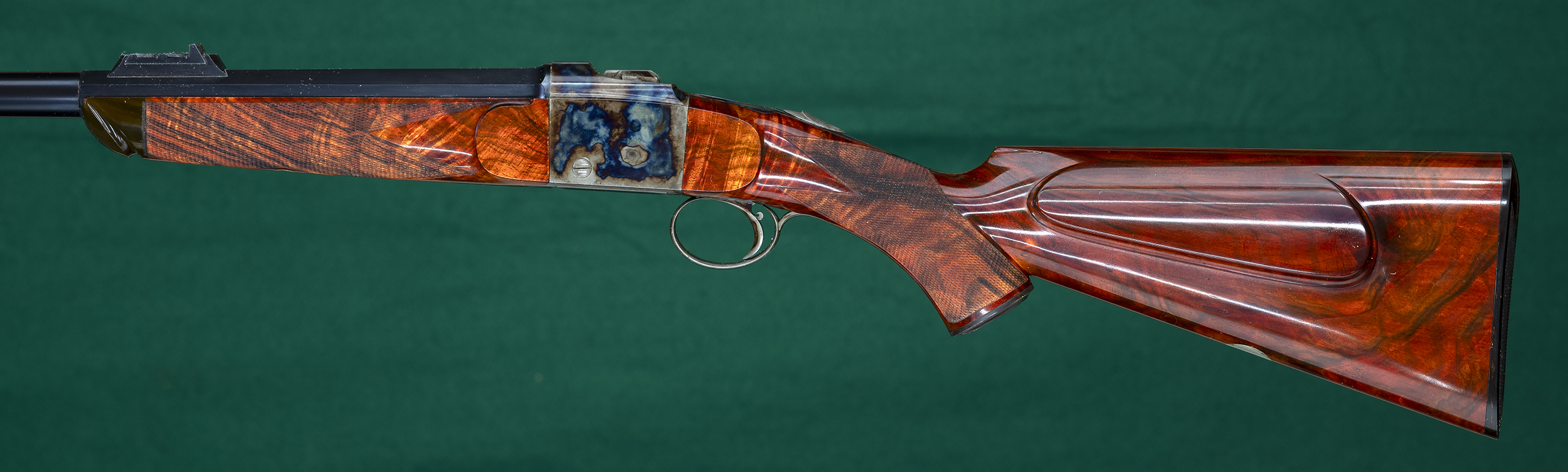 | walnut stocks by James Corpe with horn Alex Henry forend, flat sidepanels, |
