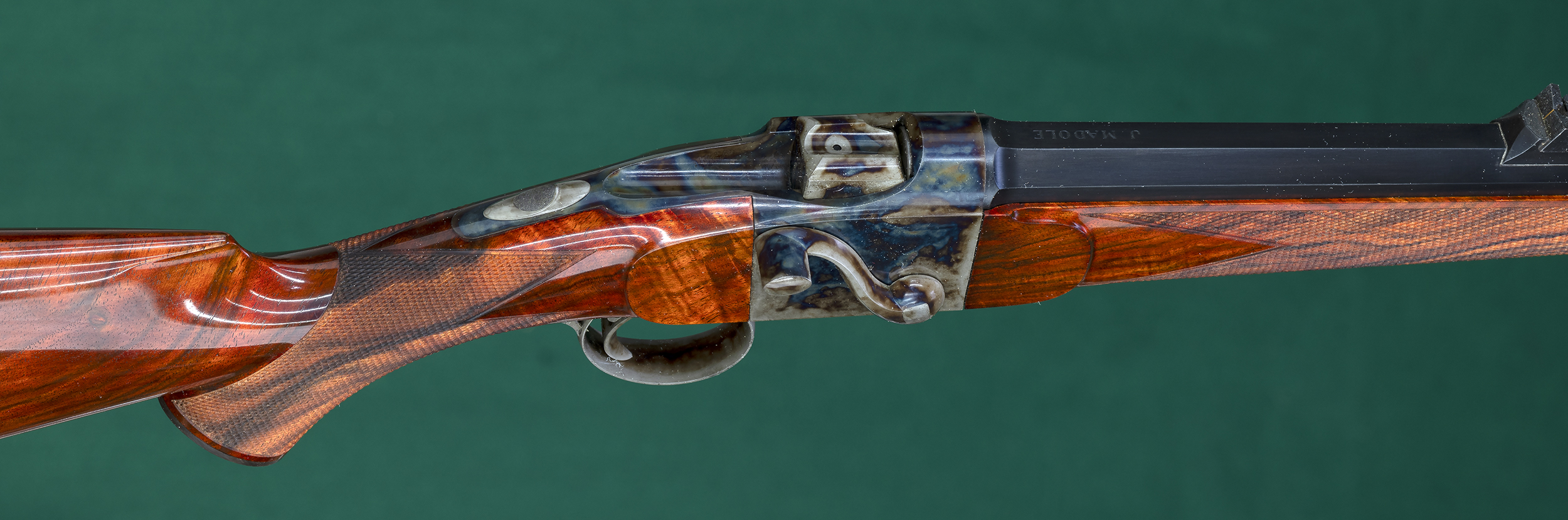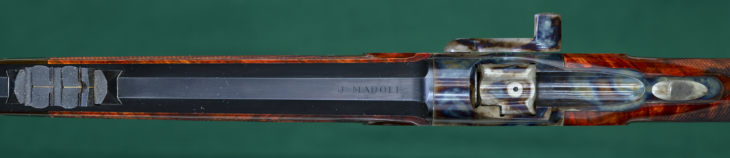 | custom hand-checkered non-rattling safety. Engraved J. Madole on barrel |