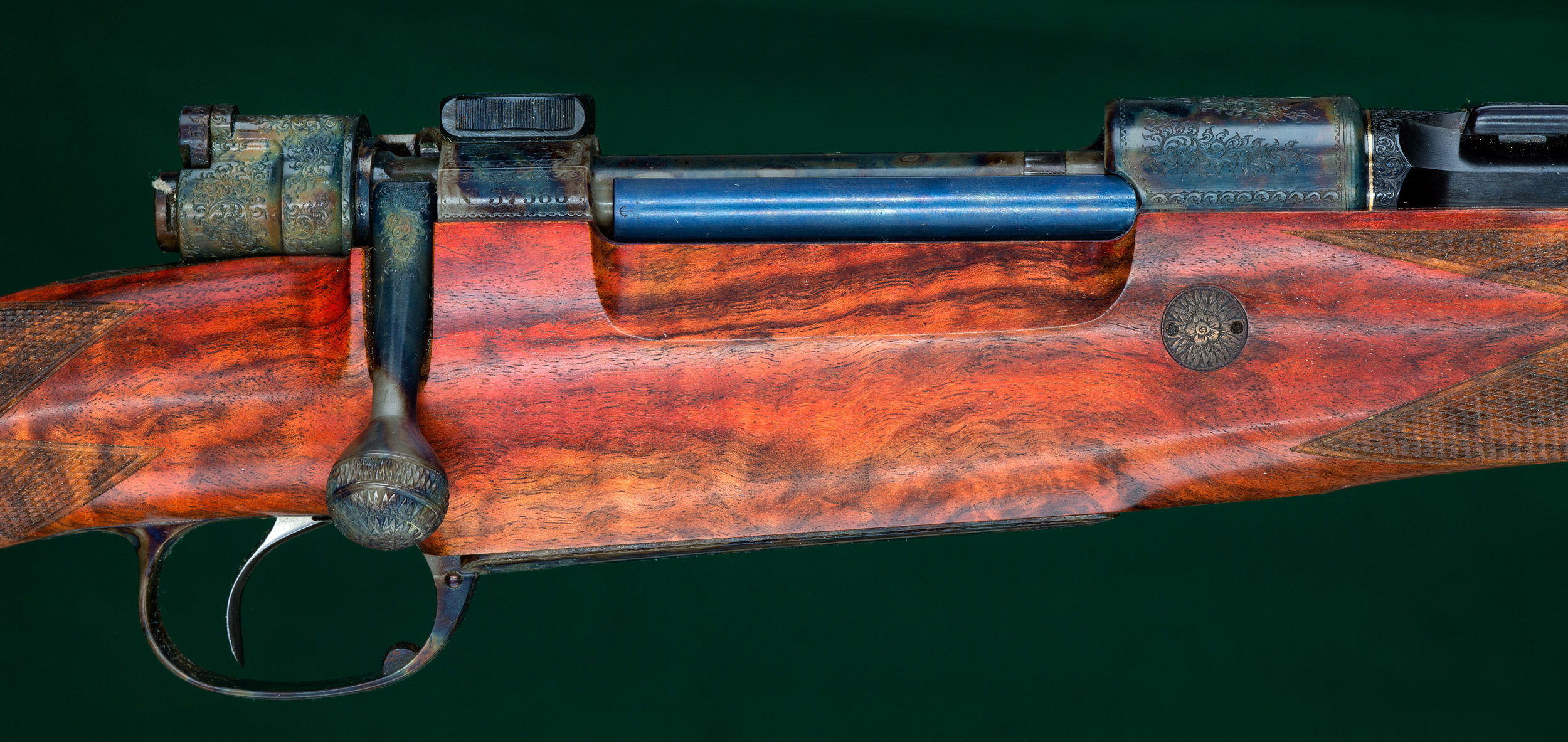 | | recoil pad. Casehardened, pillar-bedded Mauser 98 action with fire-blued |