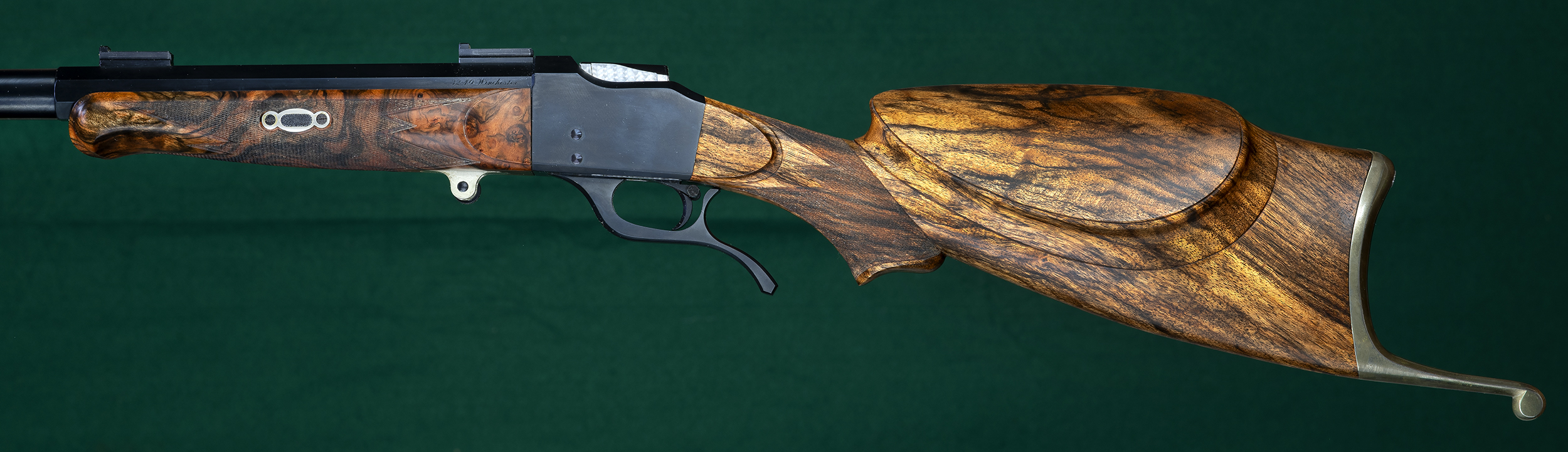 | | and rear, S-curve pistol grip, raised, double-beaded Scheutzen cheekpiece, |