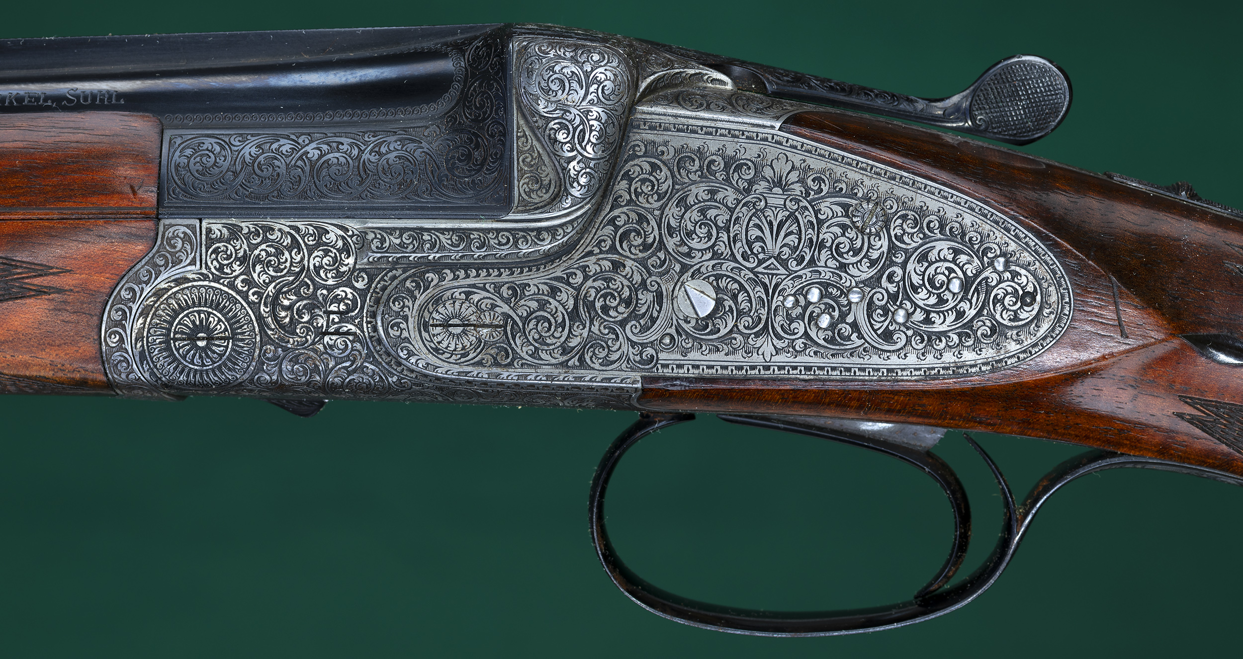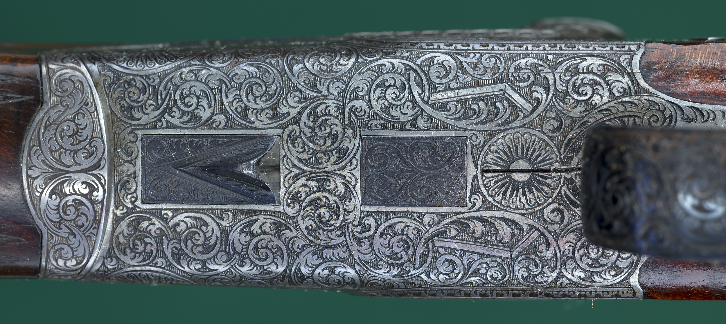 | | Deeley-release three-piece forend, point-pattern checkering, small horn |
