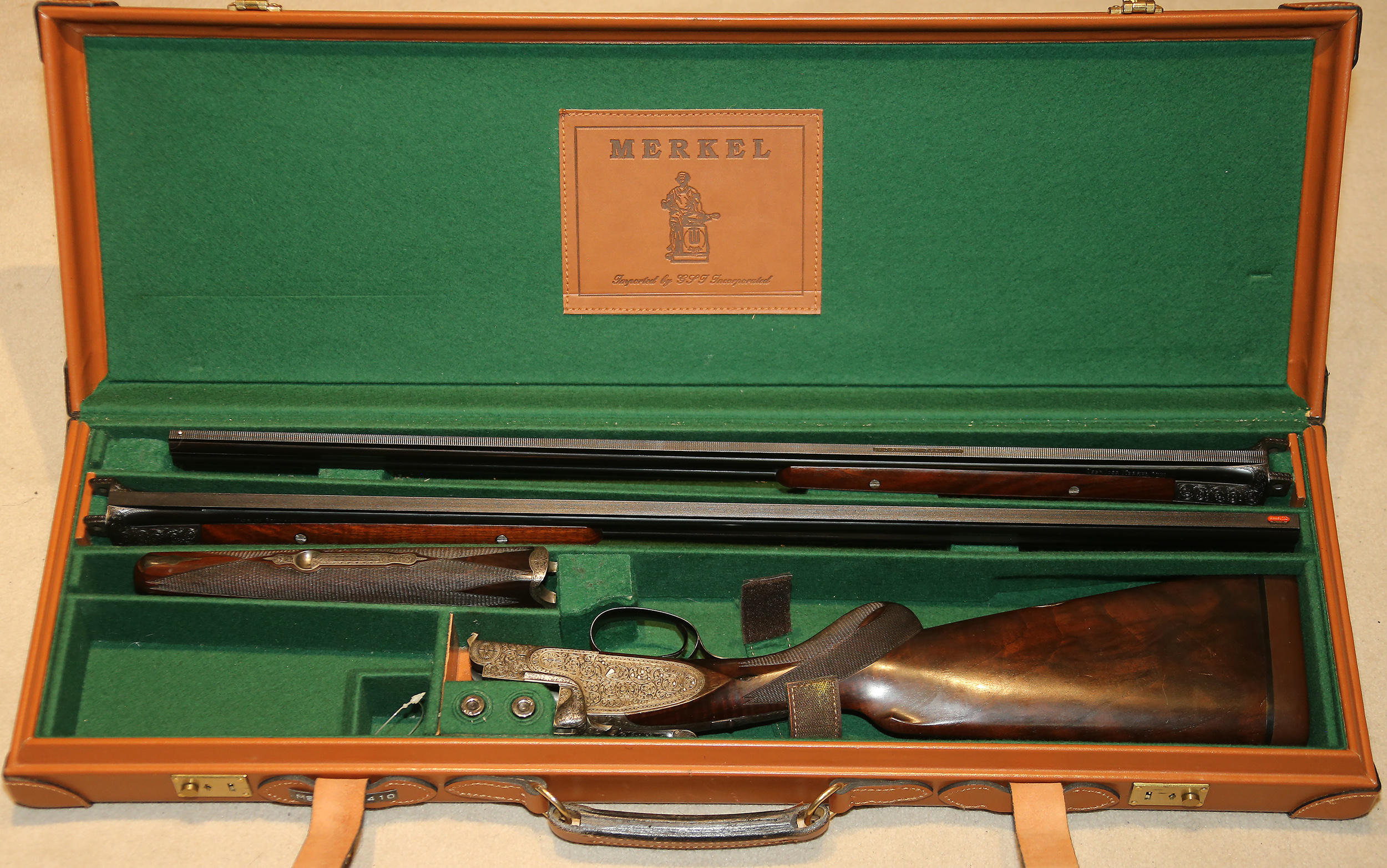 | | leather-covered trunk case with Merkel label and a pair of .410 snap caps. $14,875. |
