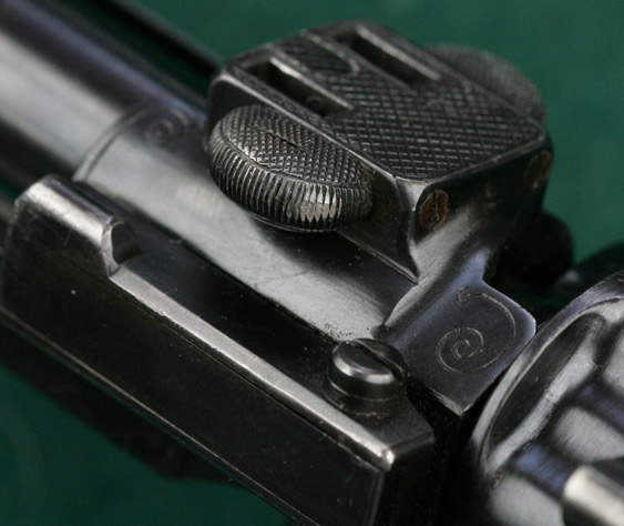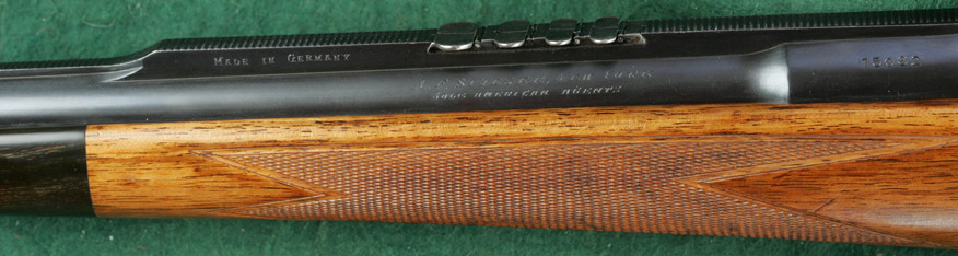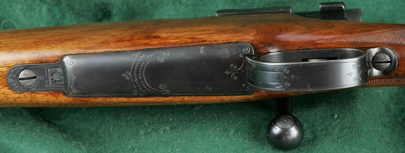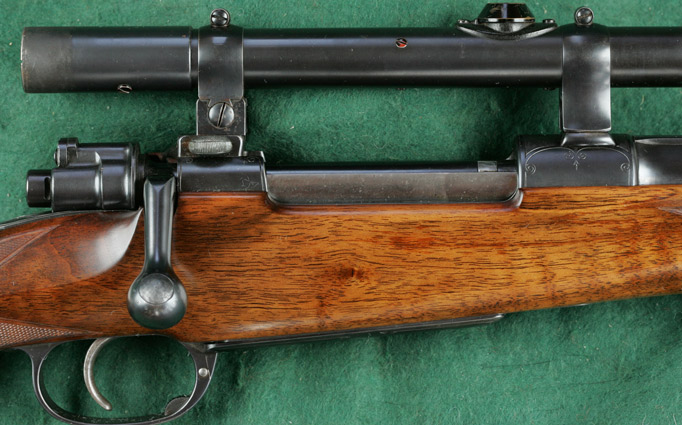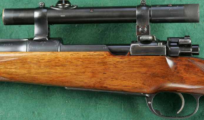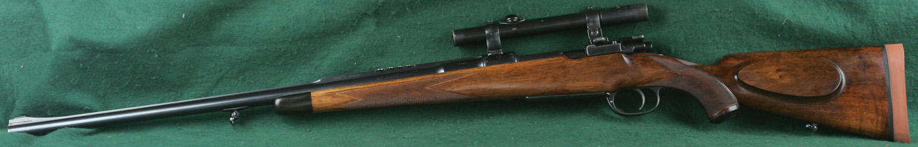 25" barrel with full, matted, integral rib, raised quarter rib and four folding express sights. Figured walnut stock with beaded pancake cheekpiece, ebony forend tip and English-mullered-border classic point-pattern checkering. Magnum Mauser squarebridge action with hinged straddle floorplate, border engraving and lightly checkered bolt knob. Crown/BUG commercial proofs. Zeiss Zeilklein 2 1/4x scope adjustable for elevation, with No.1 post and opposing horizontal bars reticle, on quick-detachable tunnel claw mounts, the rear ring incorporating windage adjustment and the rear mount being incorporated integrally within the rear squarebridge. 13 7/16"pull to new Silvers pad. Weight: 9lbs, 2oz. Built 1926. Stoeger import. 99%blue. Excellent bore. $7450.