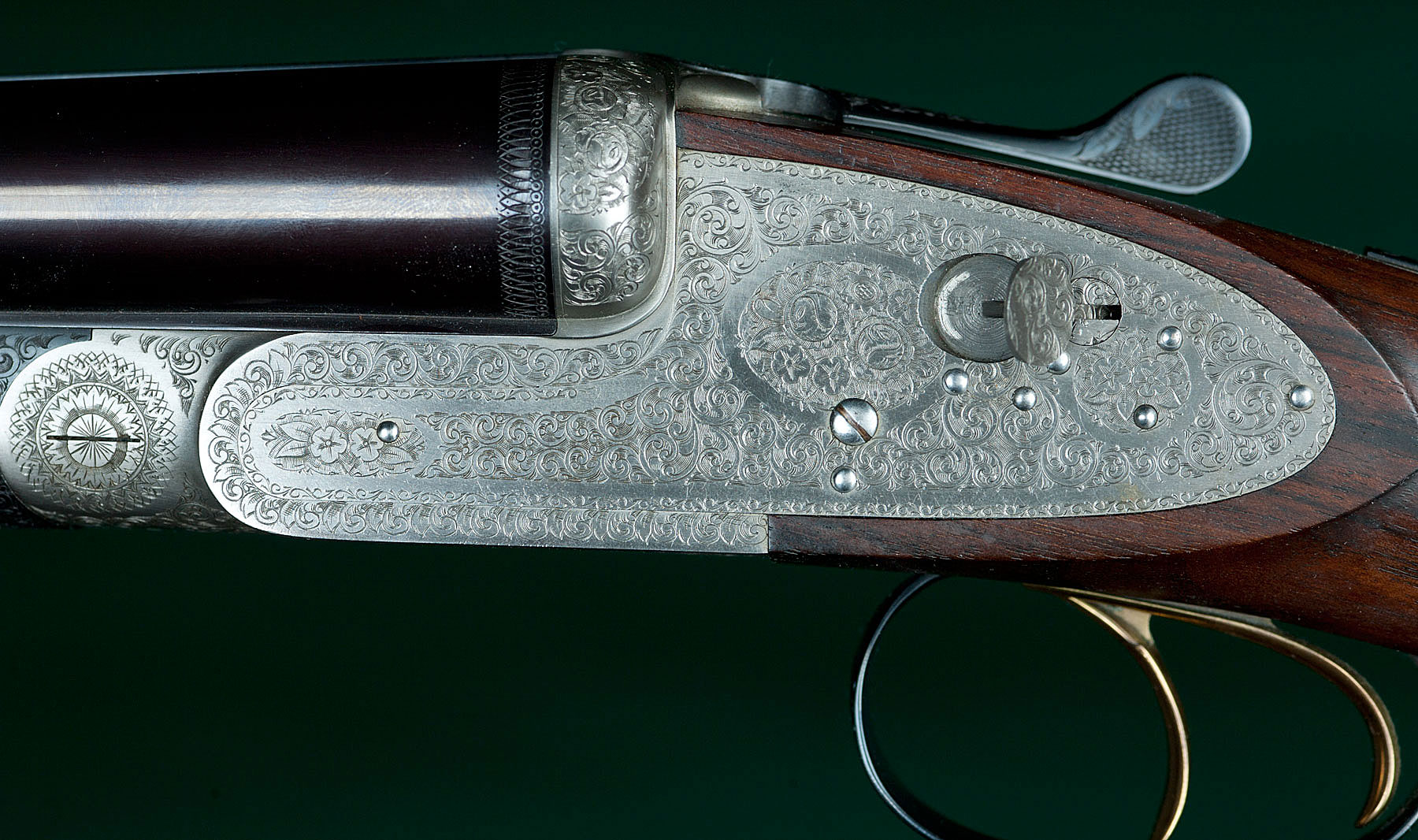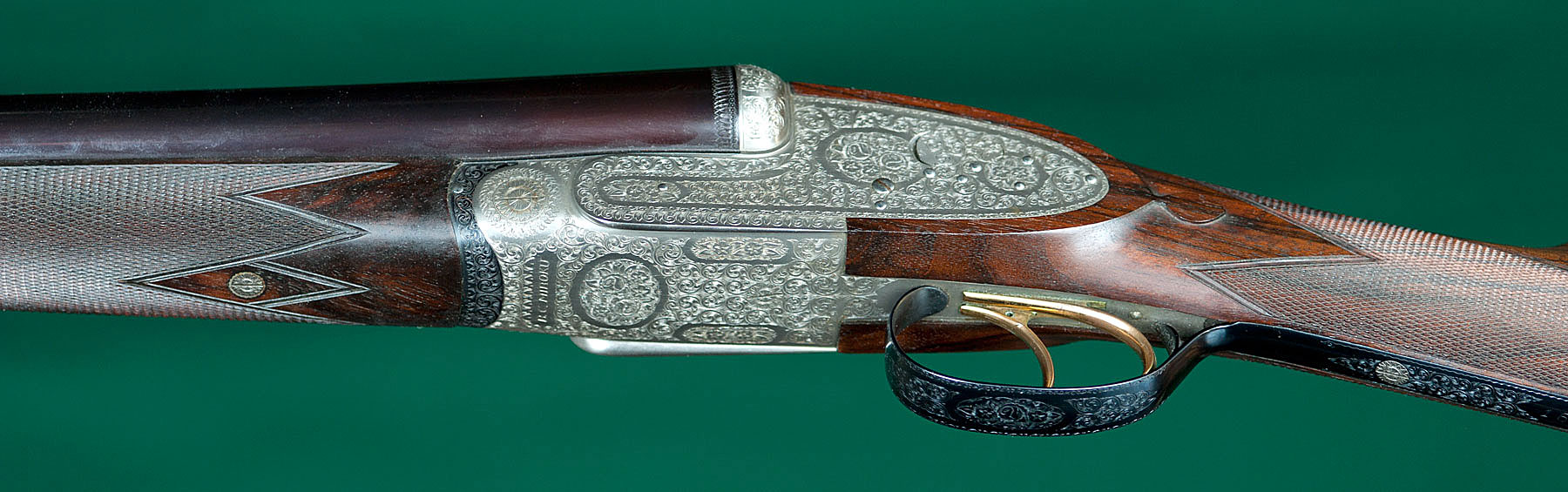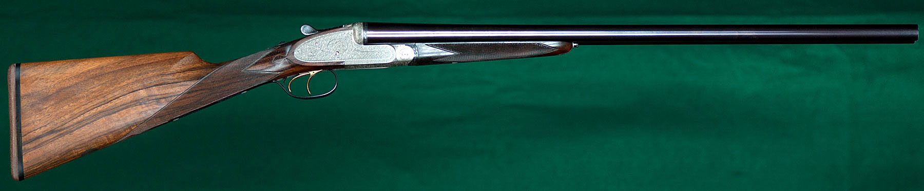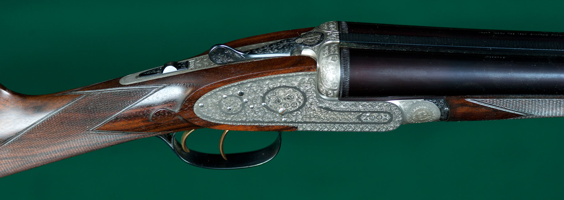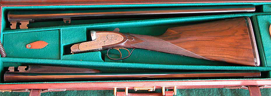 Two sets of 26" SxS chopper-lump barrels with flat matted ribs choked skeet / modified and modified / full, 14 1/8" length of pull from gold-washed articulated front trigger to a thin brown Old English pad, 1 5/8" - 2 1/16"drop, 3/8" cast-on. Figured walnut stock with straight English grip, Anson pushbutton-release splinter forend, teardrops and vacant silver oval. Fully rose & scroll engraved, coin-finished receiver with concealed-release, hand-detachable sidelocks, automatic safety, cocking indicators and jeweled watertable. Weight: 7lbs. Japanese. As new, with original box. In leather trunk case. $5975.