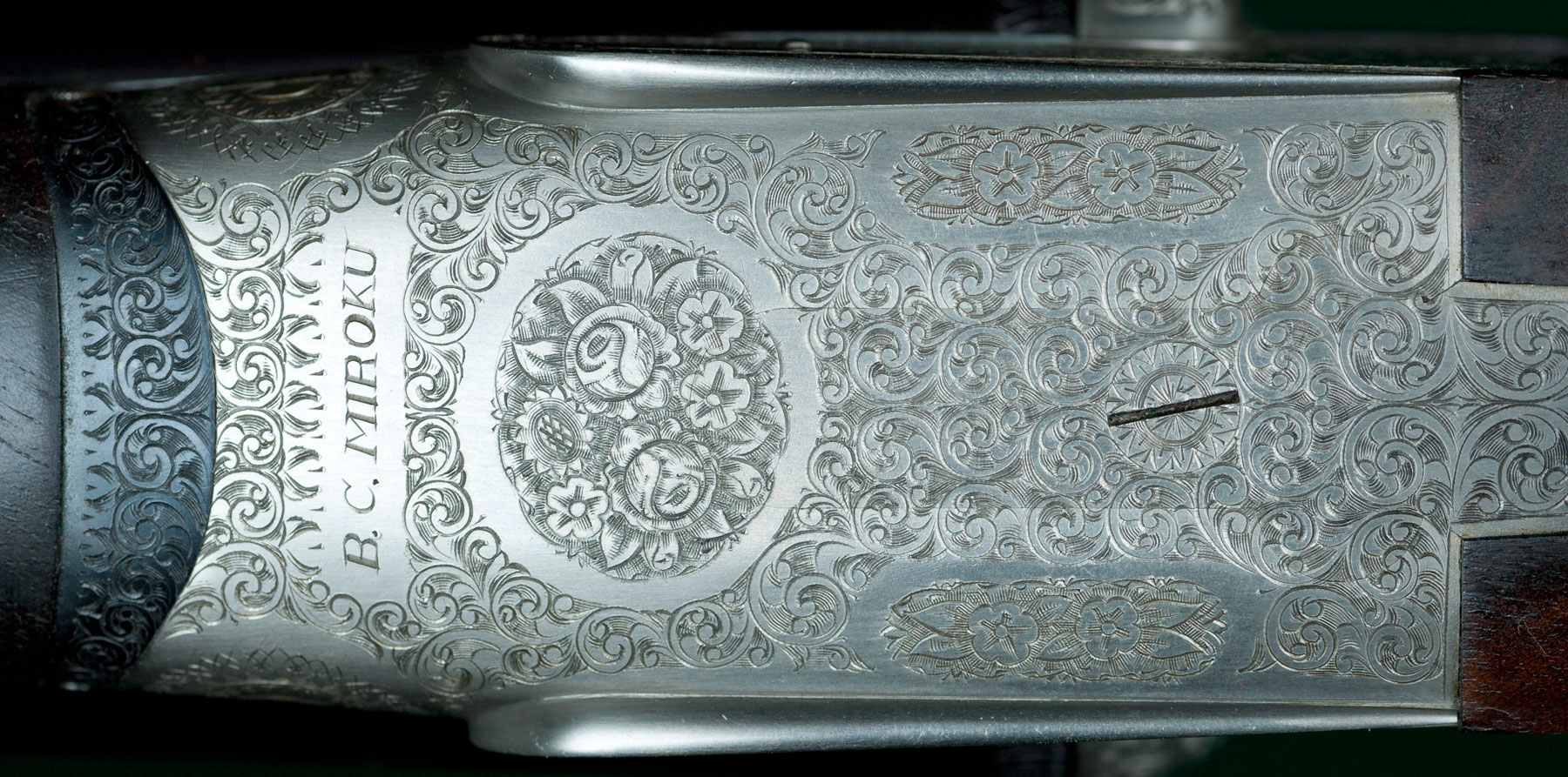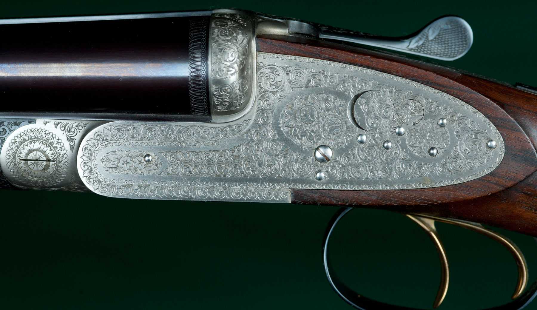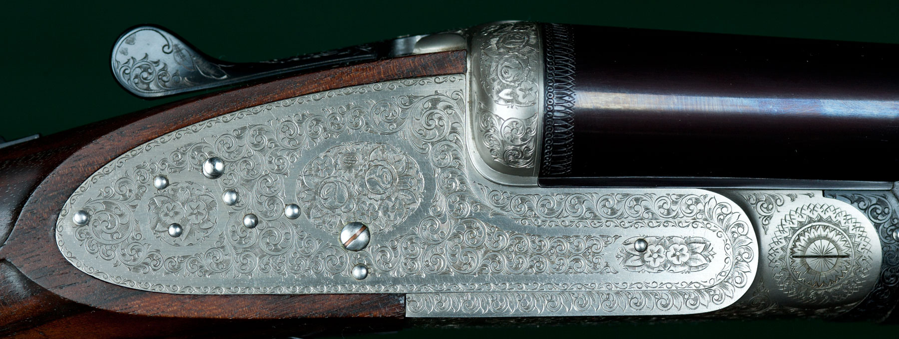 Two sets of 26" SxS chopper-lump barrels with flat matted ribs choked skeet / modified and modified / full, 14 1/8" length of pull from gold-washed articulated front trigger to a thin brown Old English pad, 1 5/8" - 2 1/16"drop, 3/8" cast-on. Figured walnut stock with straight English grip, Anson pushbutton-release splinter forend, teardrops and vacant silver oval. Fully rose & scroll engraved, coin-finished receiver with concealed-release, hand-detachable sidelocks, automatic safety, cocking indicators and jeweled watertable. Weight: 7lbs. Japanese. As new, with original box. In leather trunk case. $5975.